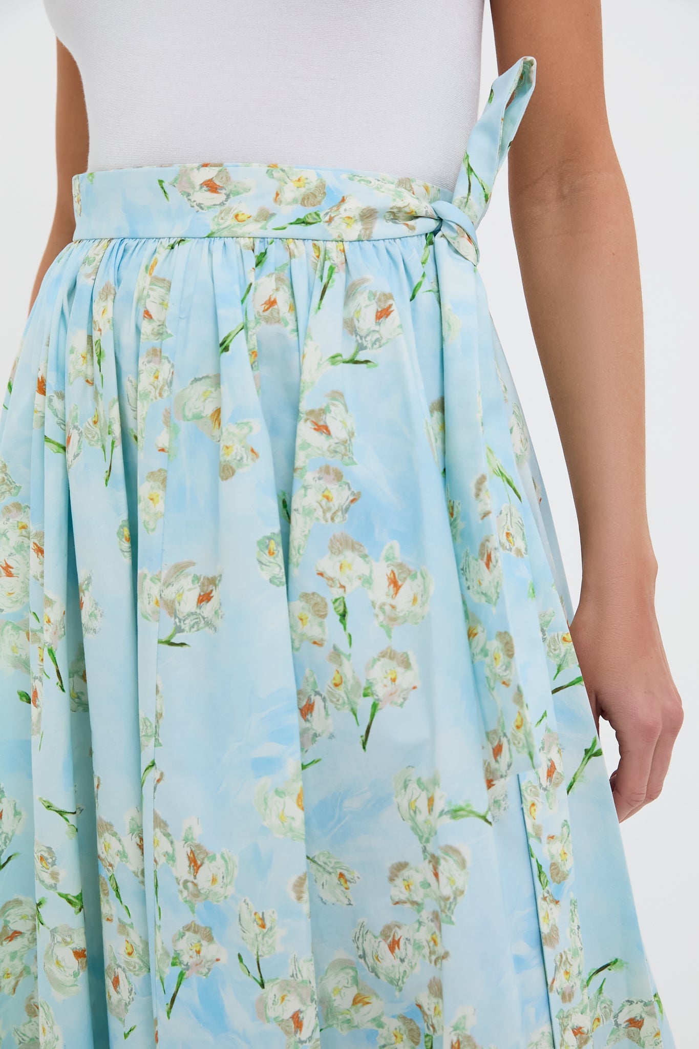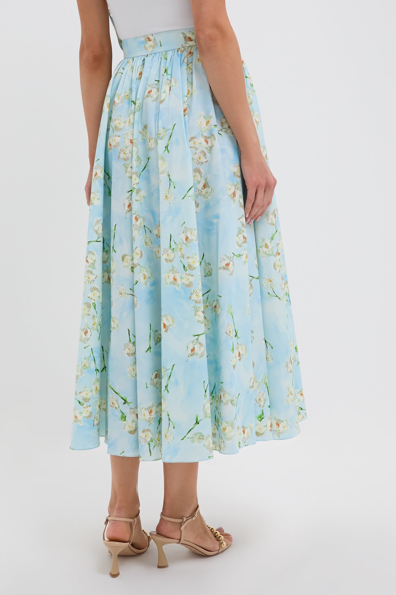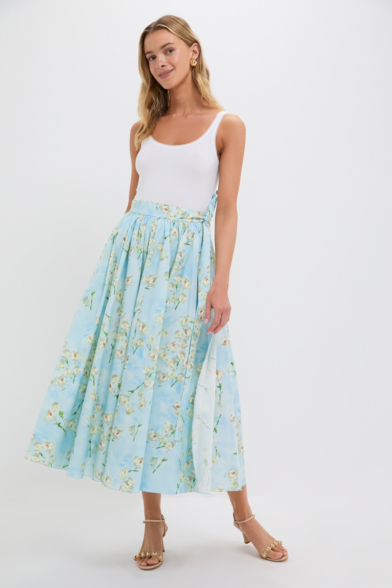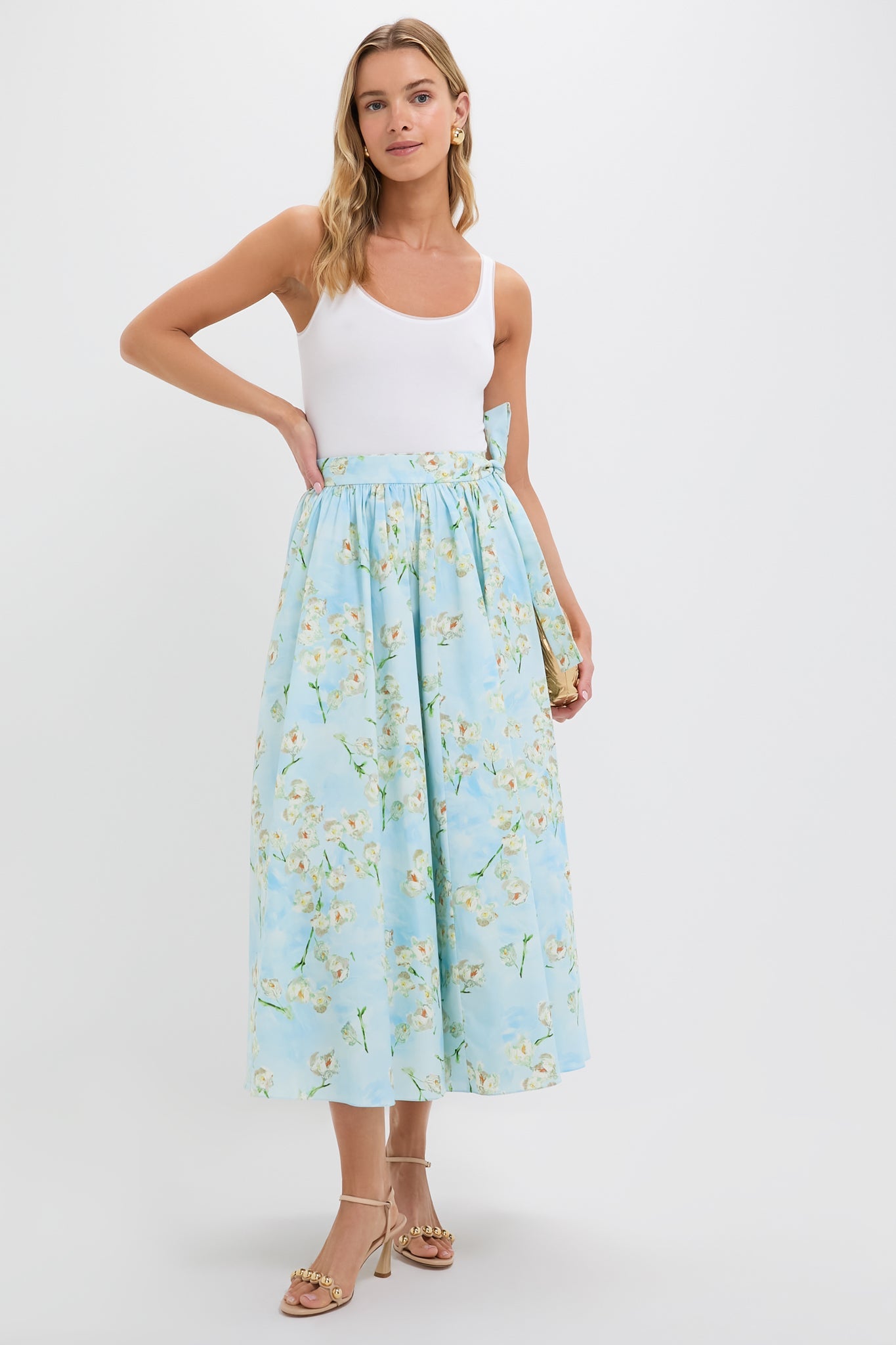 The Little Lillies on Blue Evelyna Midi Skirt is softly pleated to create a voluminous effect. Printed in a painterly lily motif, this floral skirt is fitted to a high-waistband and falls to ankle length. We styled it with a white top, heels, and a clutch for an elegant look perfect for garden parties, showers, and other springtime celebratory occasion!
