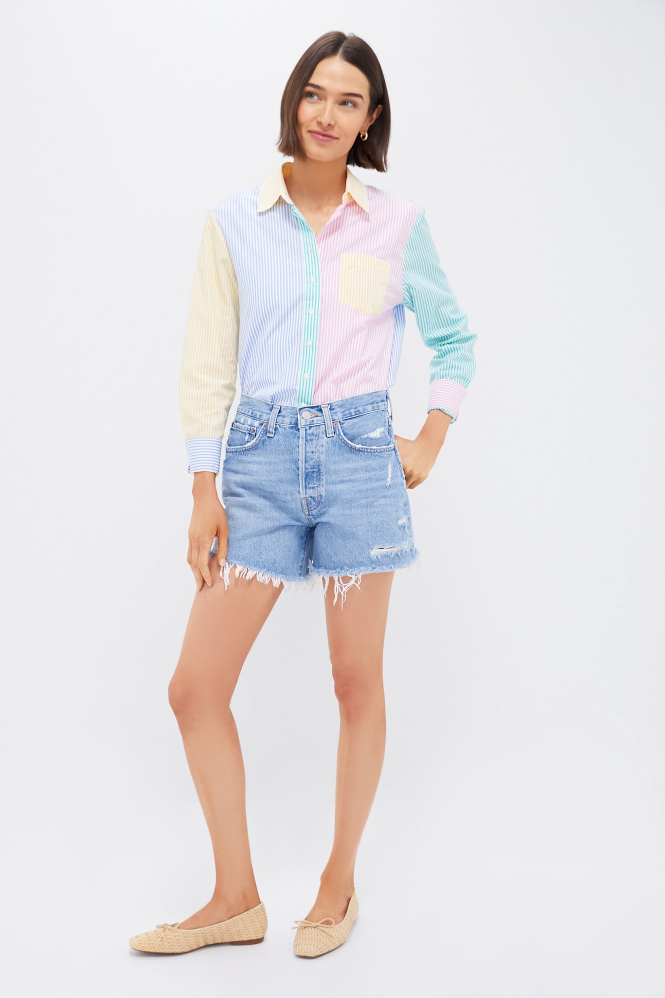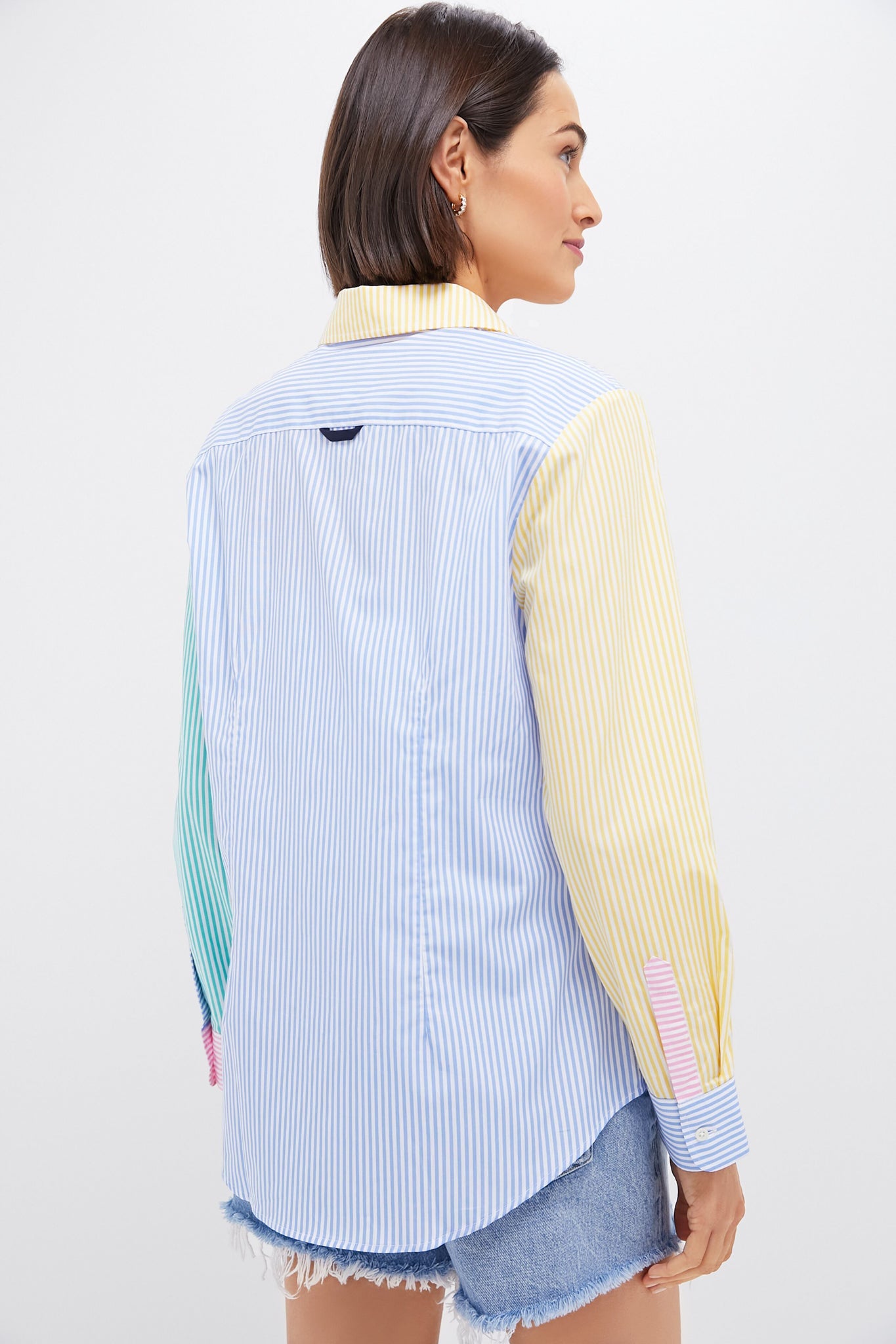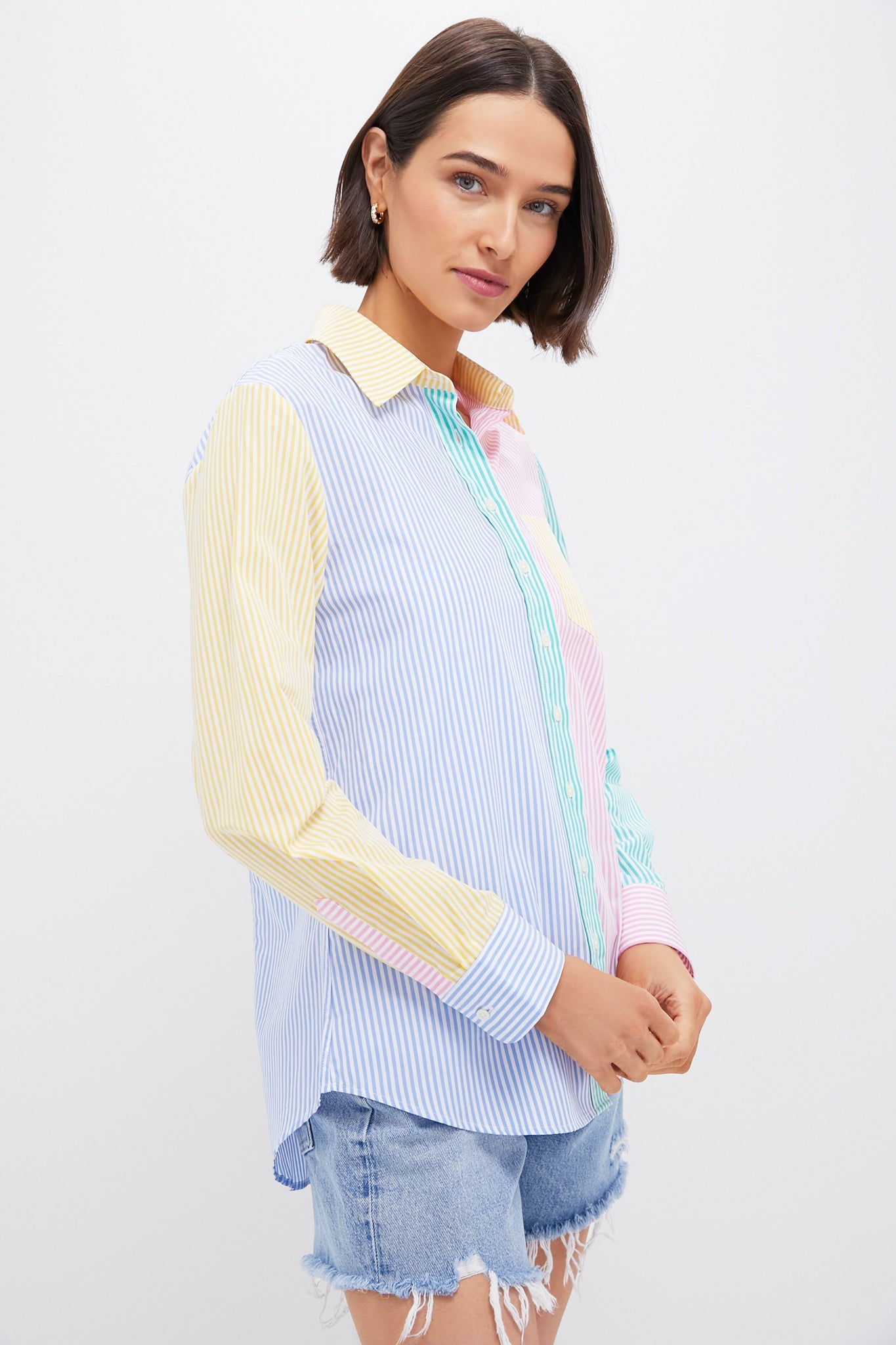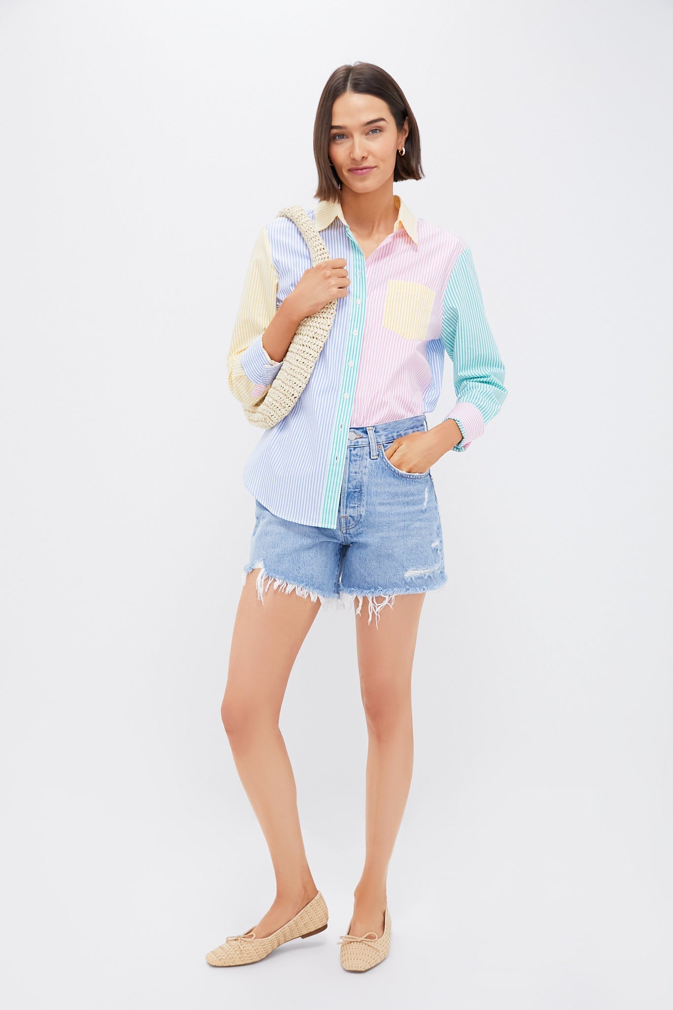 The perfect fitting boyfriend silhouette, updated with patchwork pops of color, we are obsessed with the Multi Stripe Boyfriend Shirt. Classic in style, but with a modern touch, this relaxed fit top is slightly oversized for that "I stole his shirt" look and features multiple different stripe patterns for a bit of extra fun. Wear it with the sleeves scrunched up, unbuttoned over a tee, tucked in or out — this timeless style can be worn any number of ways. Pair with denim for easy Saturdays spent over lattes or with trousers in the office.