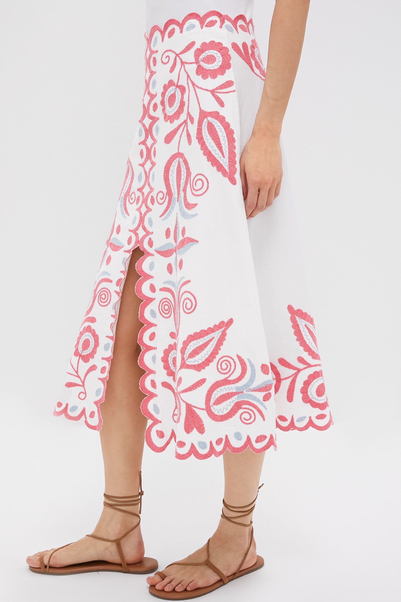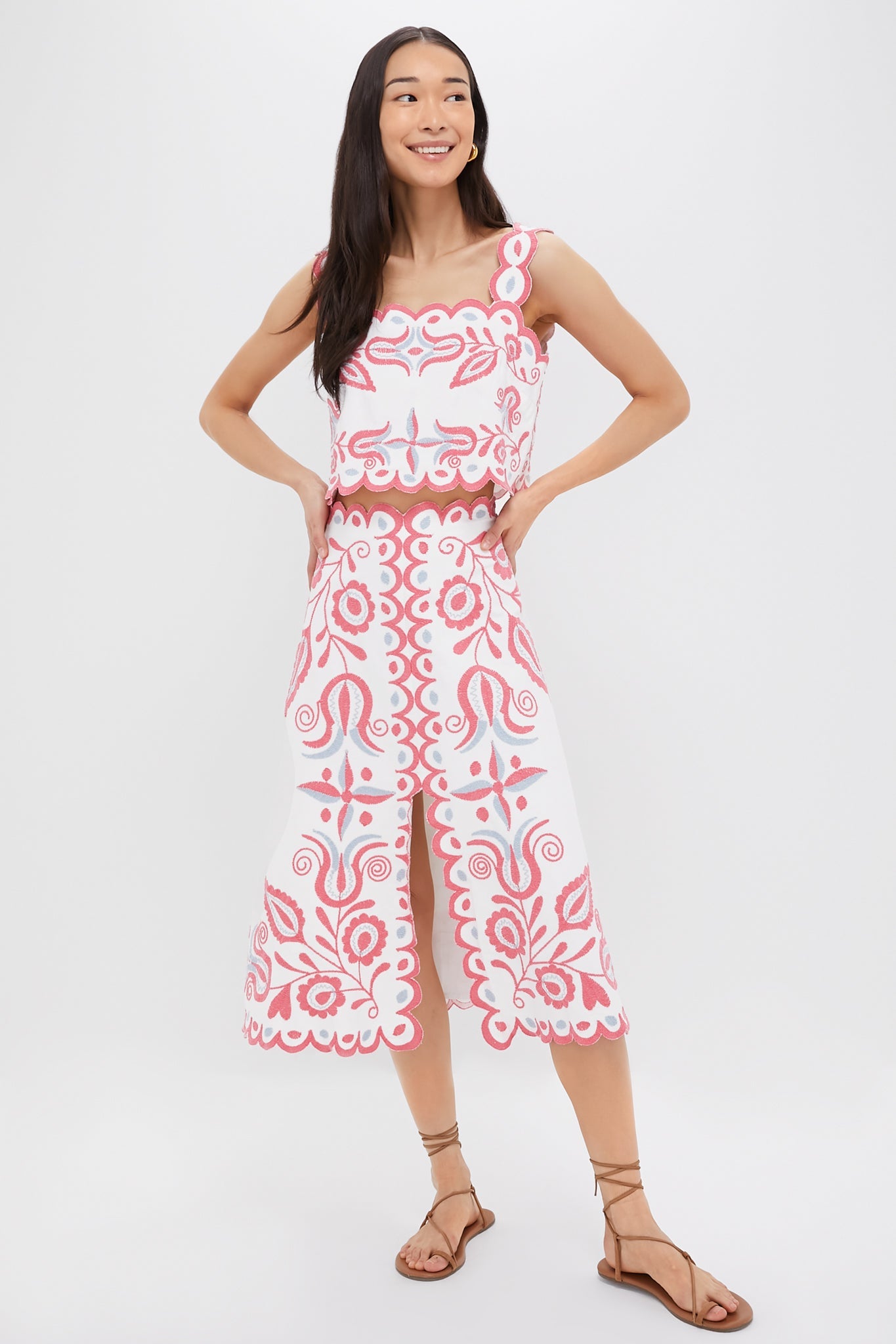 The Eevie Skirt is a whimsical warm-weather style with scalloped trim, embroidered detailing, and a chic front slit. We are dressing it down with a white tank and sandals, or pairing it with heels and the matching Multi Eevi Embroidered Twill Tank Top for weekend brunches and showers!