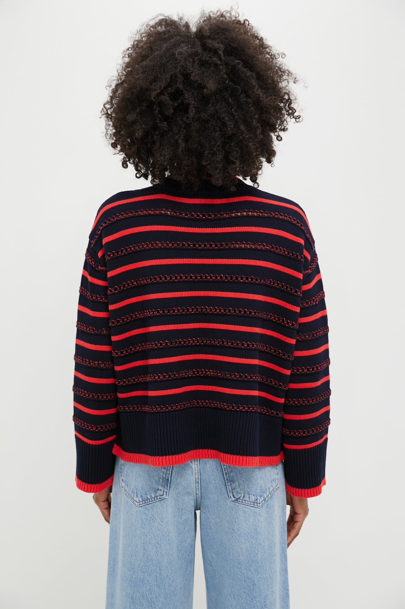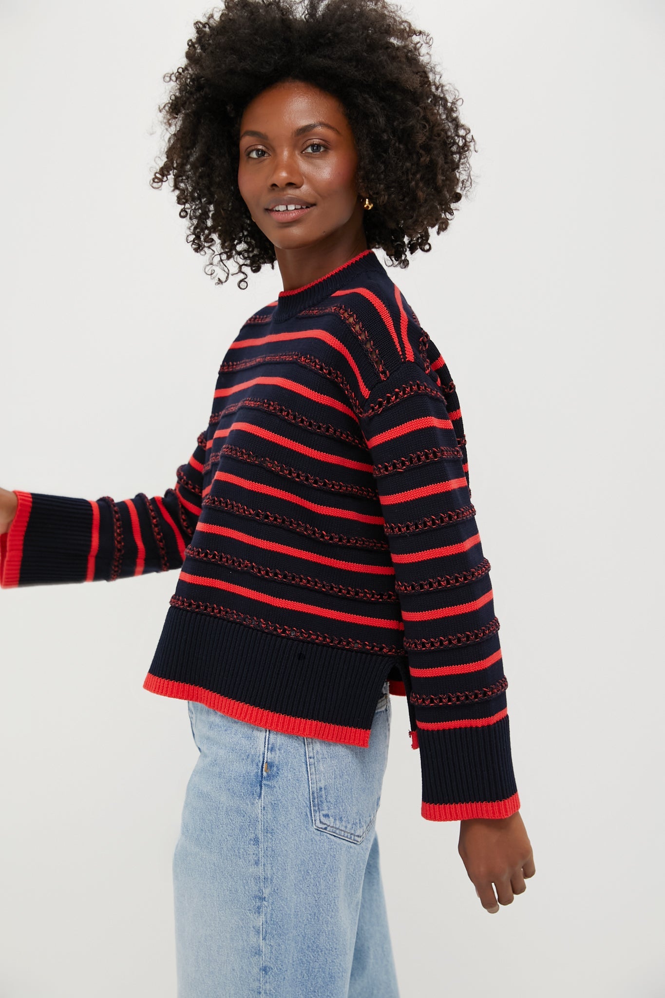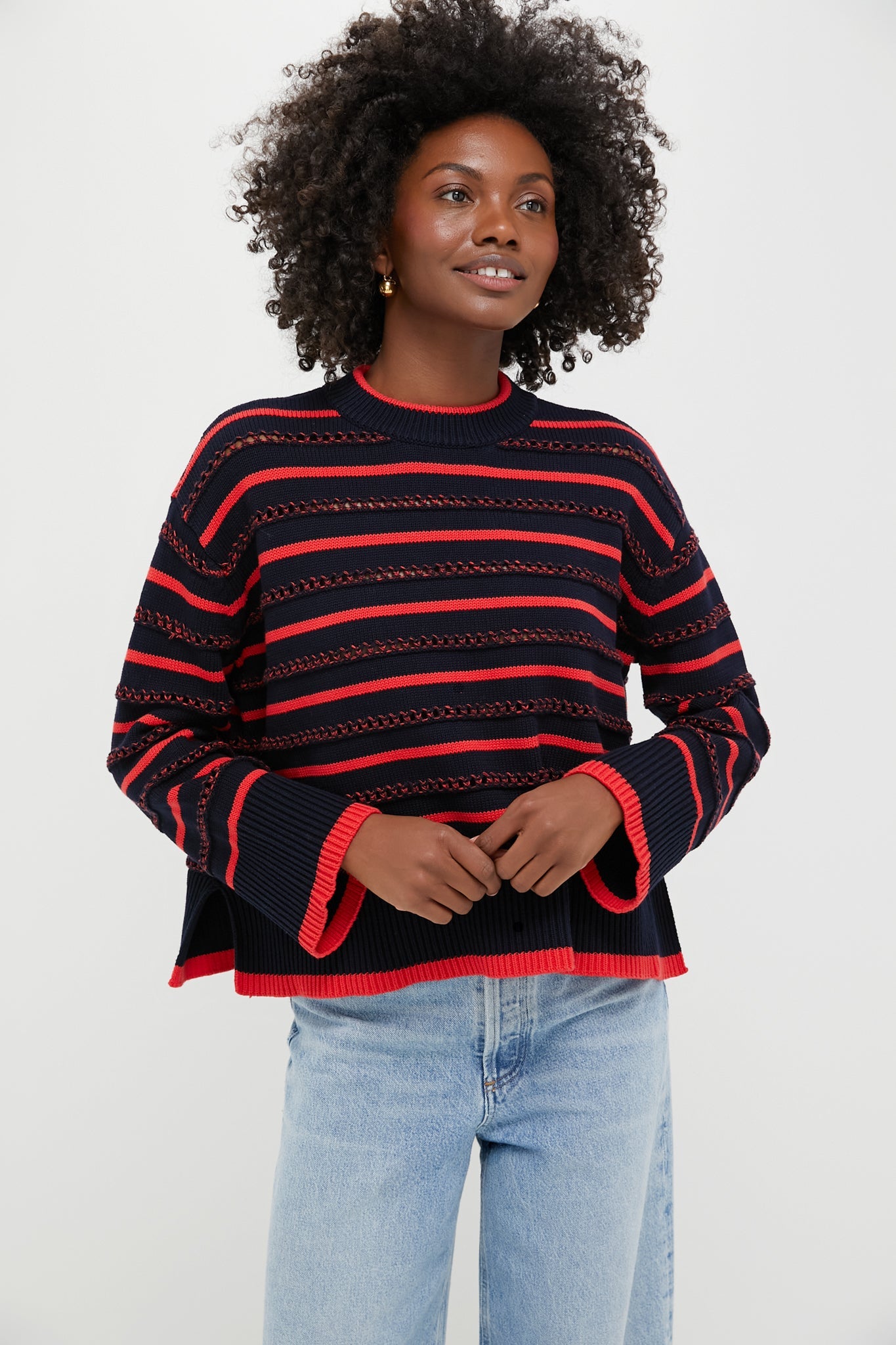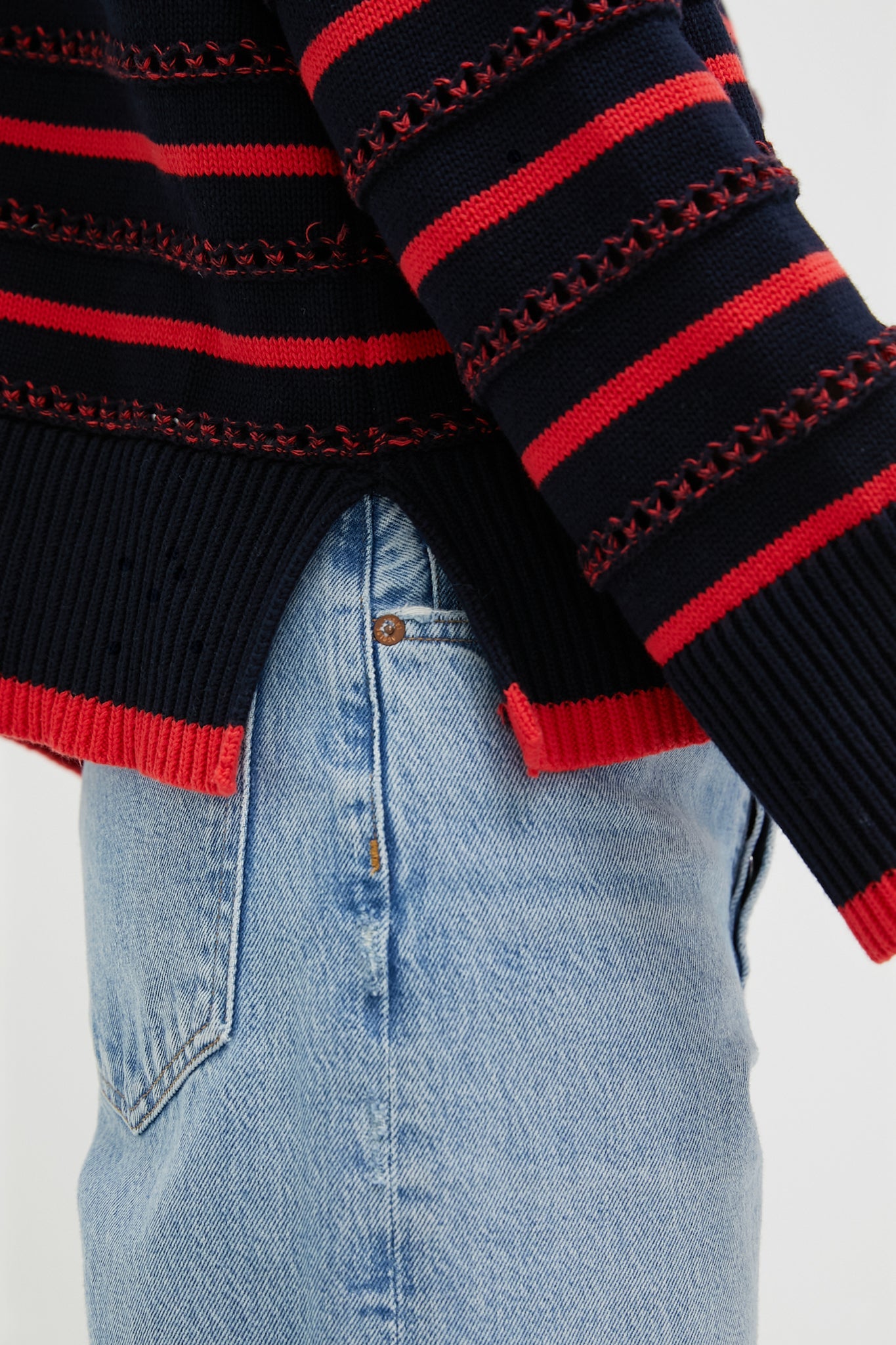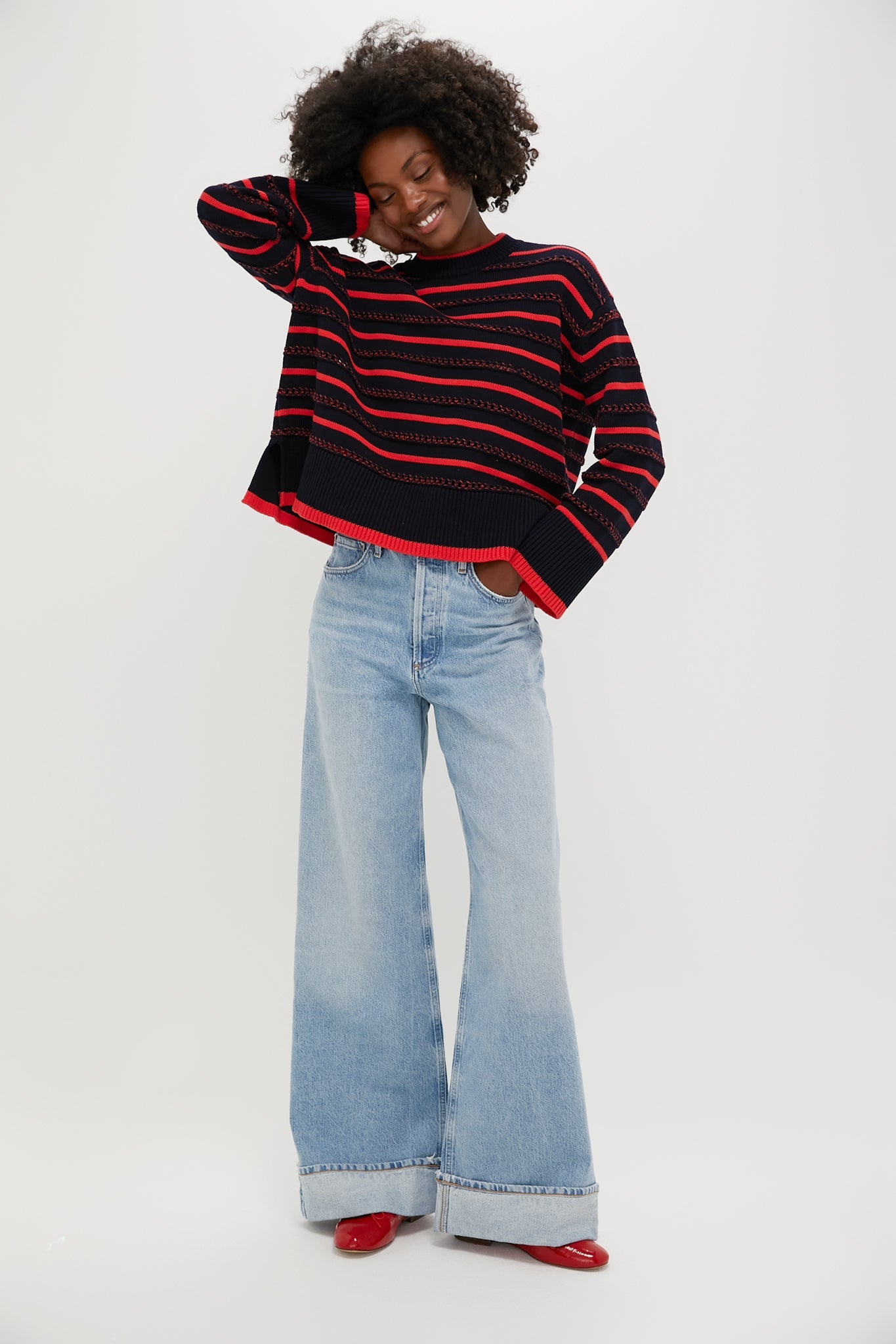The Navy and Red Pointelle Stripe Maxine Sweater is effortlessly chic. Made from 100% cotton with classic horizontal slightly see-through stripes, this relaxed fit knit is perfect for transitional seasons. Park picnics, backyard BBQs, and beach getaways are all just around the corner- add white denim and sandals for endless adventures this season.