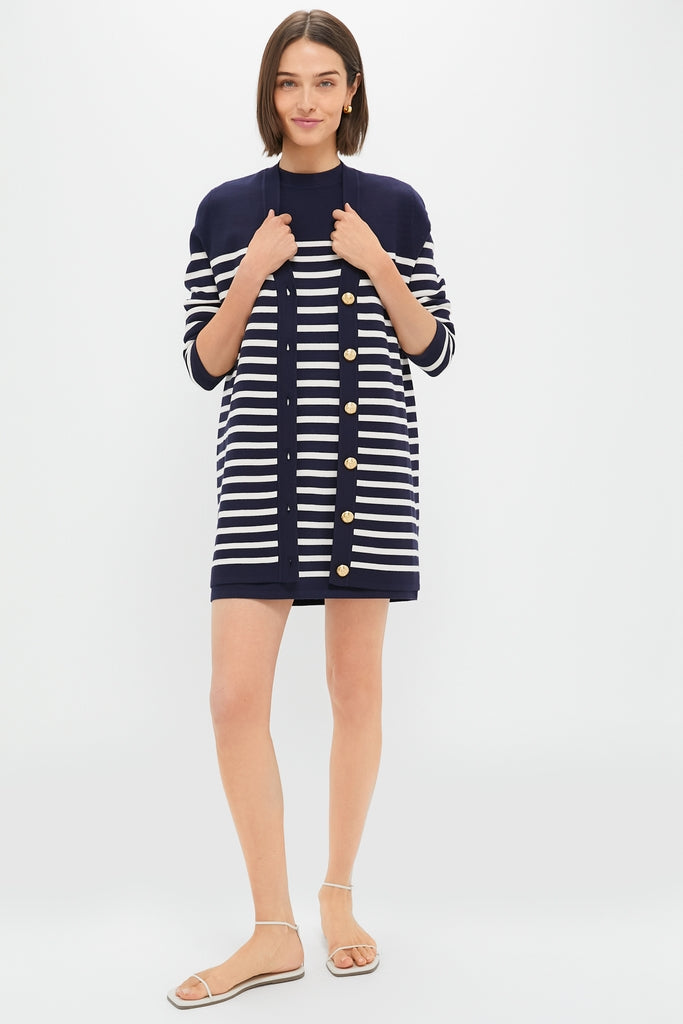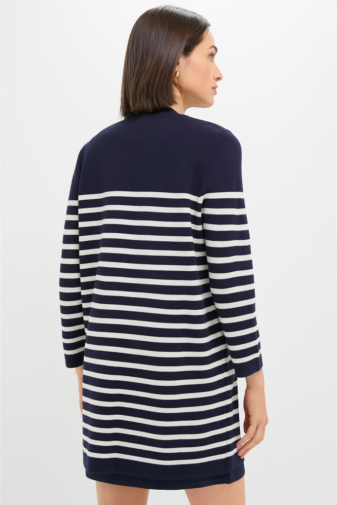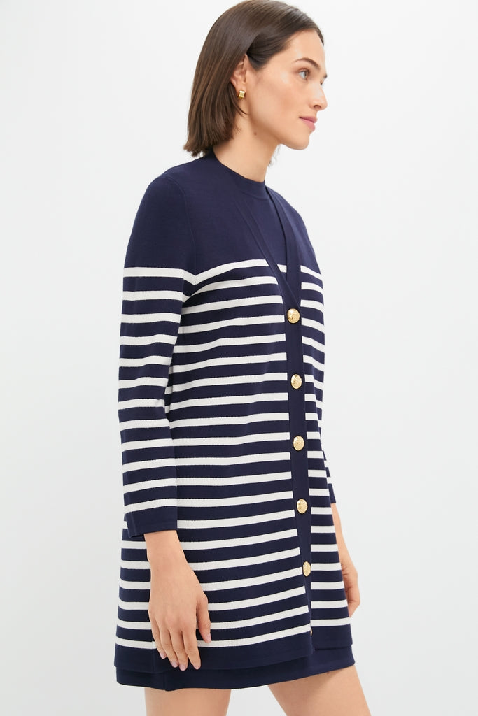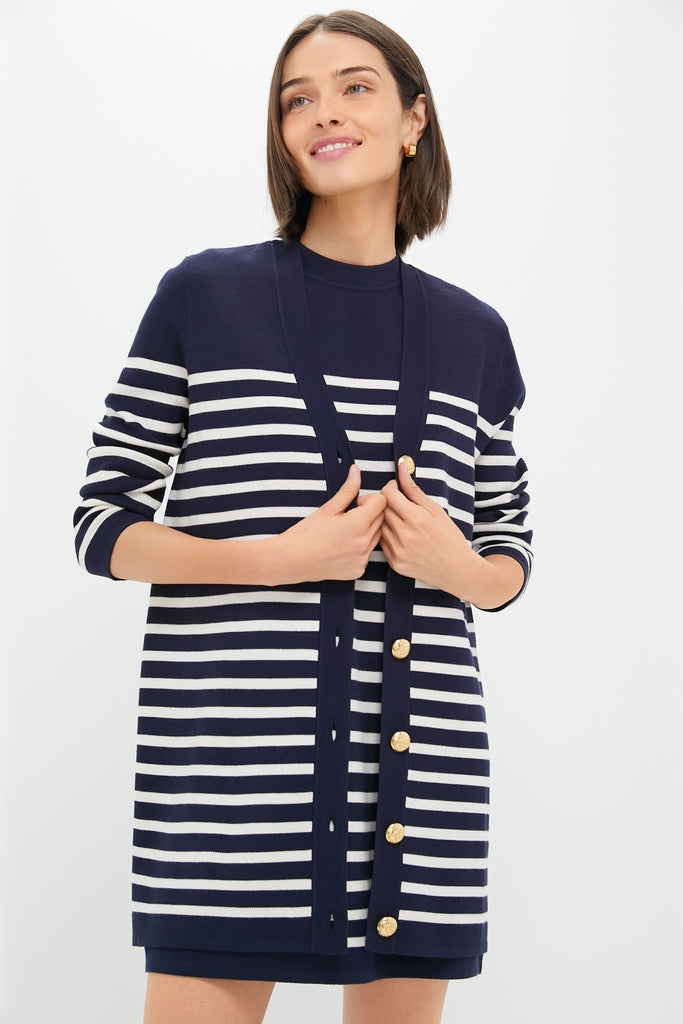 Crafted from a mid weight knit in a chic navy and white stripes, the Liv Cardigan offers a simple yet flattering silhouette with gold crested buttons. Lean into the vintage vibe by pairing this with the matching Navy and White Stripe Knit Marie Dress, flats, and a bucket bag.