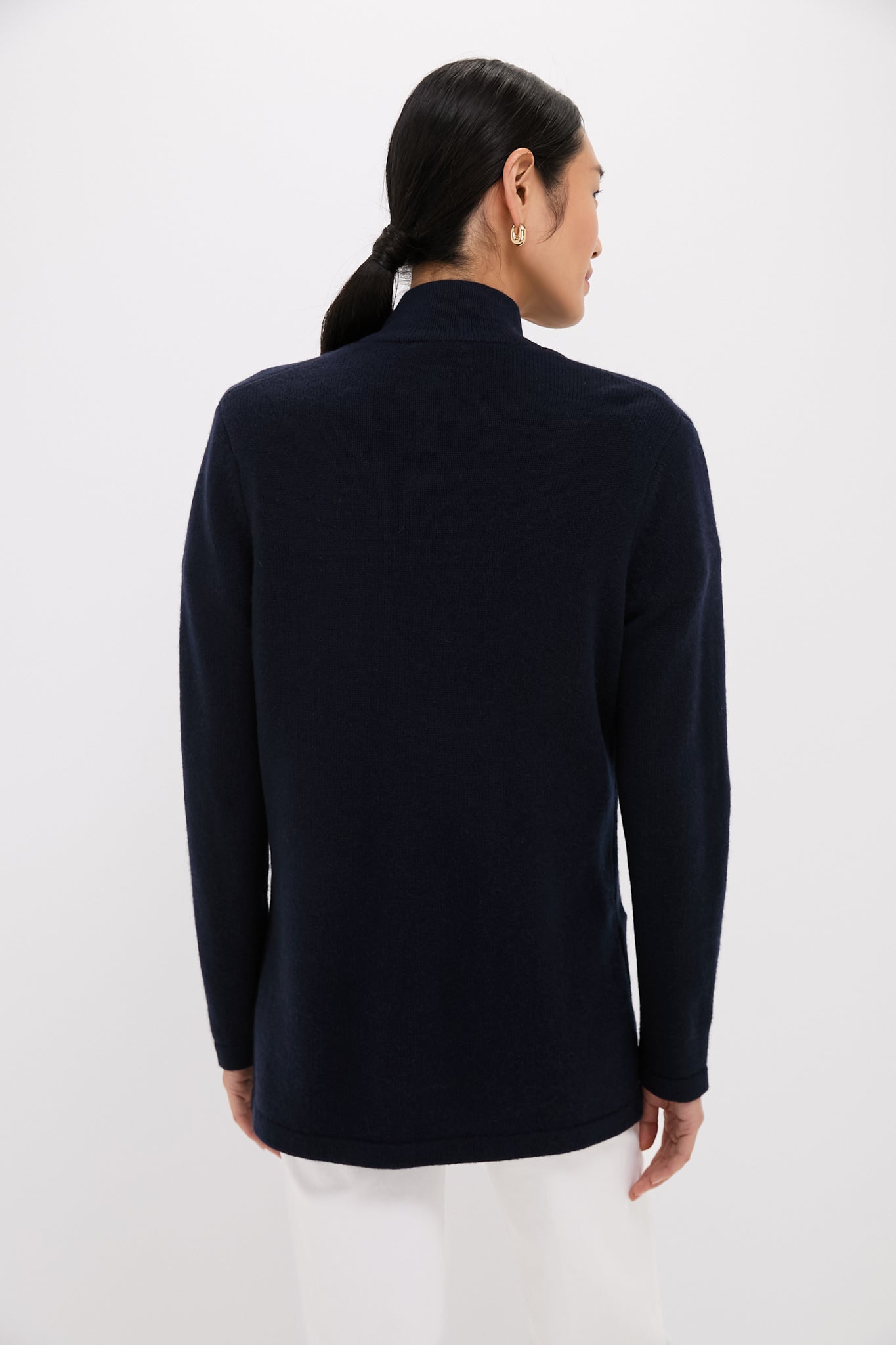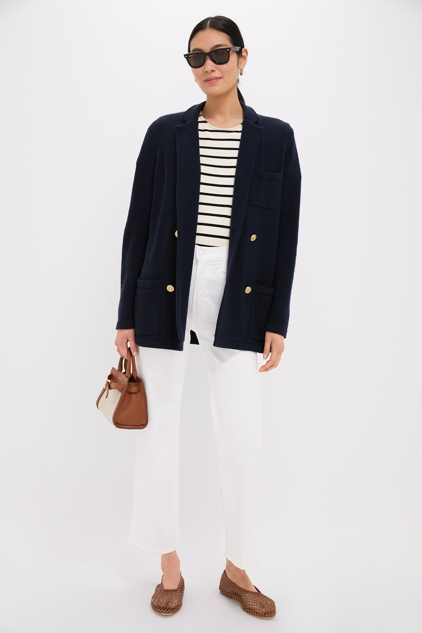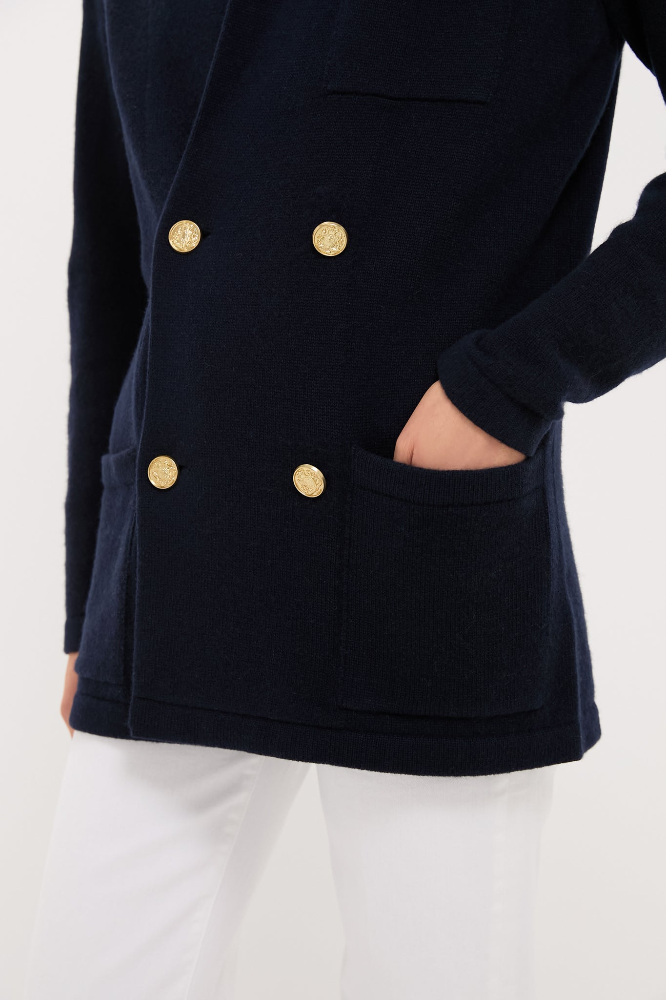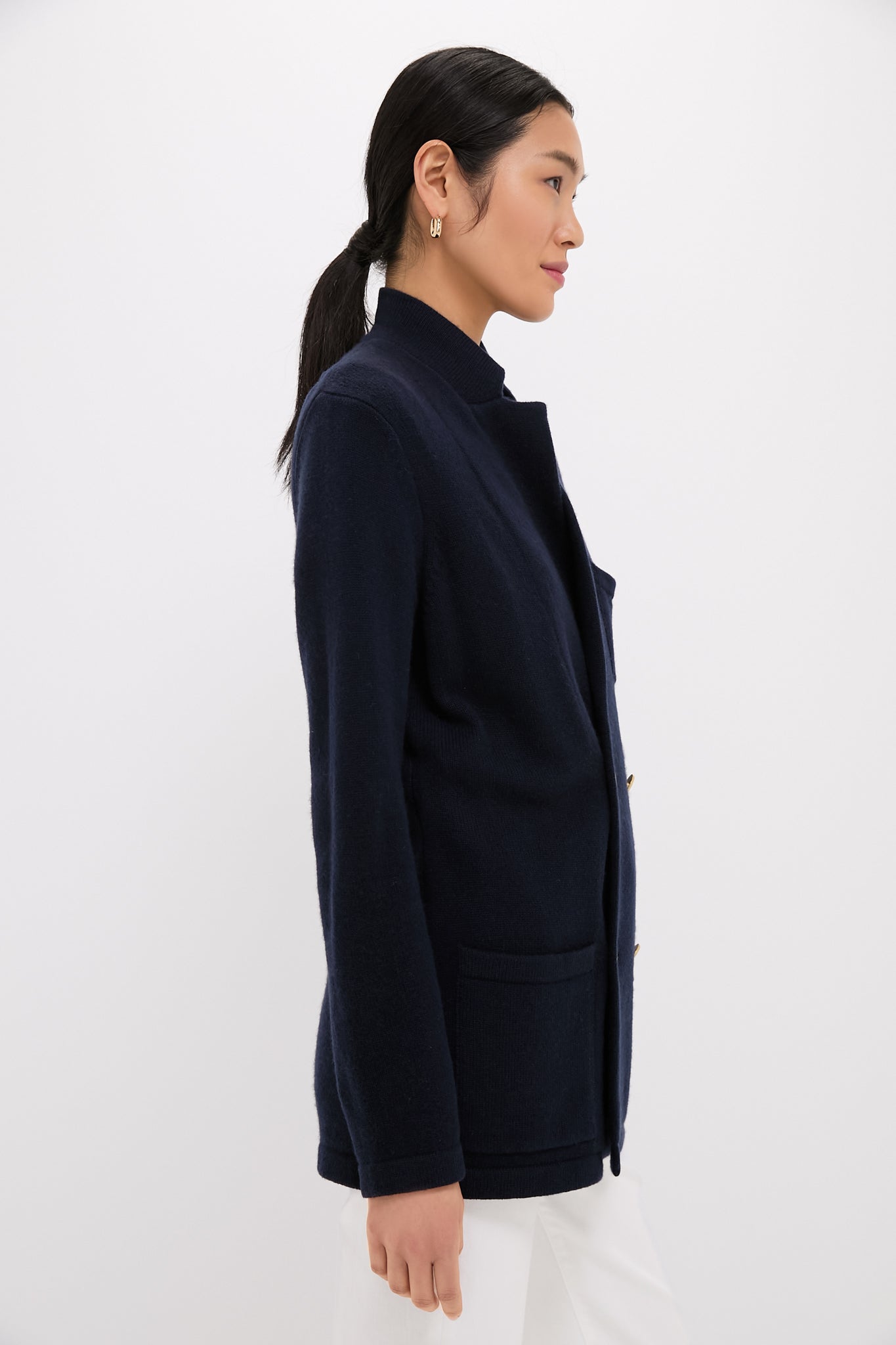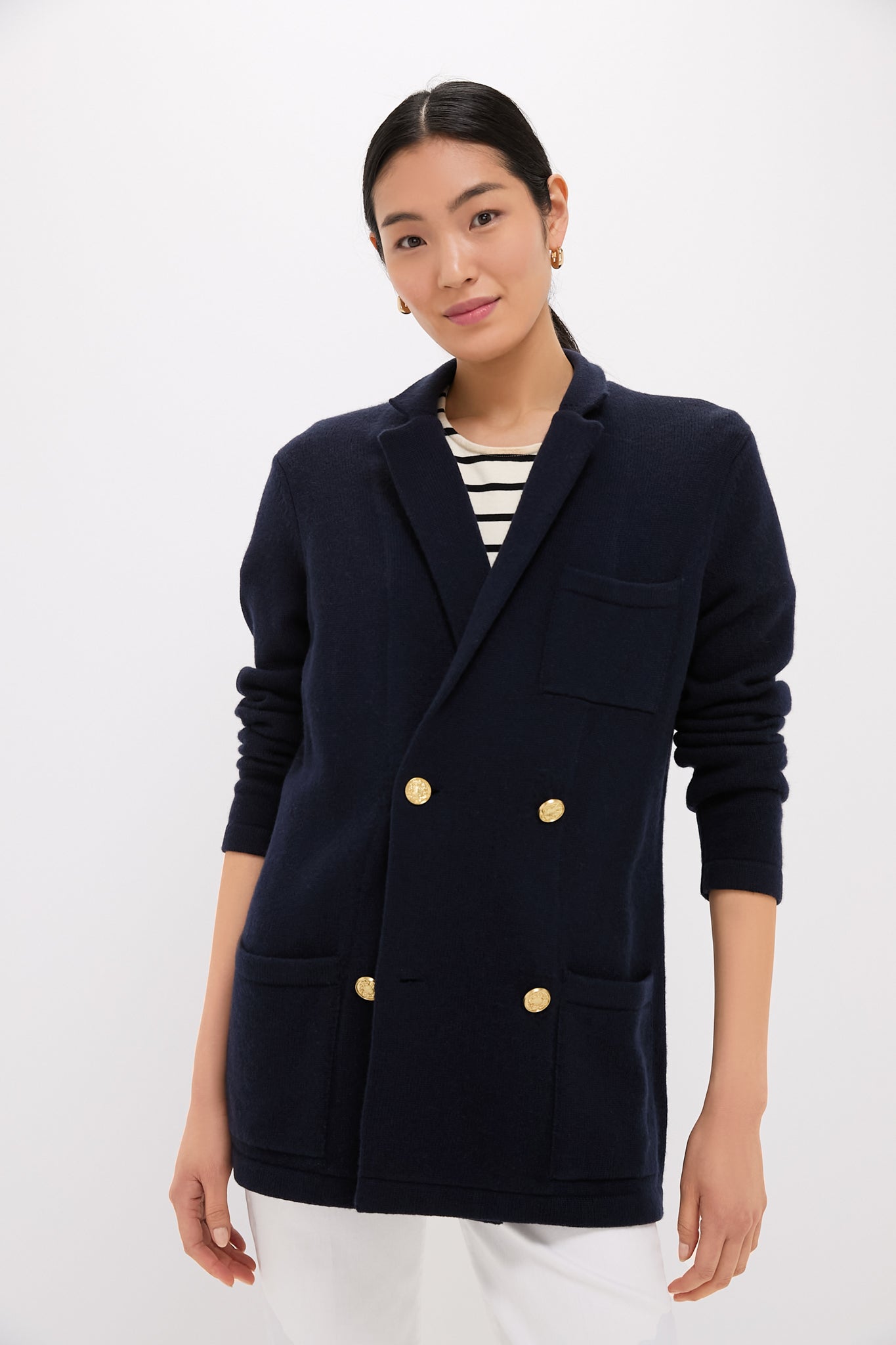 Crafted from the finest cashmere, this Navy Cashmere Benji Blazer combines timeless elegance with luxurious comfort. The tailored fit, sharp lapels, gold-tone buttons exudes sophistication, where as a relaxed silhouette provides comfort yet polished, put-together look. Pair unbuttoned with a tank and denim or with a floral maxi skirt and ballet flats for a season-less look!