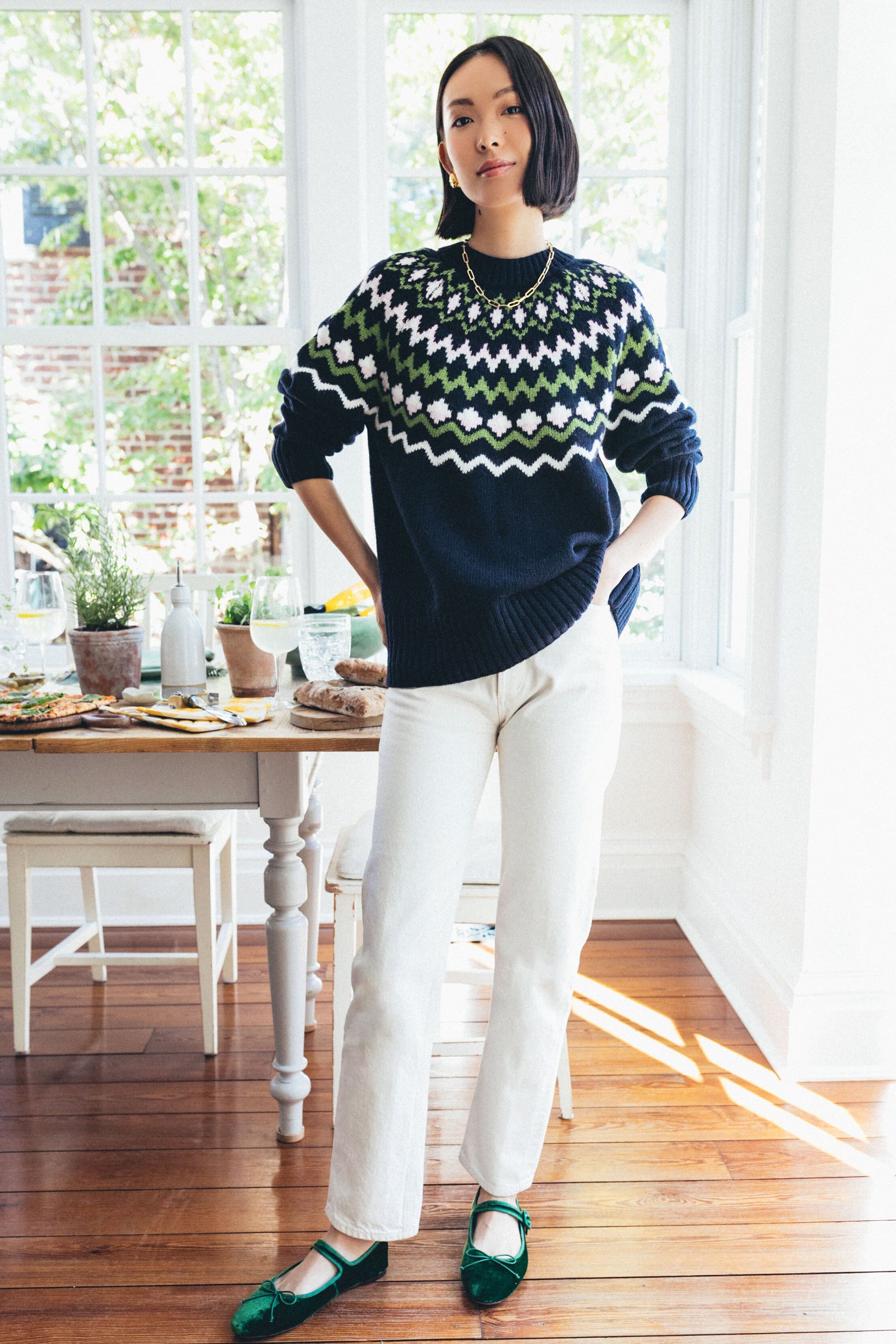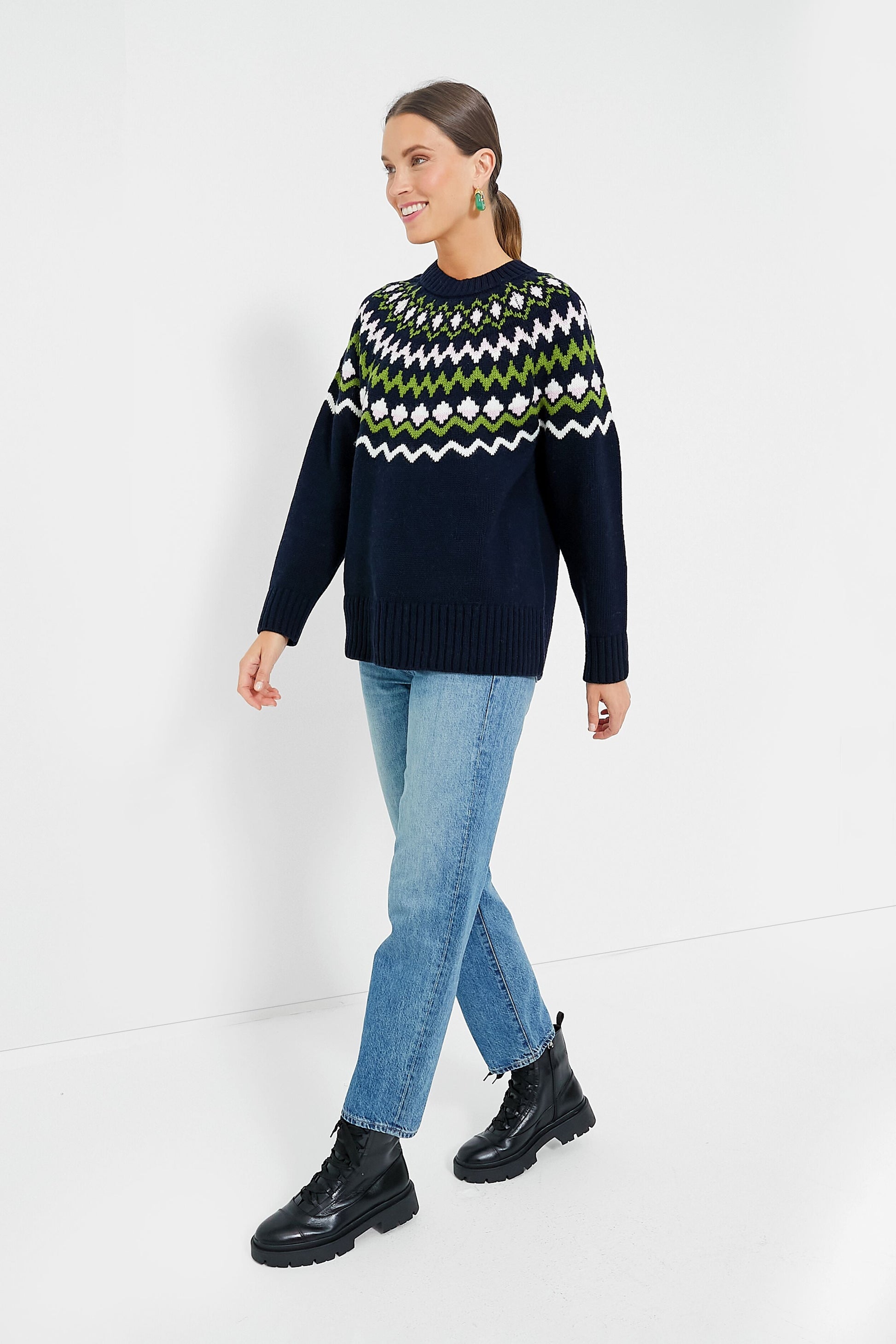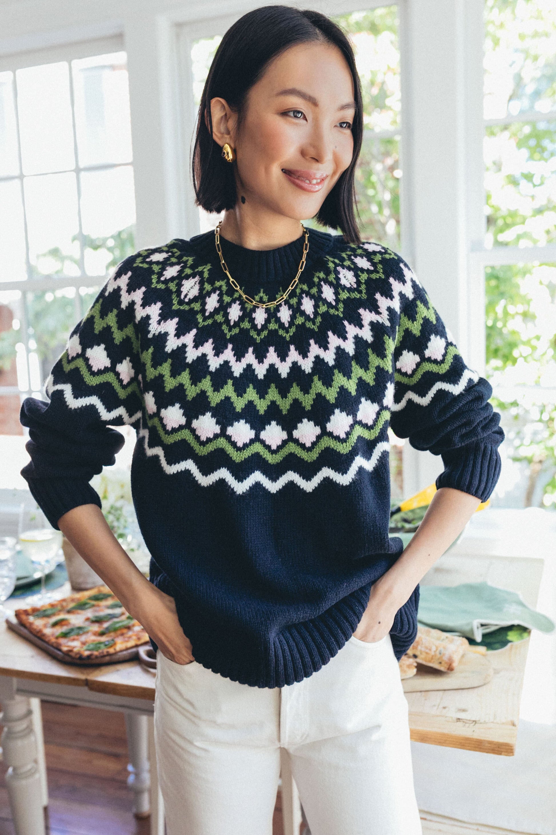 A fresh take on Fair Isle, the Chesil Knit is keeping us cozy this season. With a chic crewneck, long sleeves with ribbed cuffs, and a slightly relaxed fit perfect for layering or tucking in, this classic navy sweater is exactly what you need for sitting by the fire, sipping a hot toddy, or braving the cold. Pair with a midi skirt and tall boots to dress it up, or keep it classic with denim and gold hoops for everyday wear.