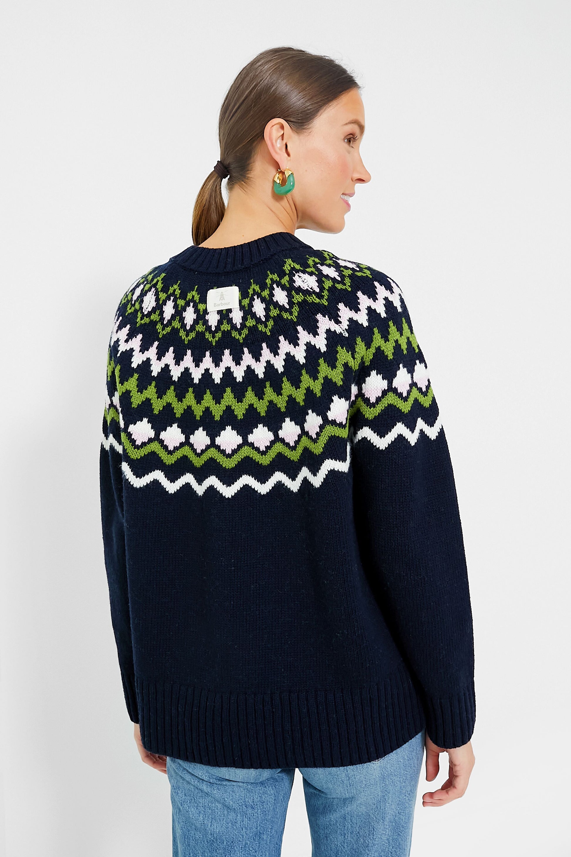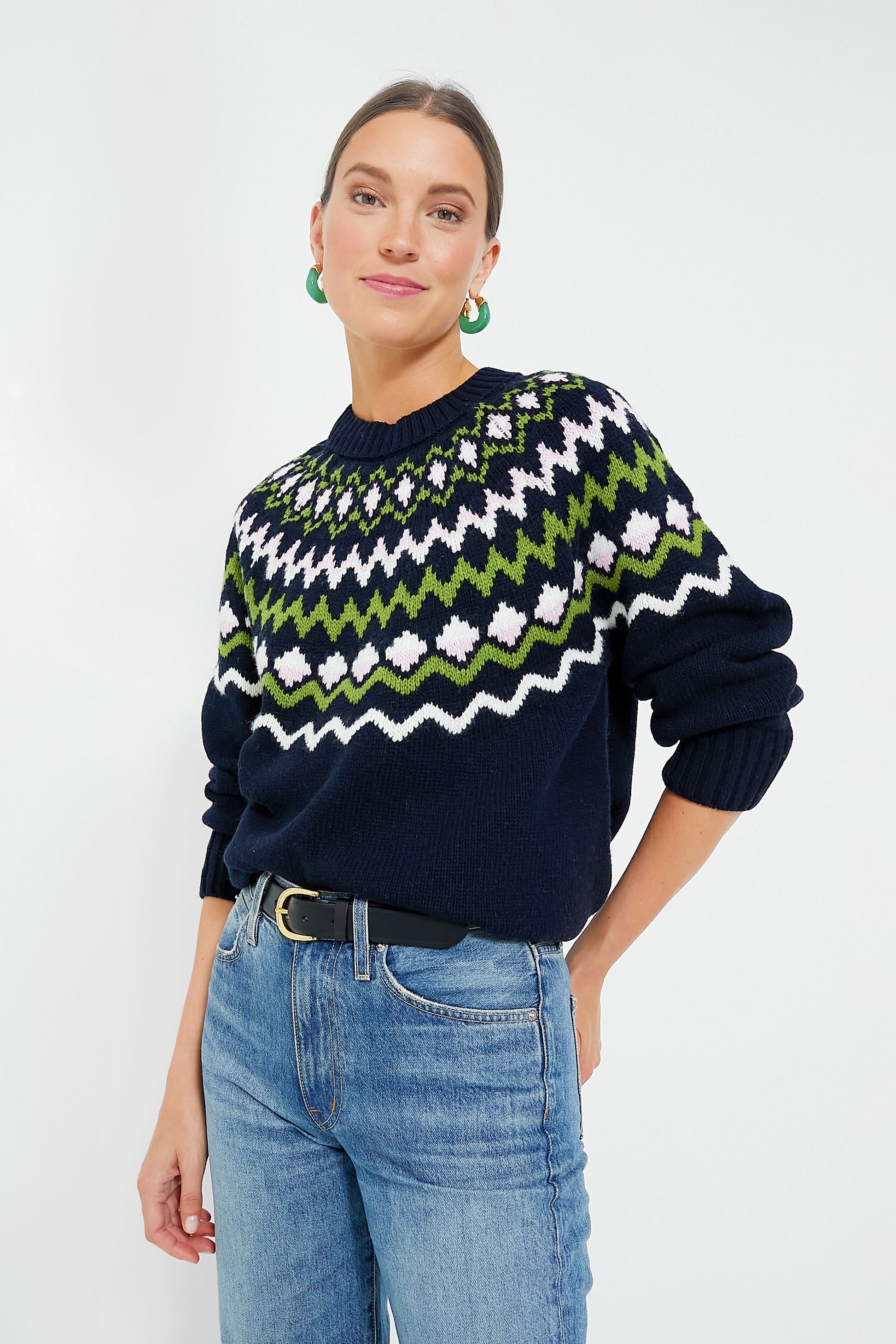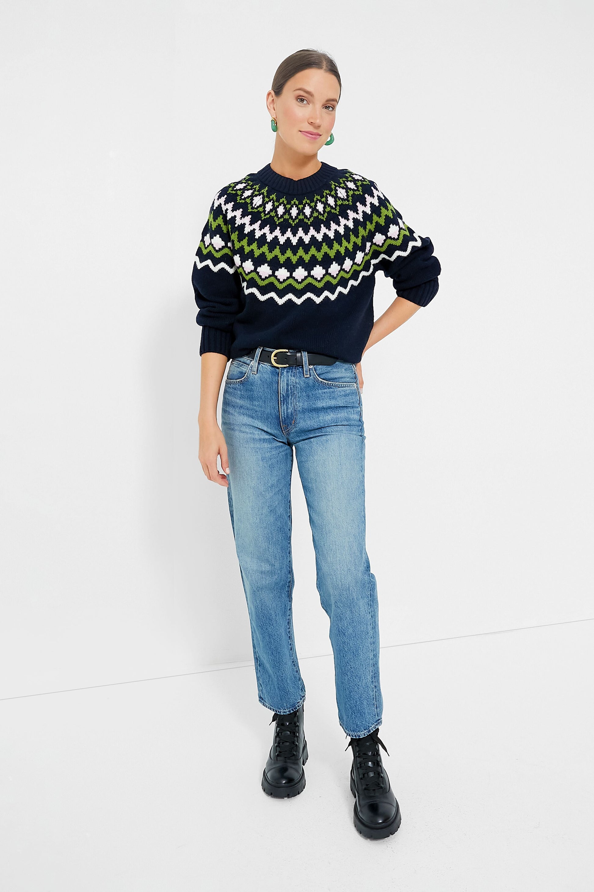 A fresh take on Fair Isle, the Chesil Knit is keeping us cozy this season. With a chic crewneck, long sleeves with ribbed cuffs, and a slightly relaxed fit perfect for layering or tucking in, this classic navy sweater is exactly what you need for sitting by the fire, sipping a hot toddy, or braving the cold. Pair with a midi skirt and tall boots to dress it up, or keep it classic with denim and gold hoops for everyday wear.