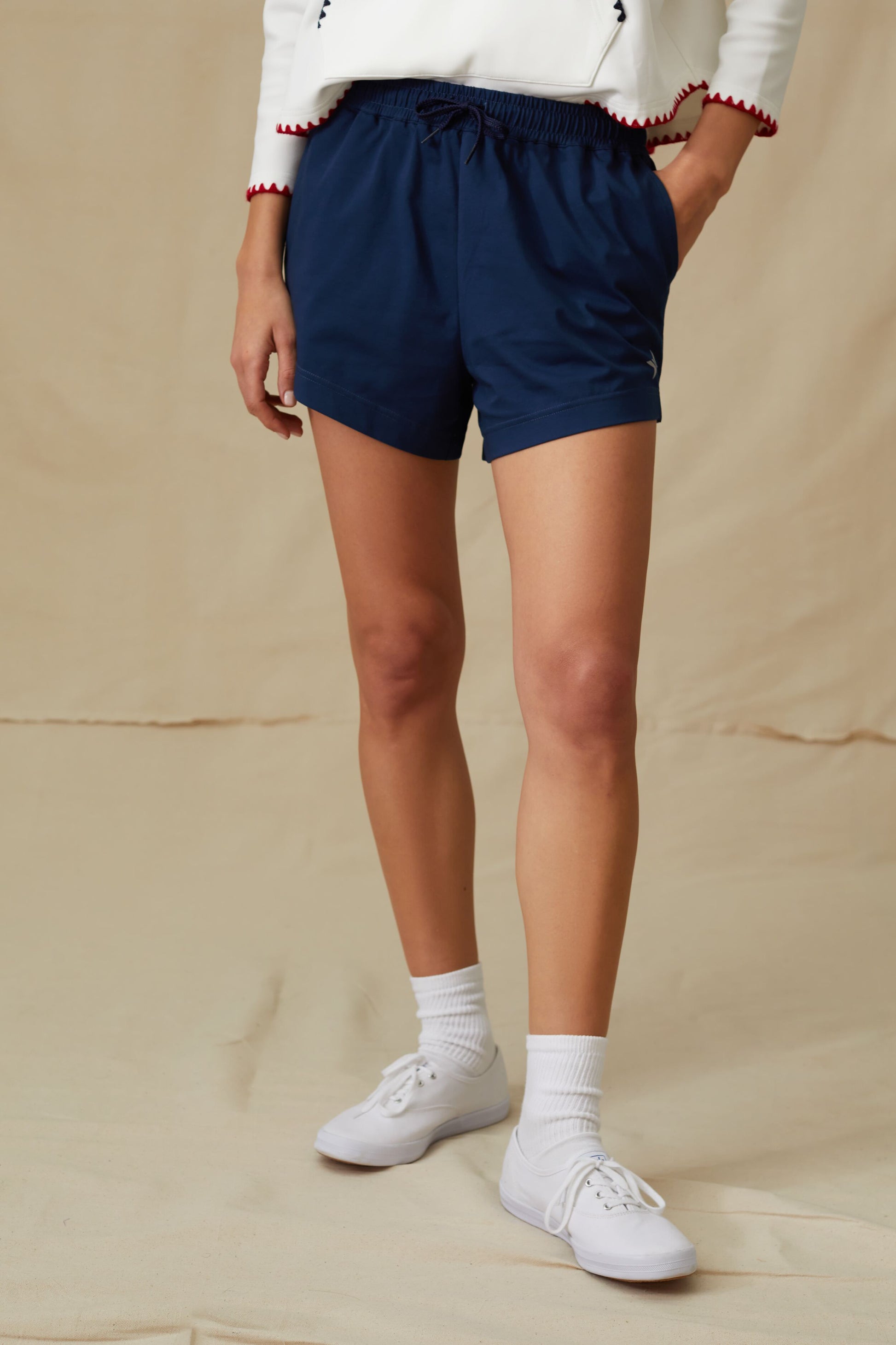 You won't want to take off the Navy Cotton Bowen Shorts. Made in a comfortable (and moisture-wicking fabric, these easy trousers feature an elastic waistband and side pockets for convenience on and off the court.