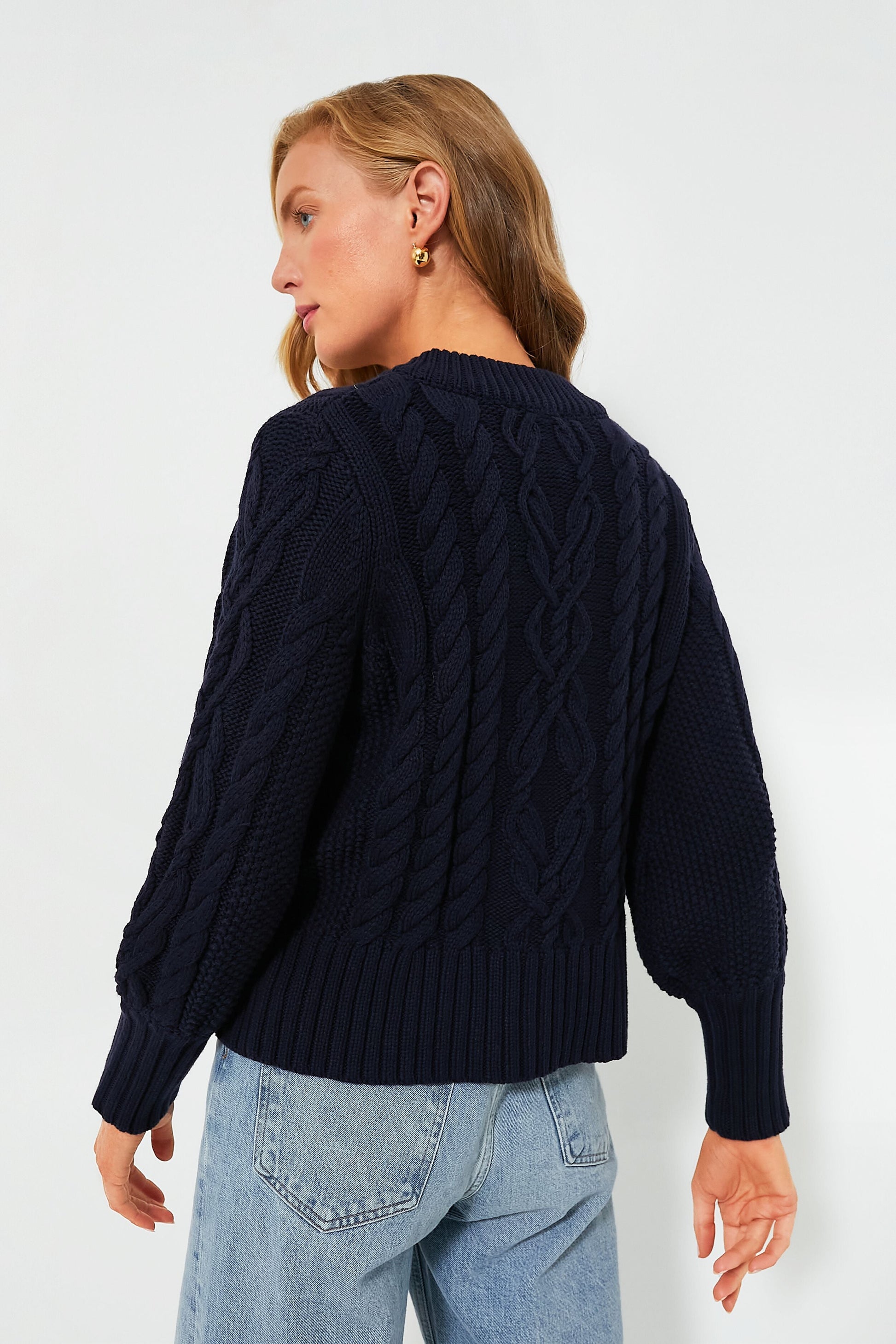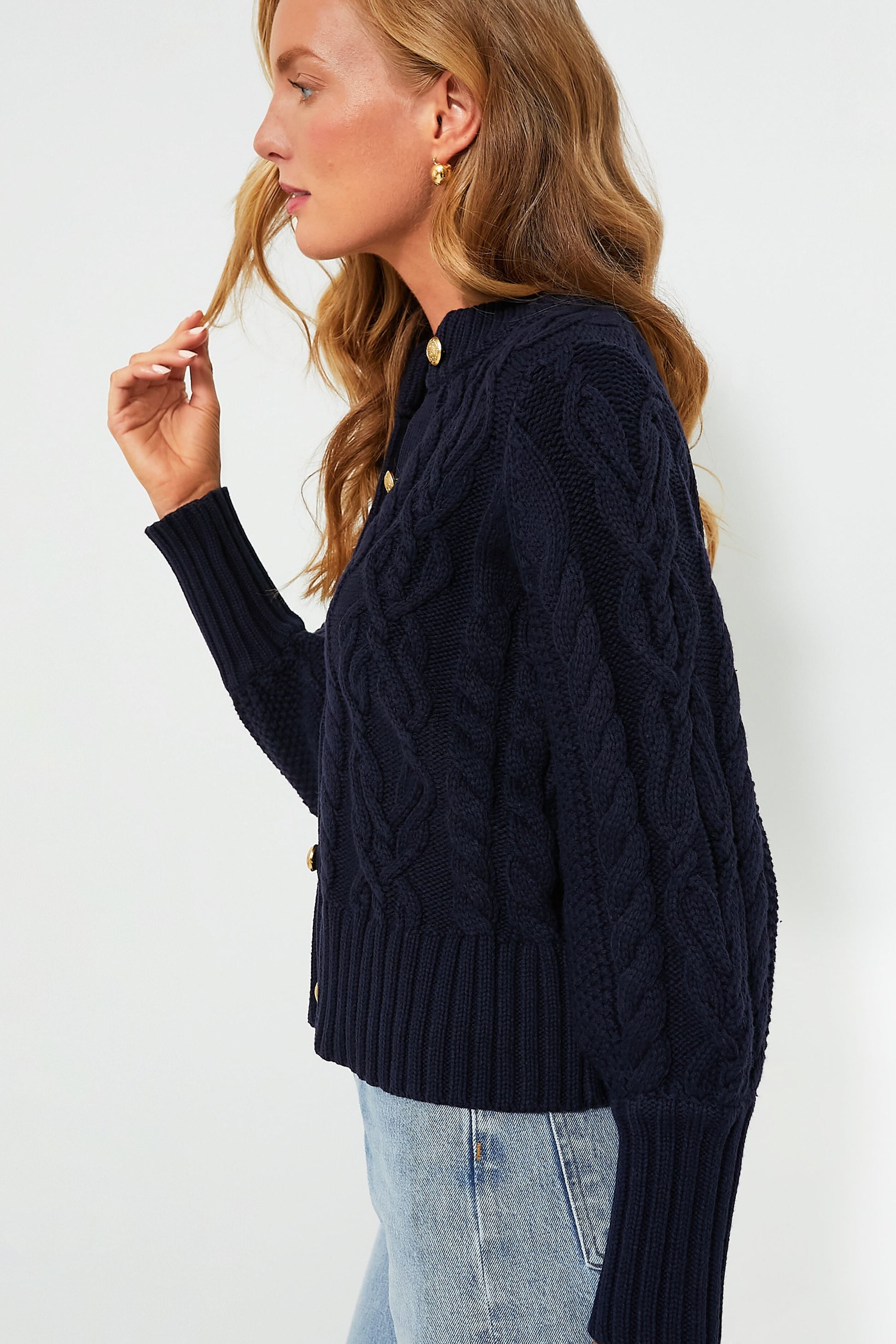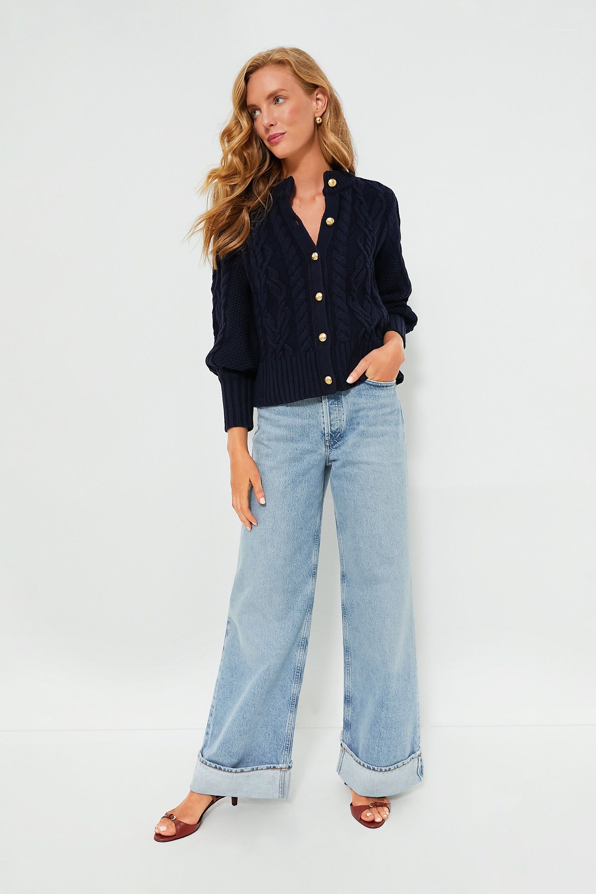 Chunky, cozy and always chic- the Navy Cotton Colette Cardigan takes the very best elements from the classic style and updates it with exaggerated bishop sleeves, gold buttons, and a slightly cropped but not too short length that makes it perfect for layering over dresses or styling solo with high waisted pants. Dressed up or down, in the office or out to dinner, the possibilities are endless with this transitional piece.