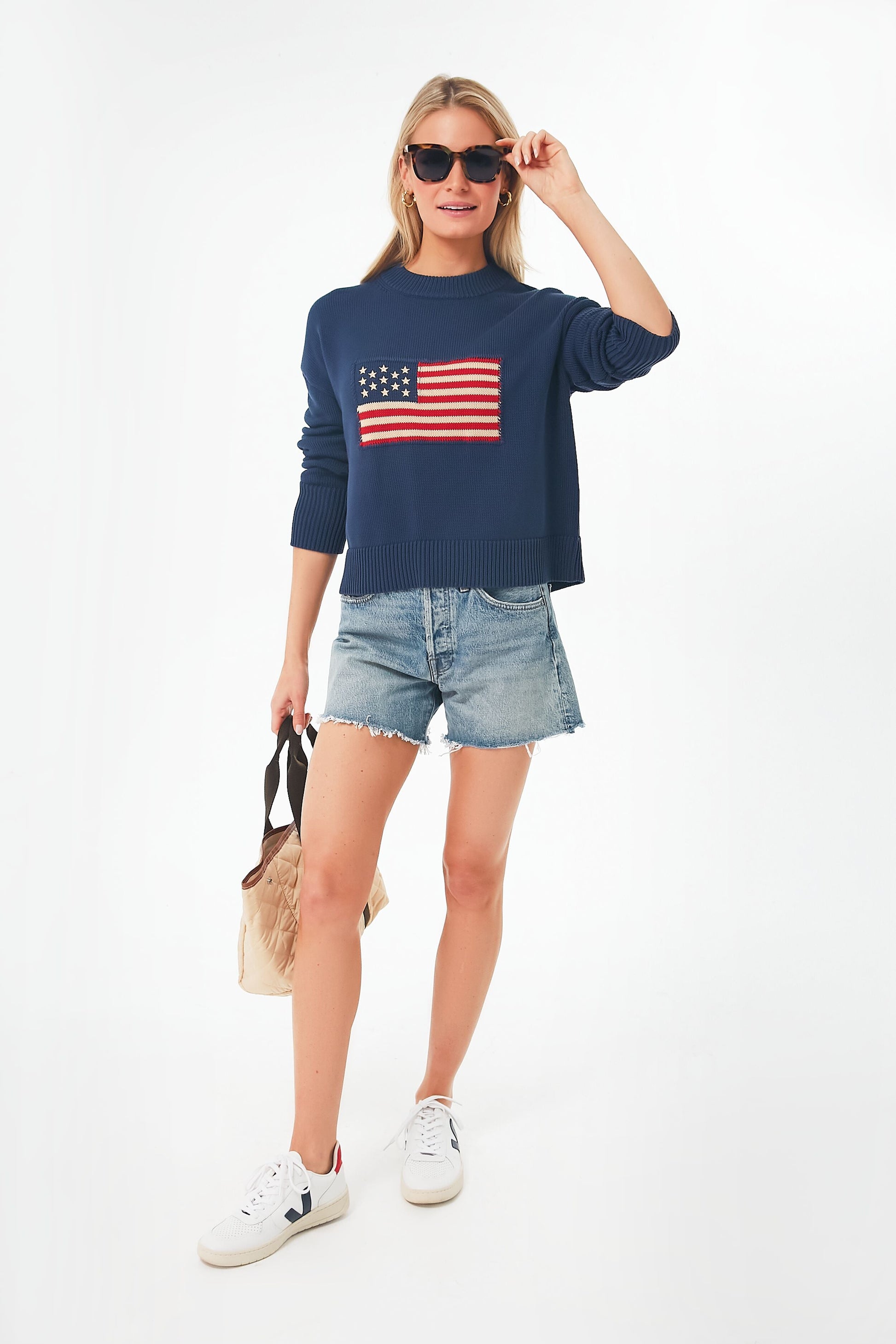 A closet essential and customer favorite, the Cropped Americana Sweater has been updated in a true navy. This on-trend piece evokes a nostalgic feeling while featuring modern design details like a subtle crop and rib trim for an updated take on the classic staple piece. This easy layer, seasonless, 100% cotton pullover will take you from crisp cool walks to backyard BBQs to family game night with its boxy fit and intarsia flag front and center.