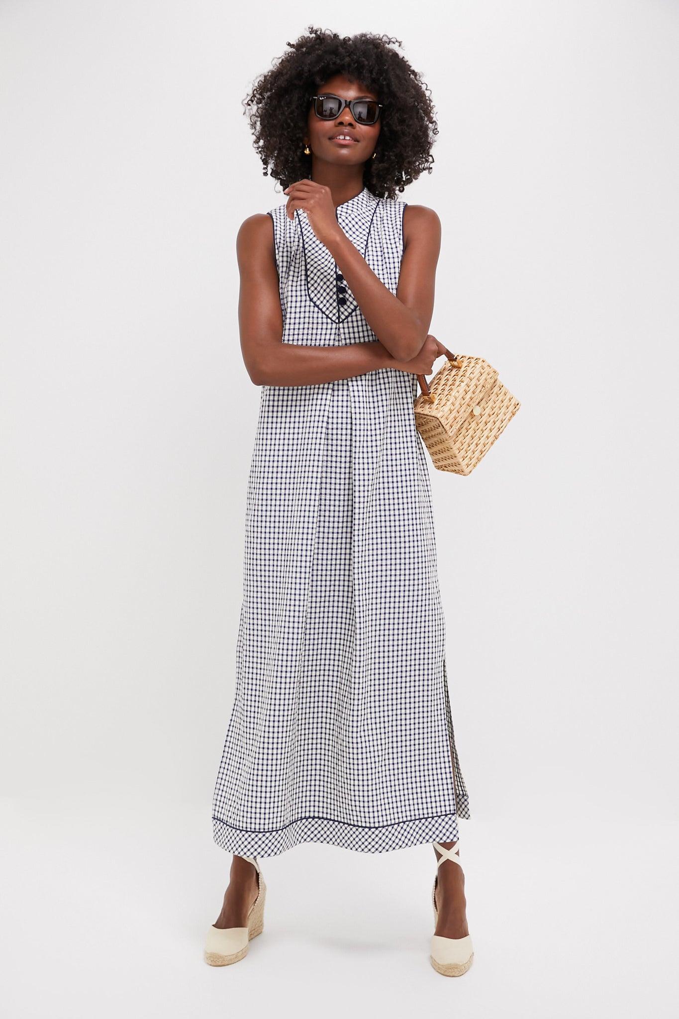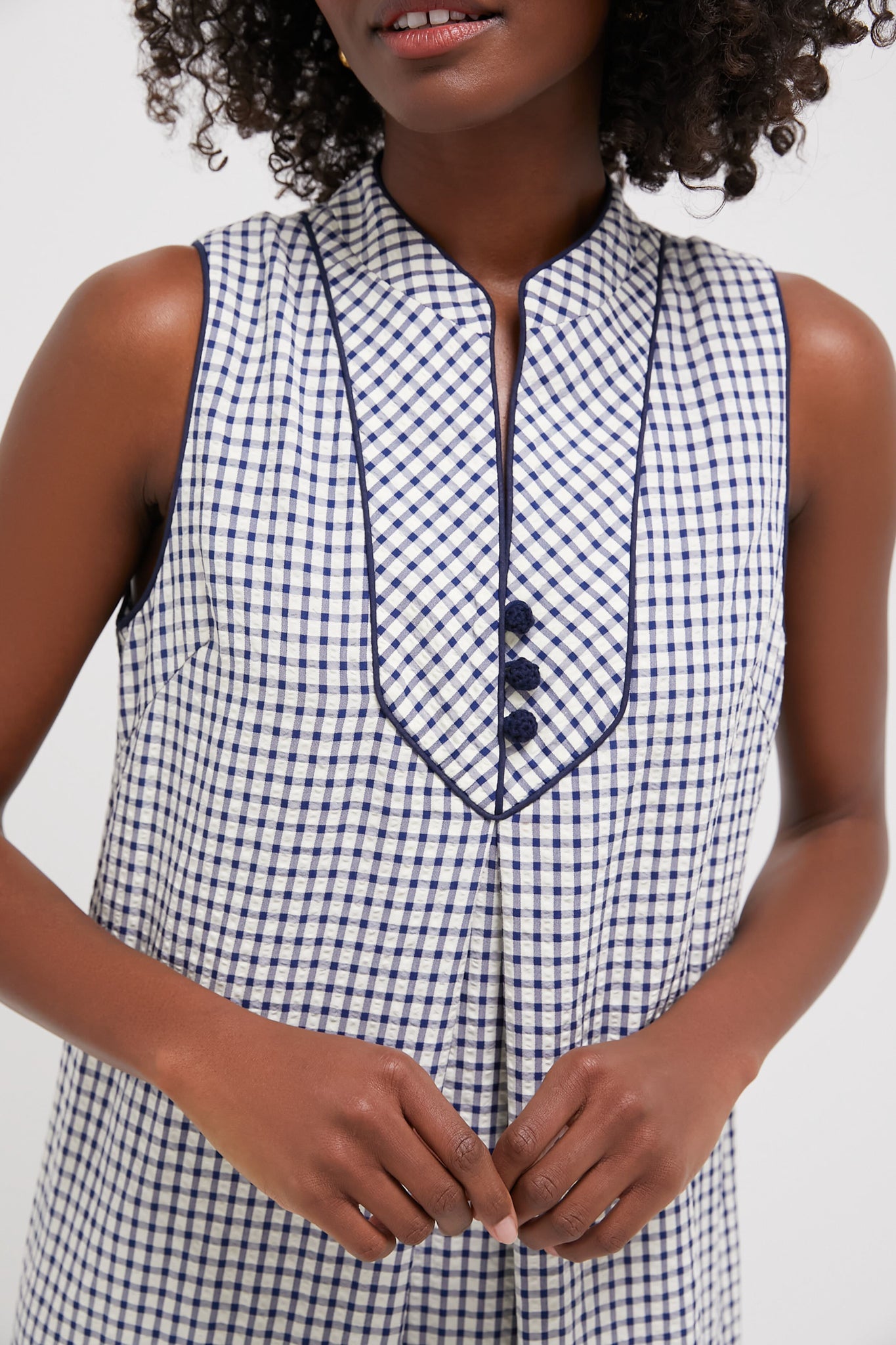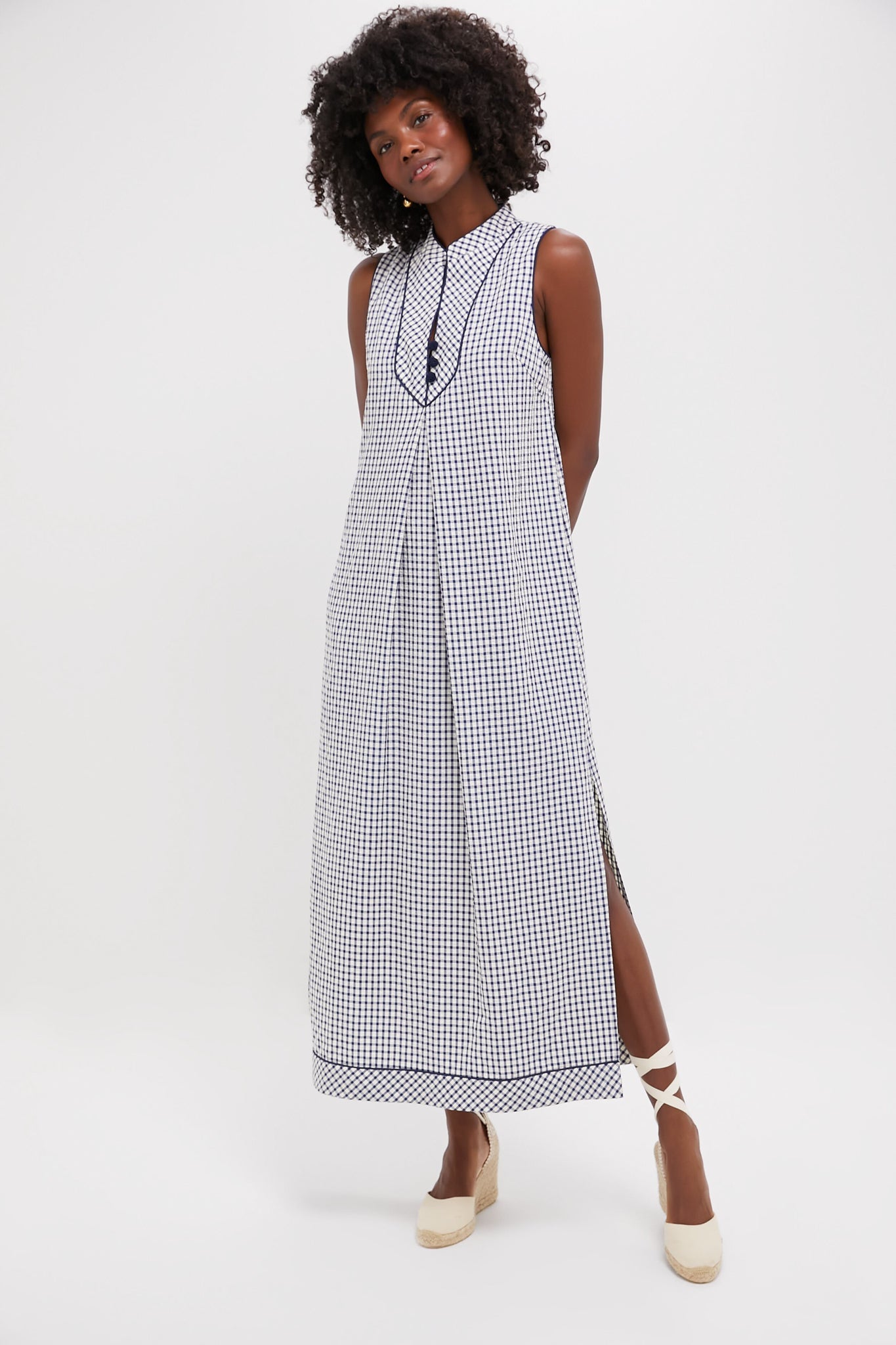 The Navy Gingham Seersucker Haines Dress is a warm weather staple. With a stand collar, maxi length, and oh so trending gingham seersucker fabric, you are sure to stay cool and stylish in this maxi! Pair with wedges and a clutch for elevated girls lunch, or throw on over a bathing suit with sandals for a beach-to-bar look, the option are endless!