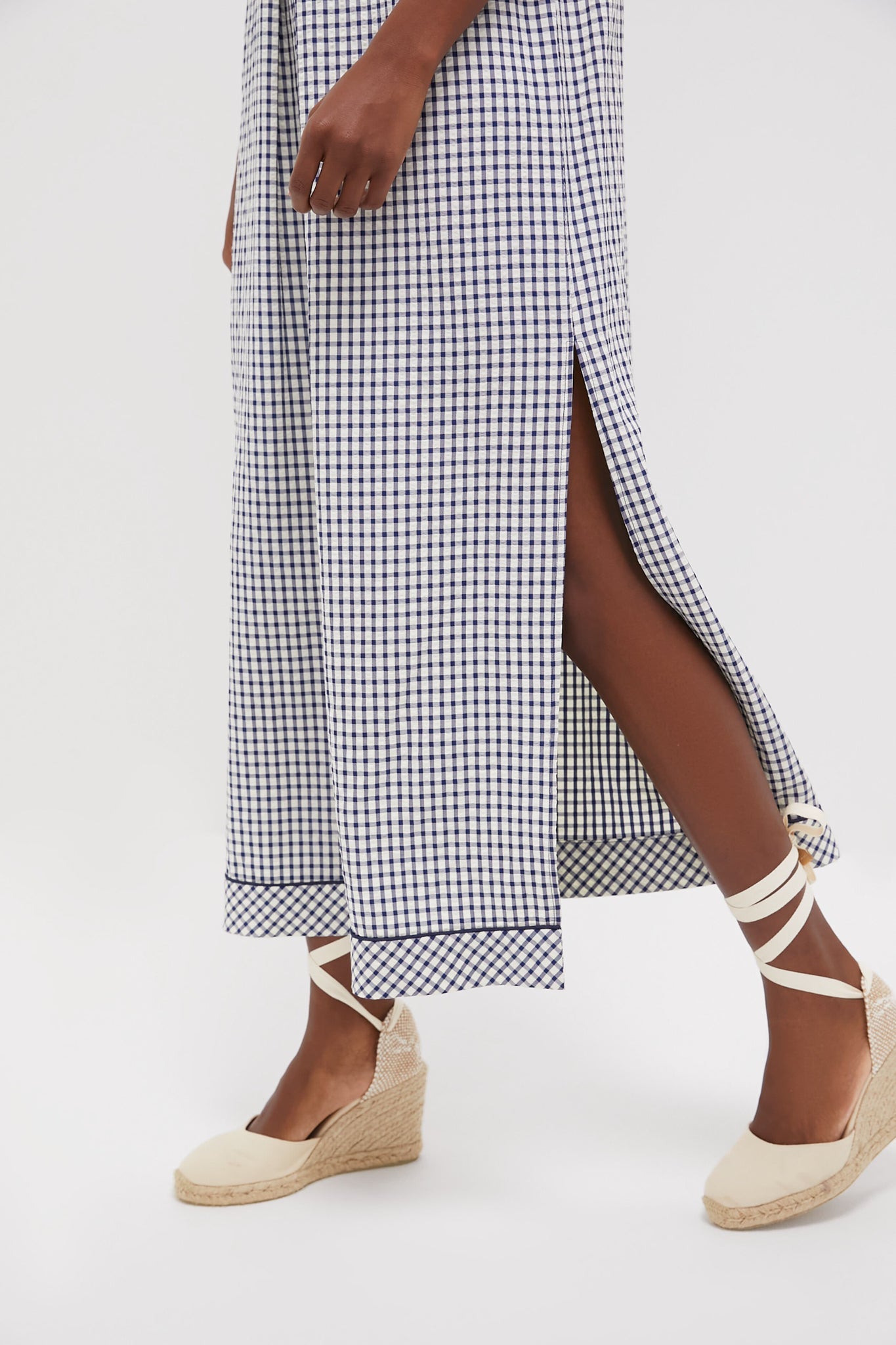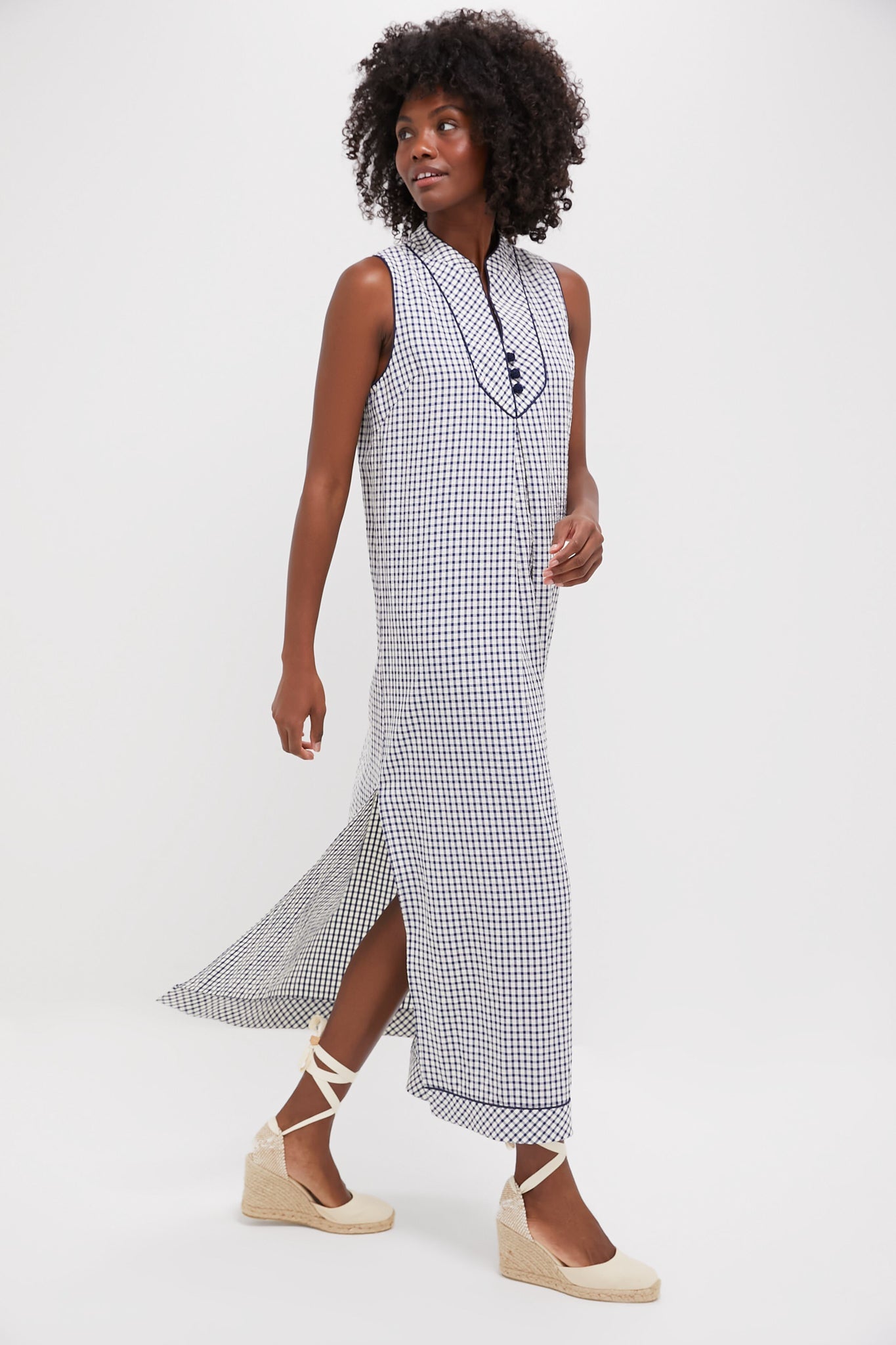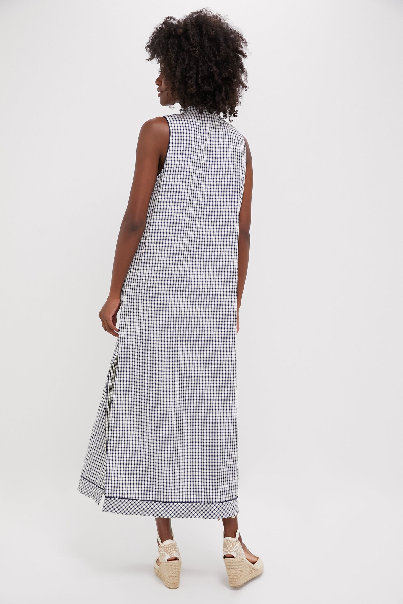 The Navy Gingham Seersucker Haines Dress is a warm weather staple. With a stand collar, maxi length, and oh so trending gingham seersucker fabric, you are sure to stay cool and stylish in this maxi! Pair with wedges and a clutch for elevated girls lunch, or throw on over a bathing suit with sandals for a beach-to-bar look, the option are endless!