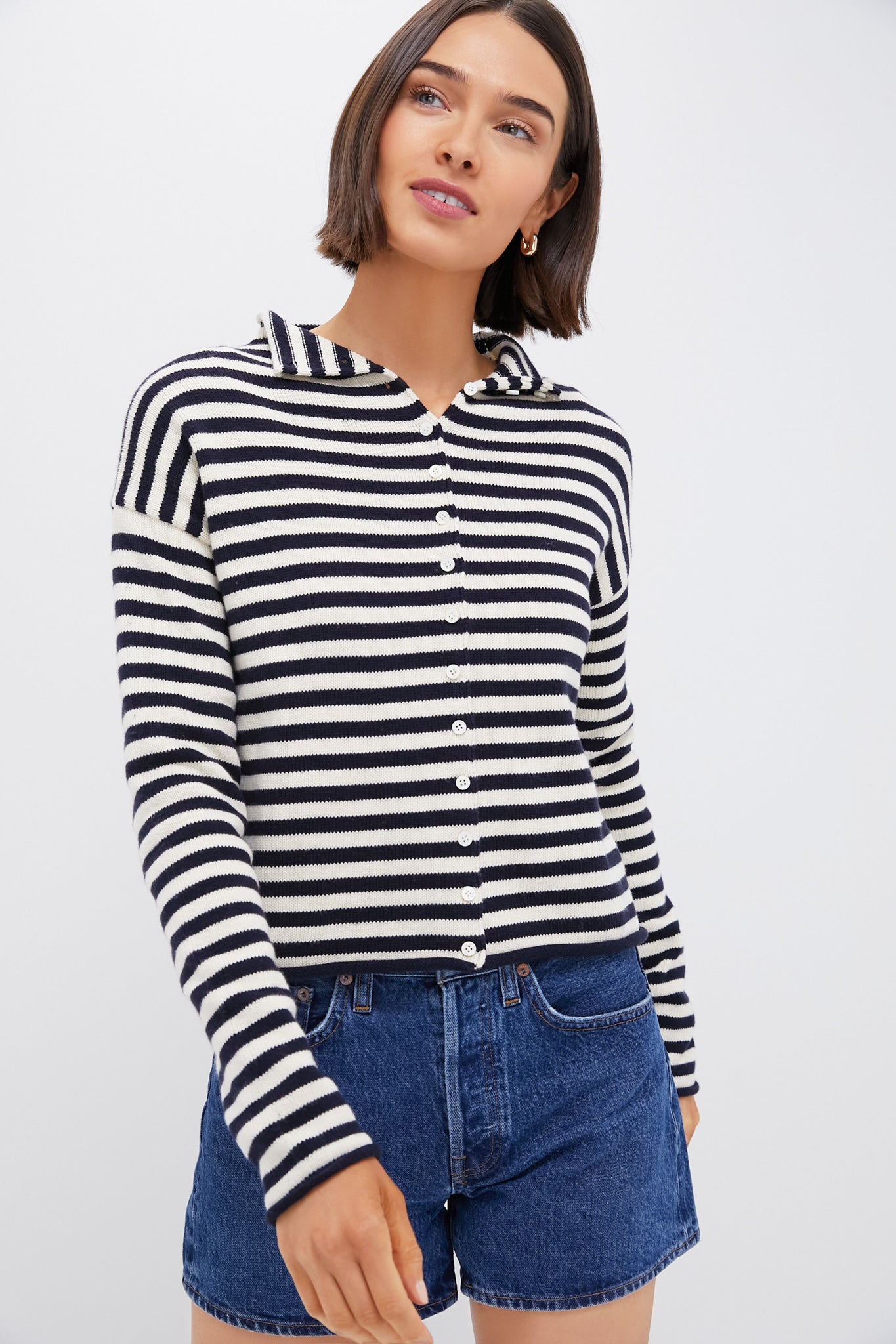 Classic and ultra-chic, the Navy Ivory Taylor Cardigan deserves a place in any wardrobe. With thin pinstripes for a touch of timeless style, as well as a spread collar and dropped shoulders for a cozy and casual feel, you'll be wearing this everywhere from school drop-offs to meetings in the office to cute lunch dates. Pro tip: Style it over a tee and tie it around your shoulders if it's a bit warm or button it up for a snuggly vibe on chilly days.