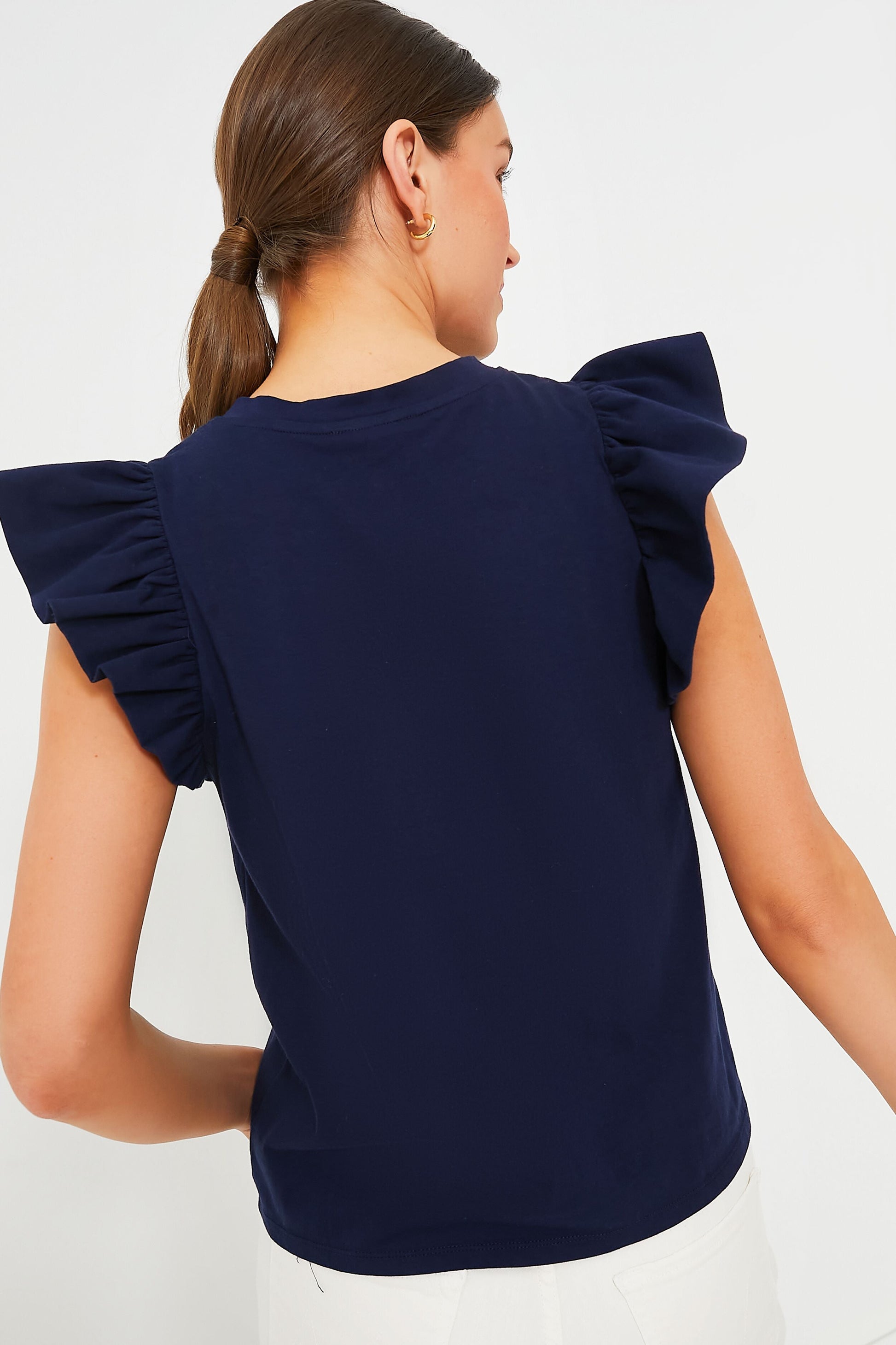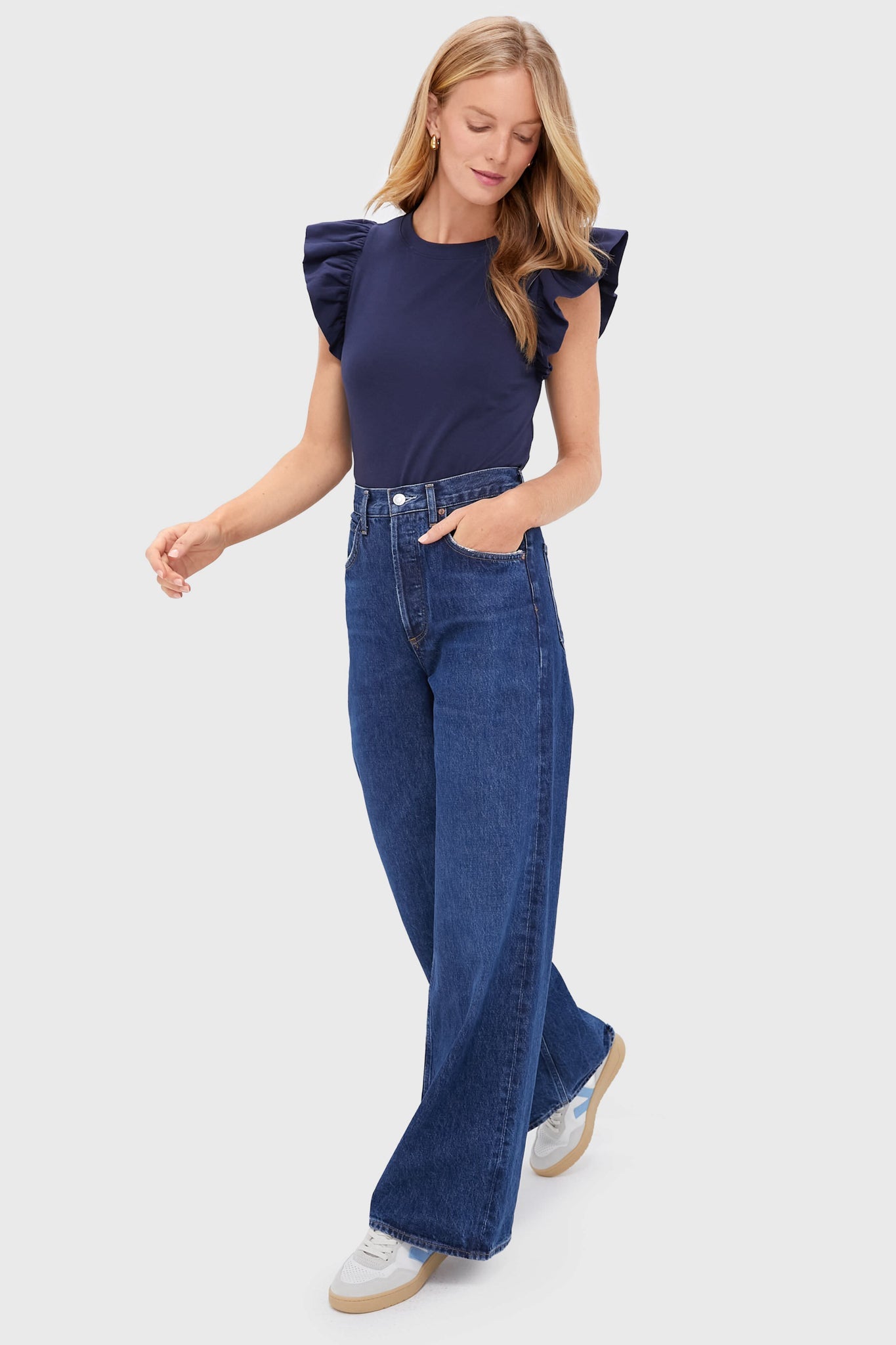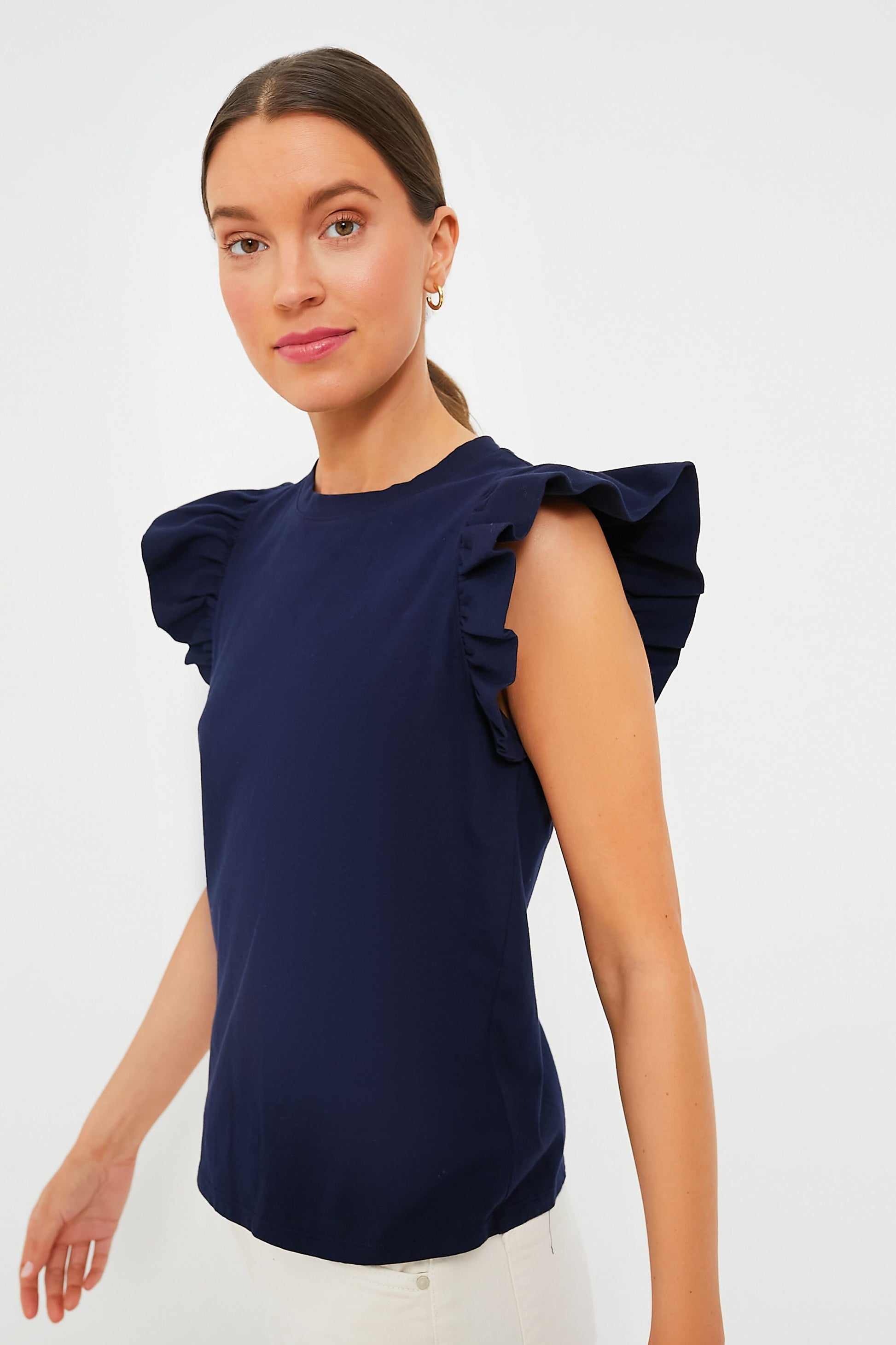 Bored of your regular-schmegular old tees? Introducing the Navy Kaia Flutter Sleeve Tee — a feminine and fresh take on a classic. With a high crew neckline that brings an extra hint of polish, a lightweight stretch knit fabric that feels great on the skin, and those fun sleeves of course, there't nothing not to love here. We are wearing it with go-to denim, cool trousers, and breezy shorts all year long. It's really just that essential.
