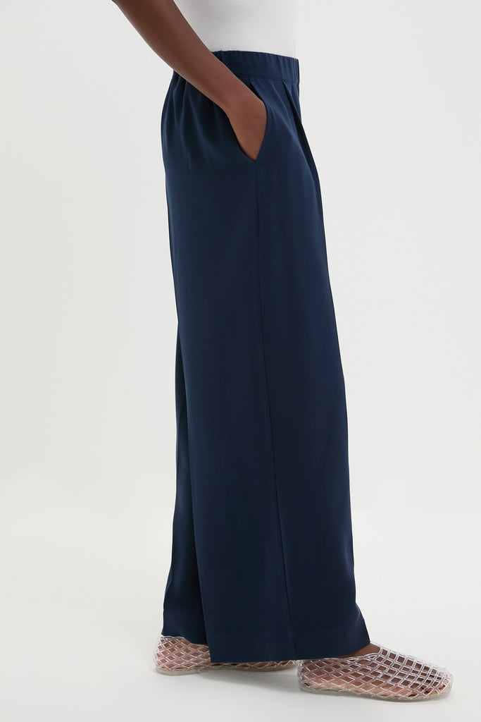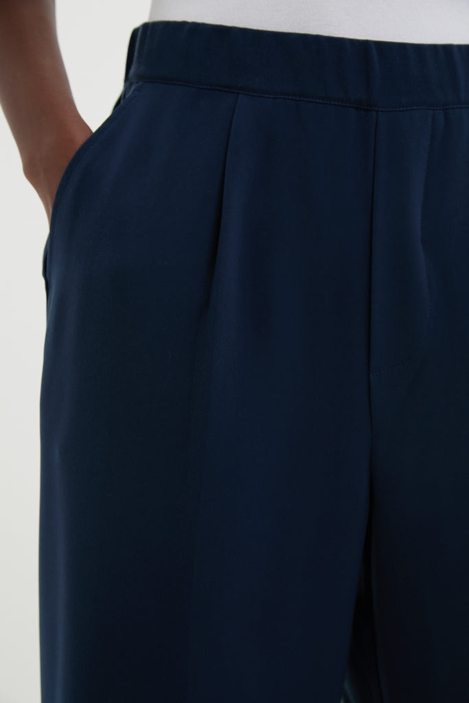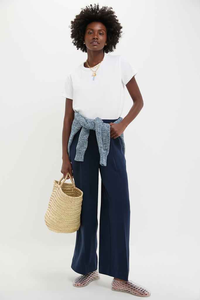 The Navy Penelope Pants are a wardrobe staple. With a comfortable elastic waistband, front pleats, and side seam pockets. These versatile pants are perfect for casual weekend coffee runs, travel days, and office going. We styled them with a tee, sweater, and tote, for a casual, yet put-together look!