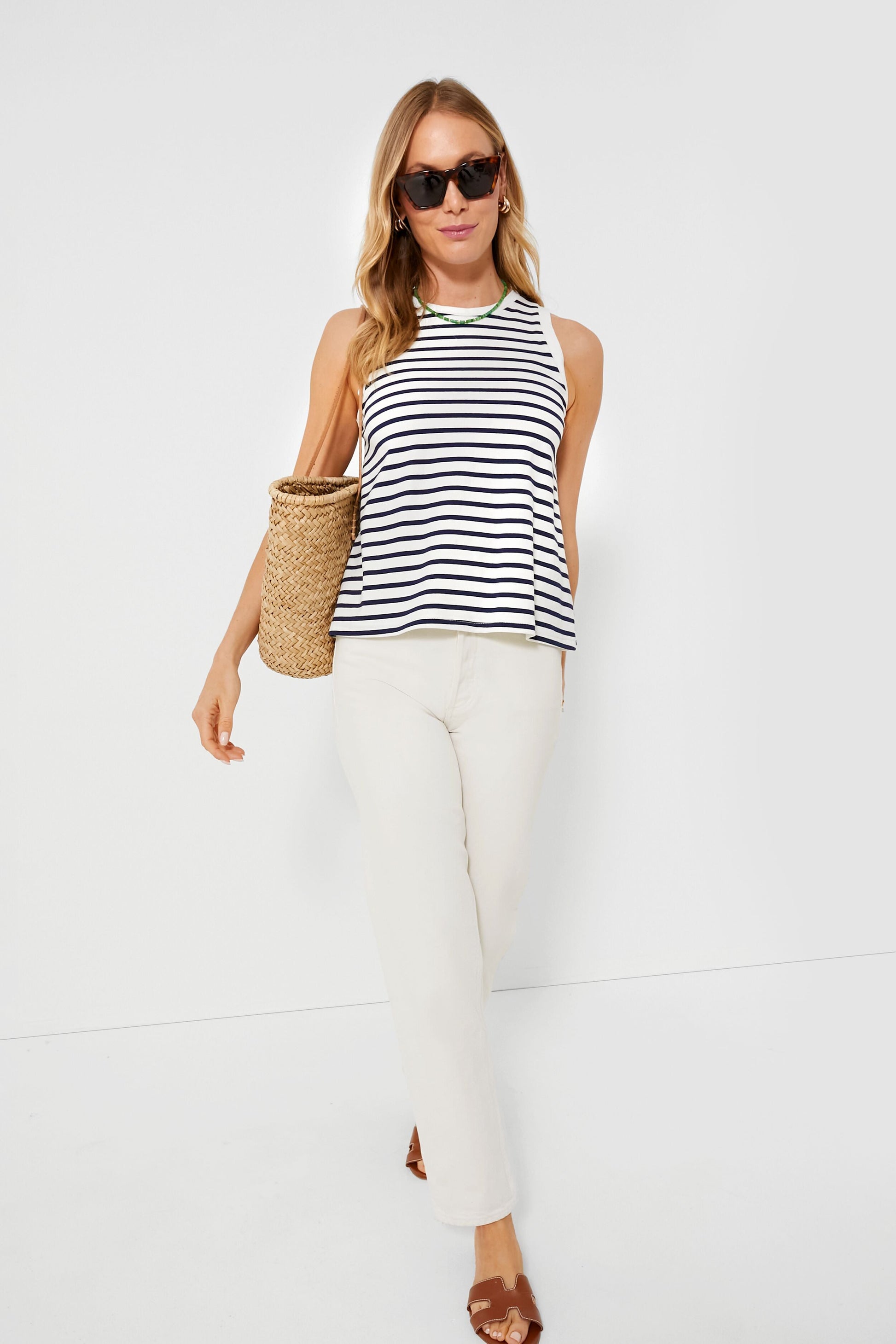 A classic tank that lasts the test of time, queue the Navy Stripe Anthos Shell. This sleeveless style is lightweight and features a high round neckline, racerback silhouette, and subtle cropped length that's perfect for high rise bottoms. Throw on with a pair of linen pants and sandals for a casually polished look, bonus points for sunnies and a luxe tote.