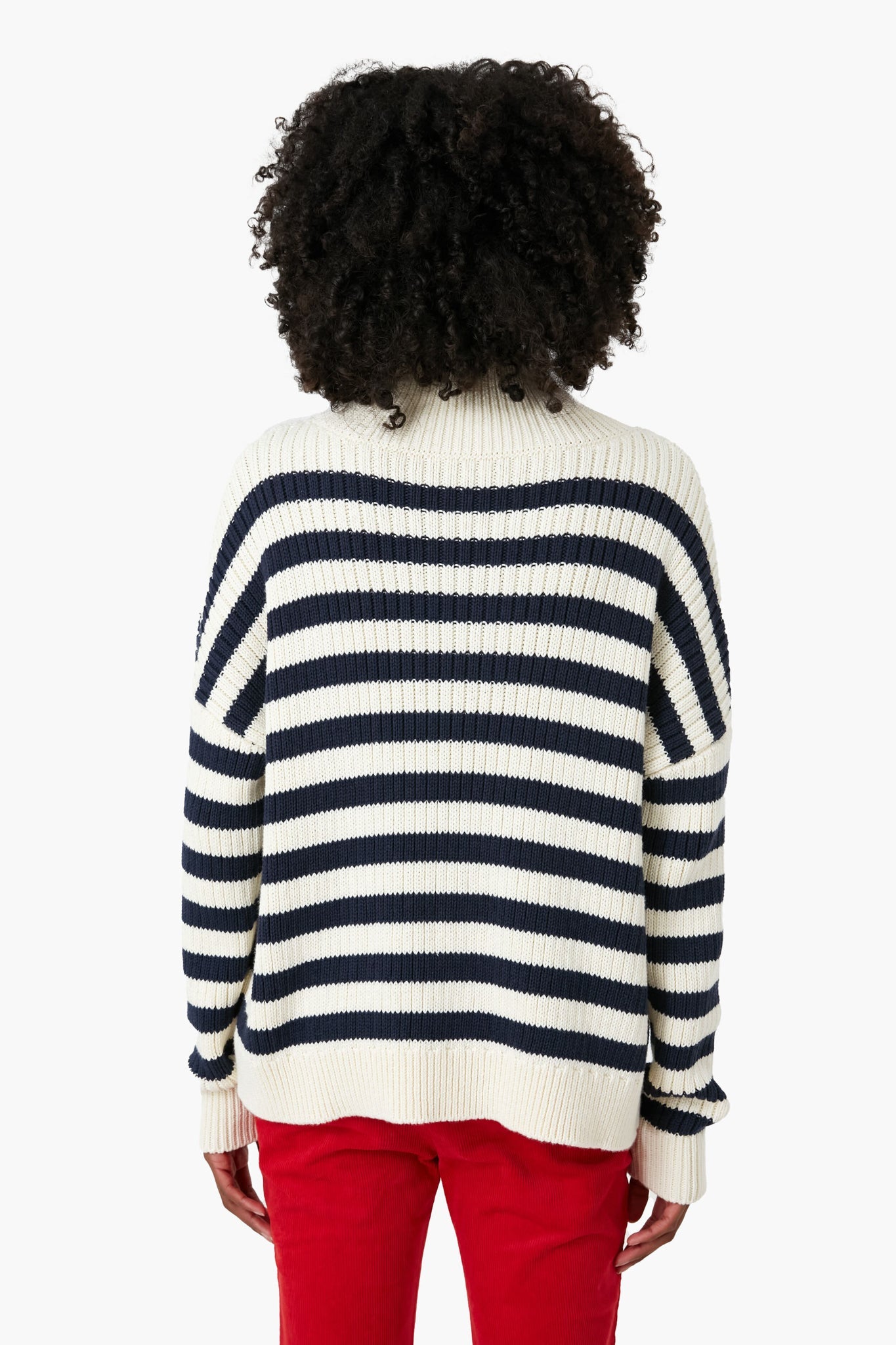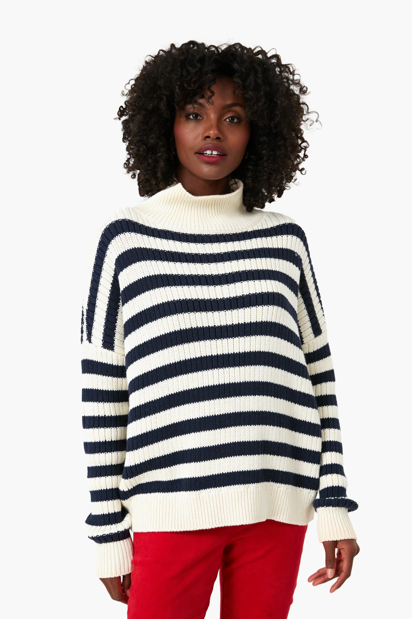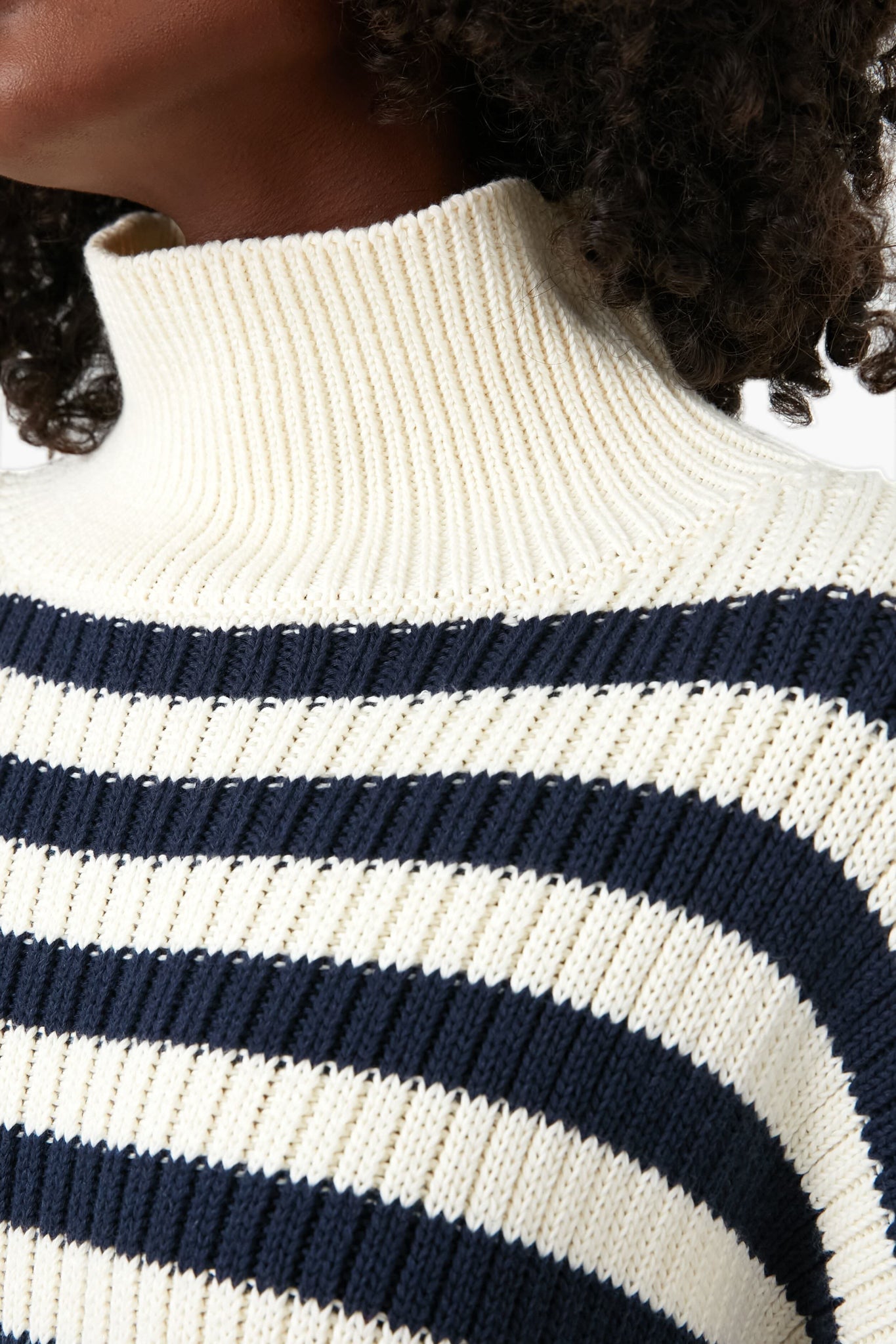 The Navy Stripe Carolyn Funnel Neck Sweater is the timeless turtleneck that you need to get you through the cold weather ahead. With a cozy ribbed knit texture, an organic cotton fabrication, and a contrasting navy and ivory stripe pattern that looks great styled a number of ways, this sweater is truly a no-brainer. Wear this with denim, over a dress, with a mini skirt, with boots, with sneakers, under a wool coat or a puffer jacketâ¦you get the point, it goes with anything.
