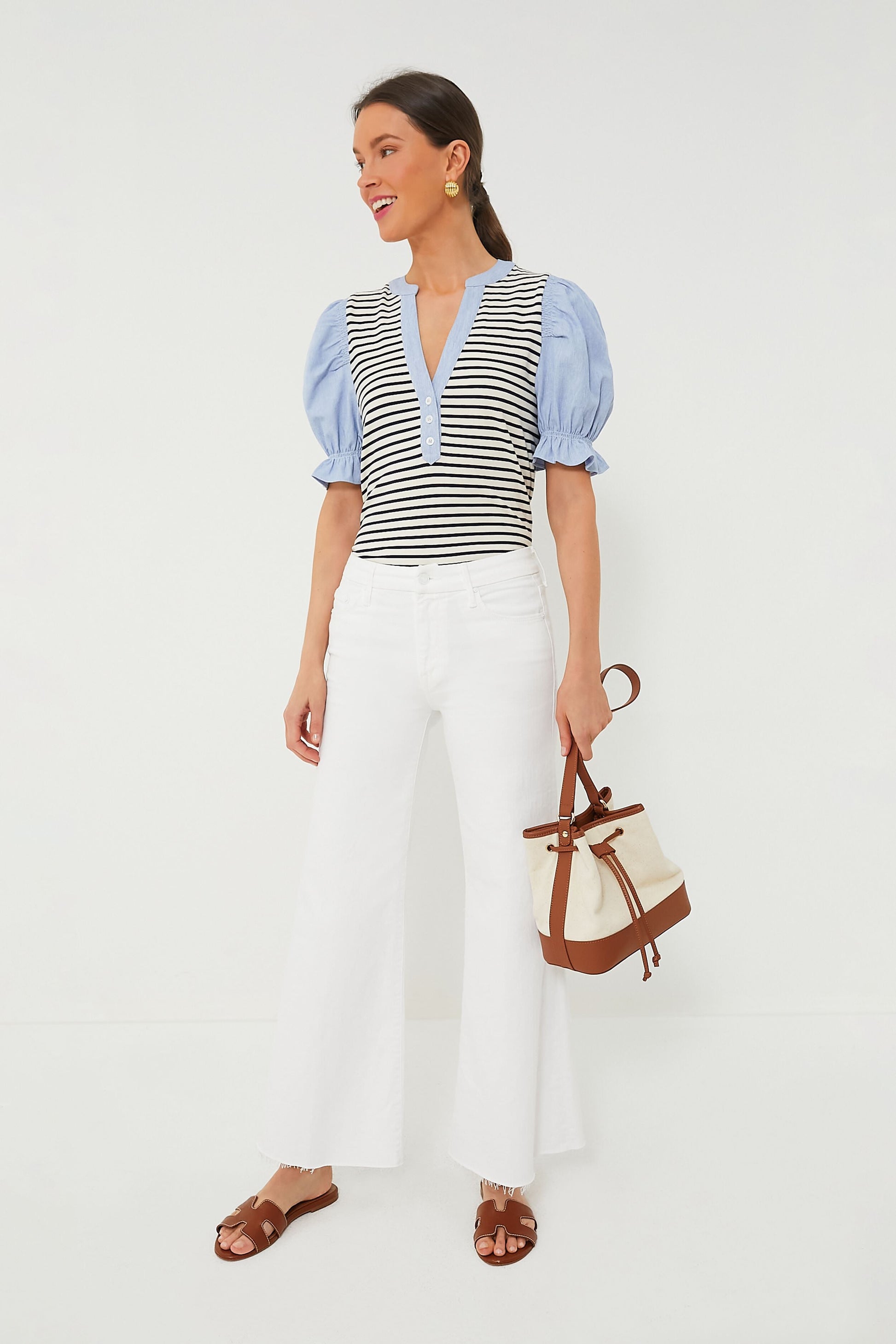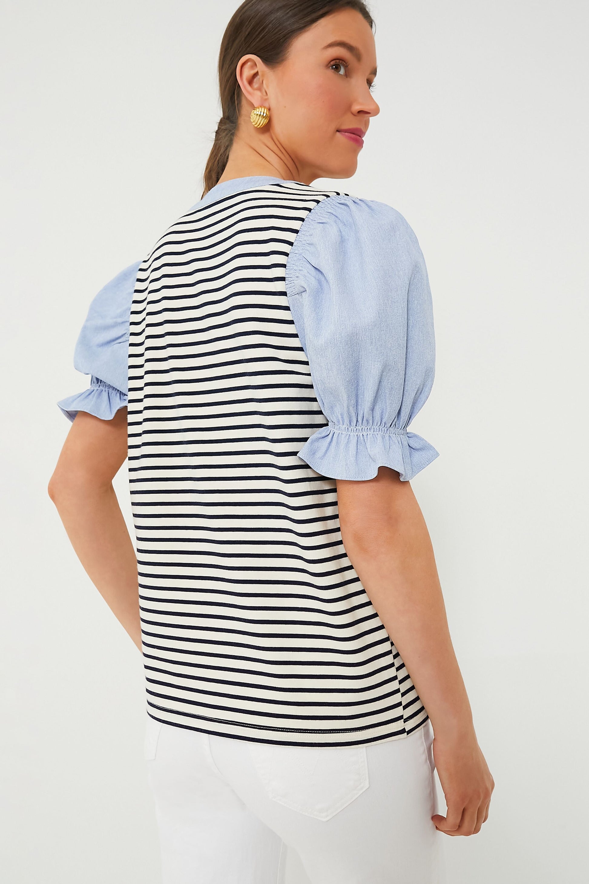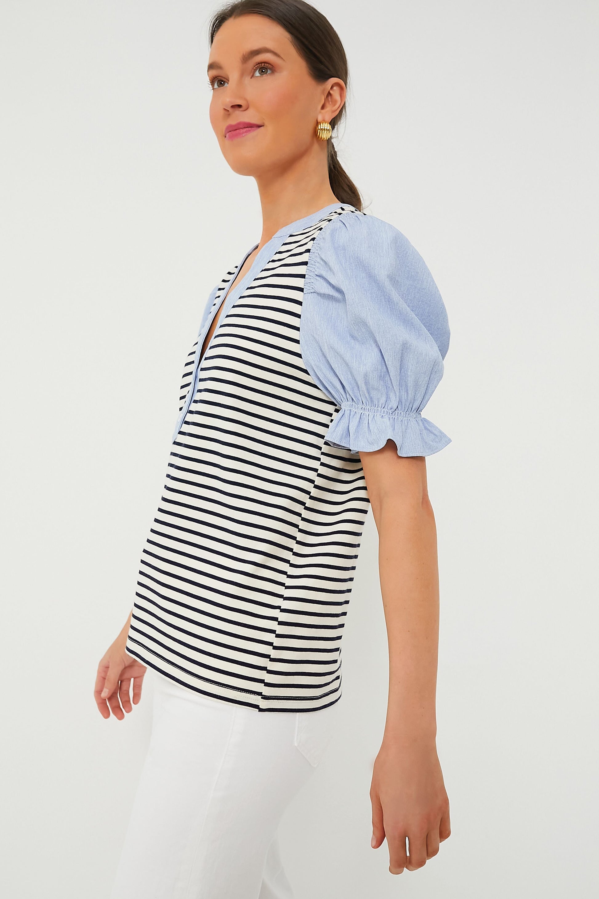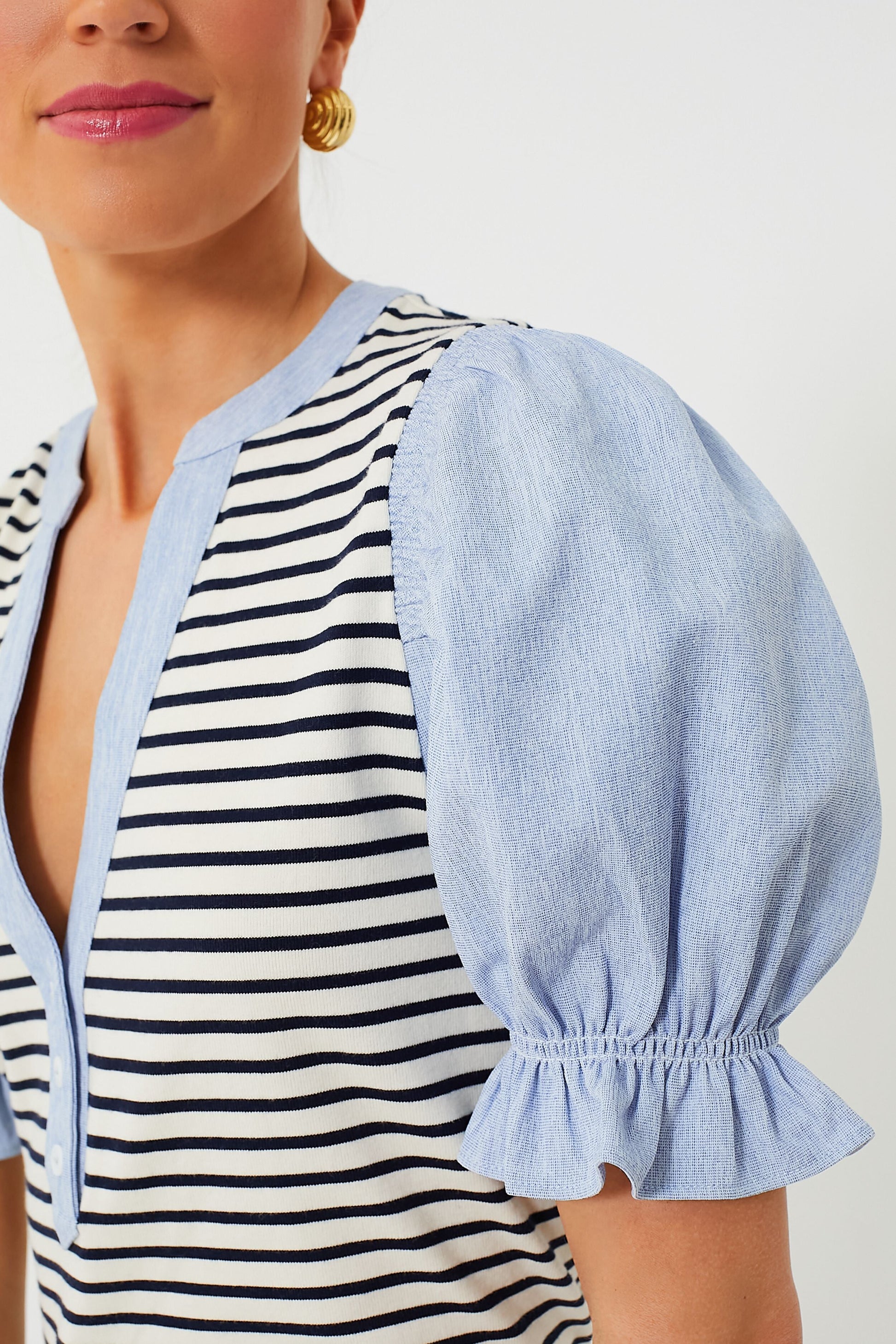 Texture play, feminine details, elevated yet playful - the Navy Stripe Livia Puff Sleeve is at the top of our list for multitasking tops. Easy to dress up or down, style it tucked in or left out, this blouse is versatile and seasonless, not to mention goes with anything. The ribbed body is contrasted by the on-trend puff sleeves that add fun and intrigue. Wear this tee with denim, mini skirts, leggings– all it's missing is your personalized style finishes.