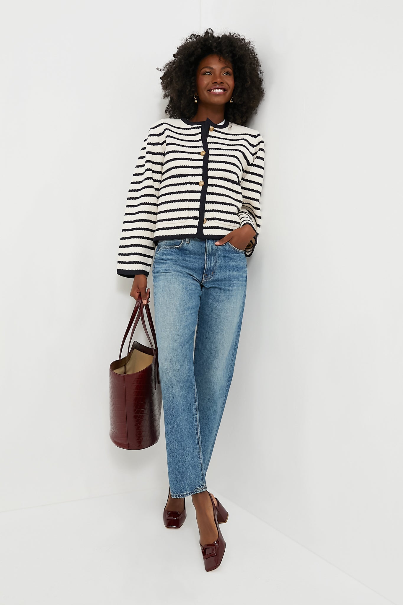 Classic, feminine, and tasteful describe this Striped Cardigan. The sleek silhouette and cropped hem make it the perfect pair for your high waisted denim, and the navy stripes and gold buttons allow you to look chic with minimal effort. Pair with stud earrings and ballet flats, and you are ready to take on the day in style.