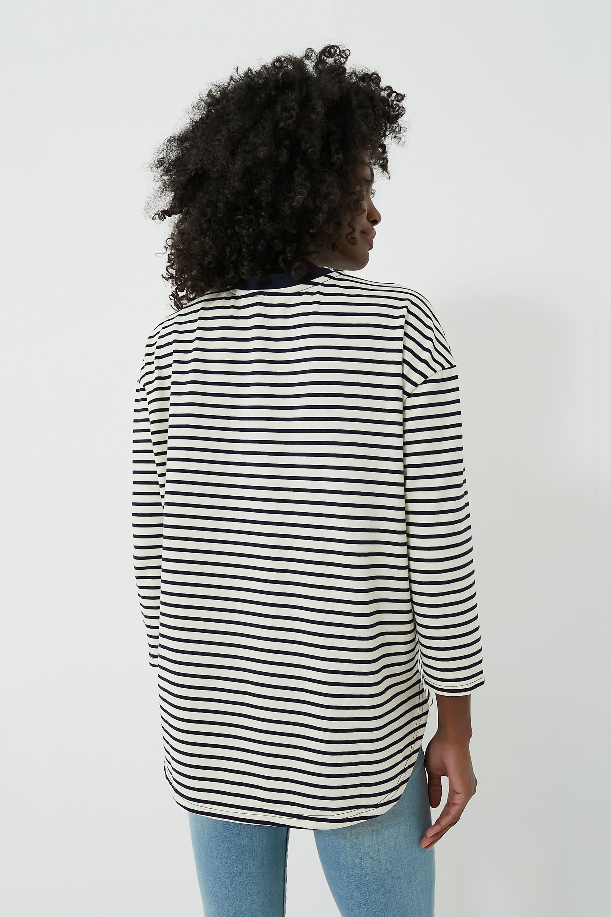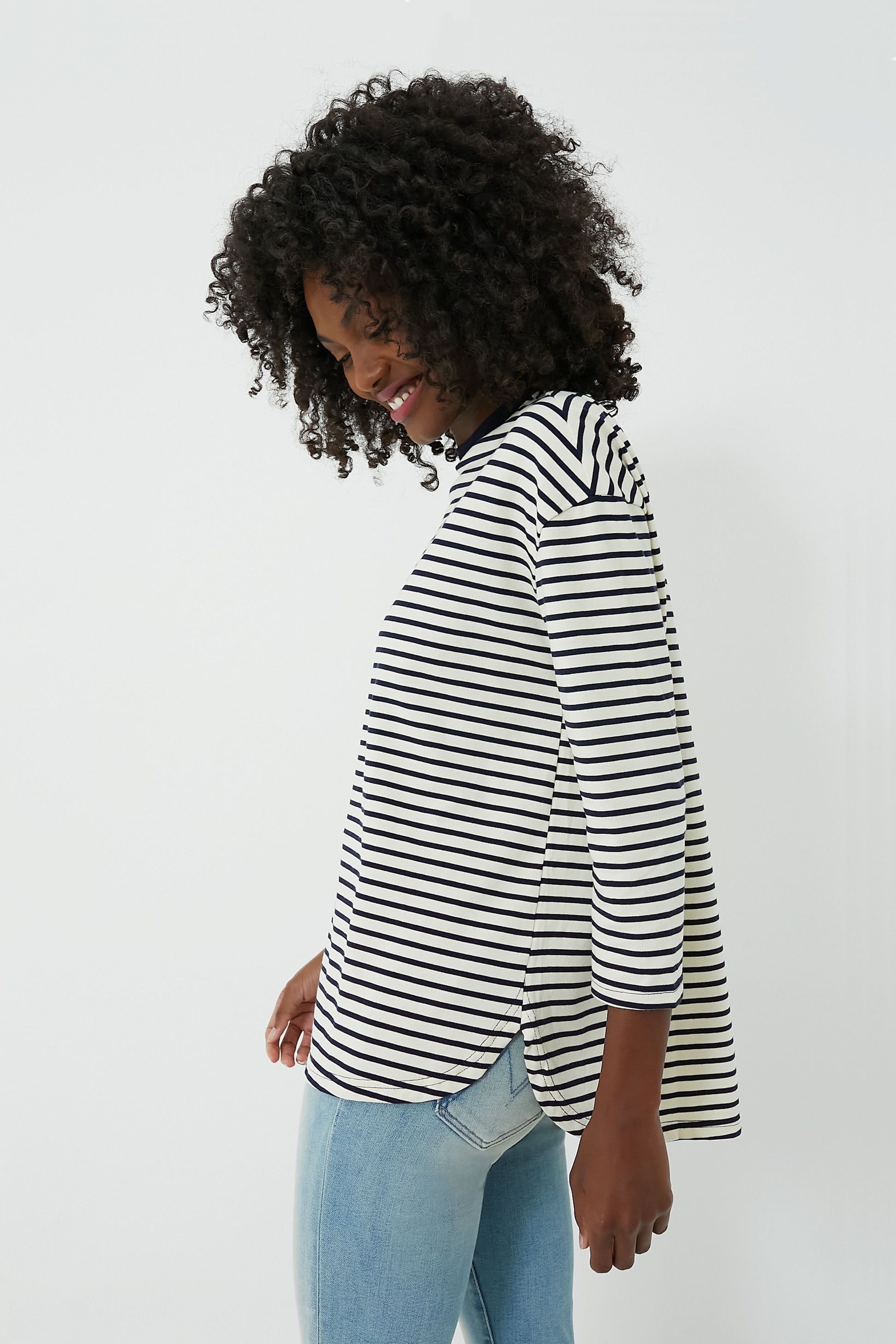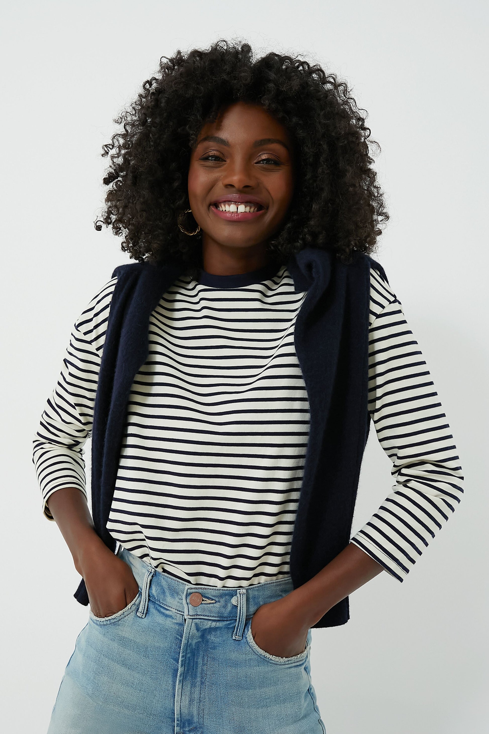 A sporty swap for your go-to t-shirts, the Navy Striped Knit Popover adds a little something extra to your dressed down days. Creamy whites and navy hues create a vintage feel while the modern stretch knit fabric and swing shape guarantees this to be in your wardrobe for years to come. We are pairing this with trousers and boots for running errands on low key days and adding a crisp button up underneath for a fun play on layering for brunch with friends.