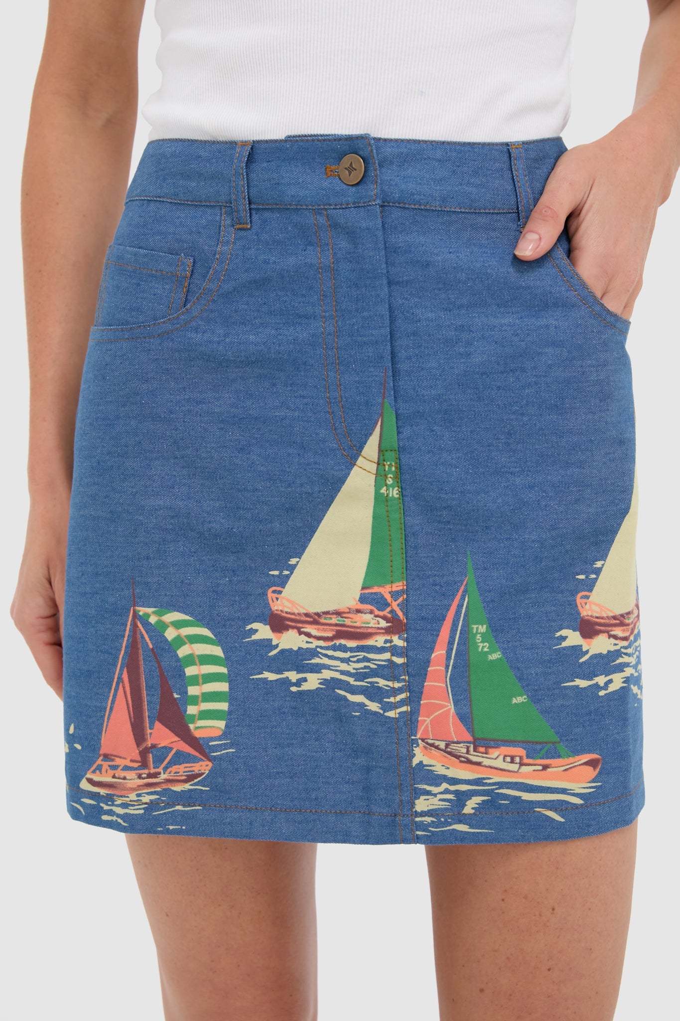 The Newport Regatta Pippa Mini Skirt takes a timeless silhouette and gives it a nautical lift with a charming boat print. Easy to dress up or down, it's the kind of piece that works just as well with a tucked-in tee and sneakers as it does with a crisp button-down and sandals. Perfect for beach days, boat rides, or just pretending you're on one.