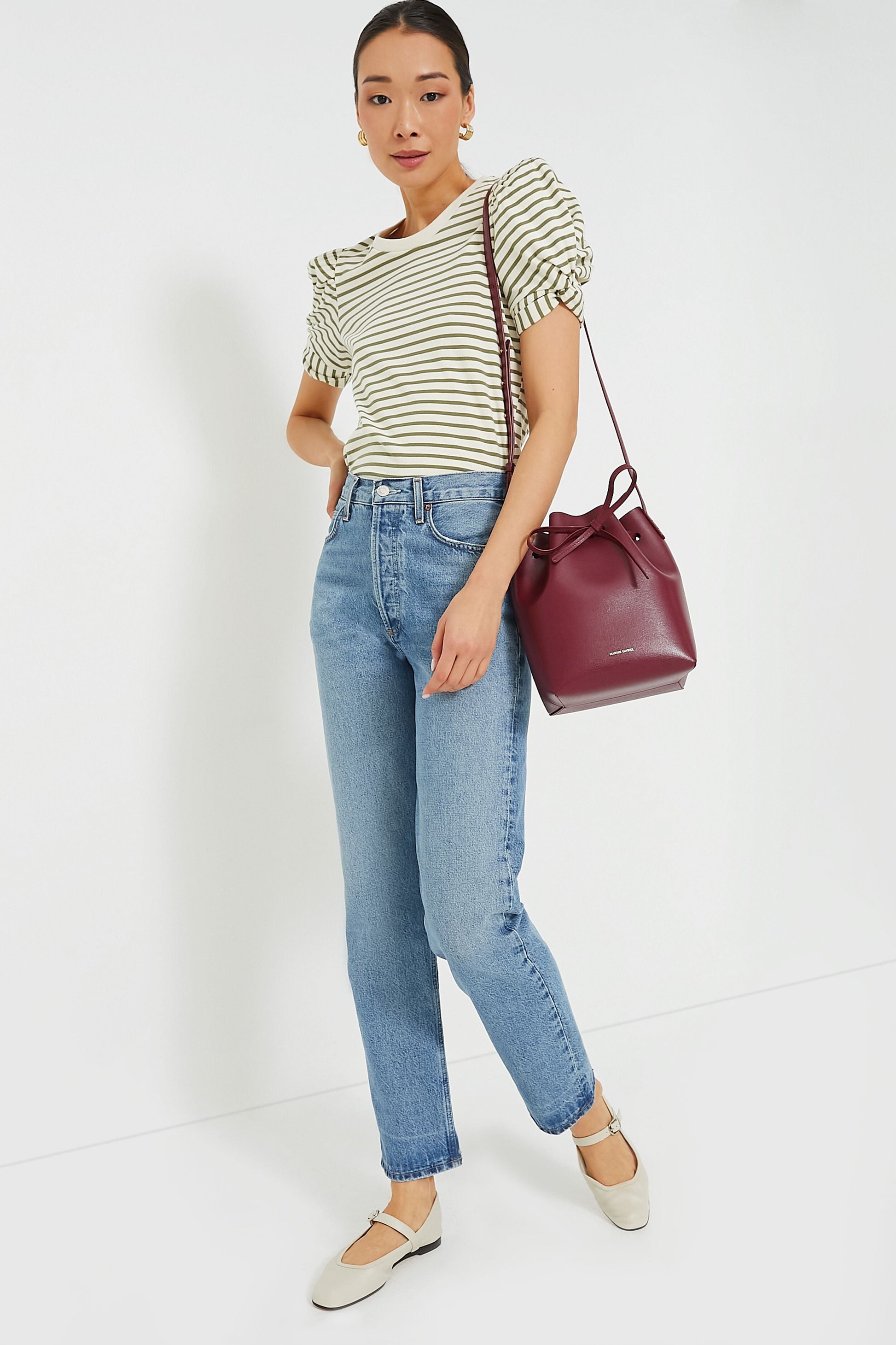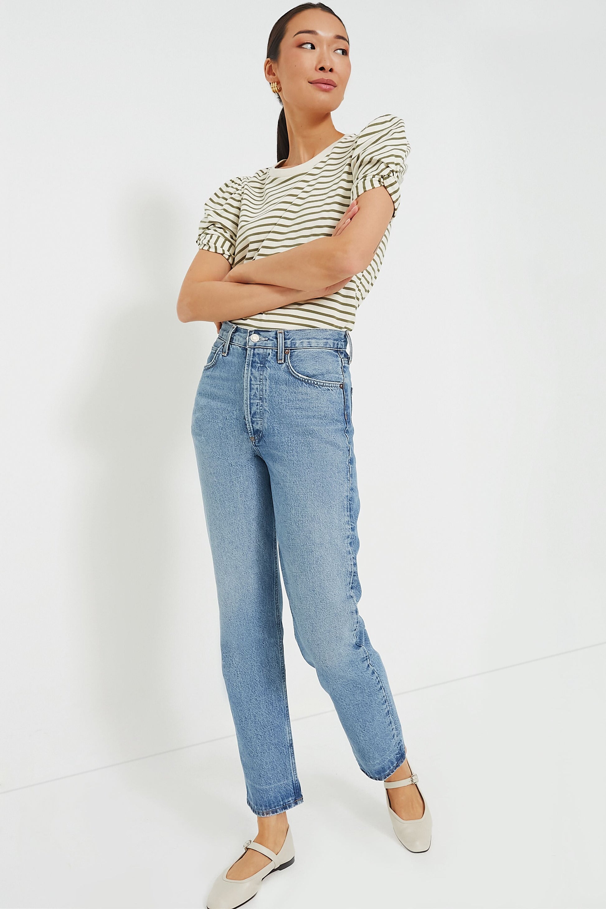 Basic yet fun, the Olive Striped Vesty Puff Short Sleeve Crewneck is the casual cool number you need to update your wardrobe. Featuring slightly puffed sleeves with a knot tie detail and a loose fit, you'll constantly reach for this piece time and time again. From errands to lunch, we are pairing this with your go-to denim and tote.