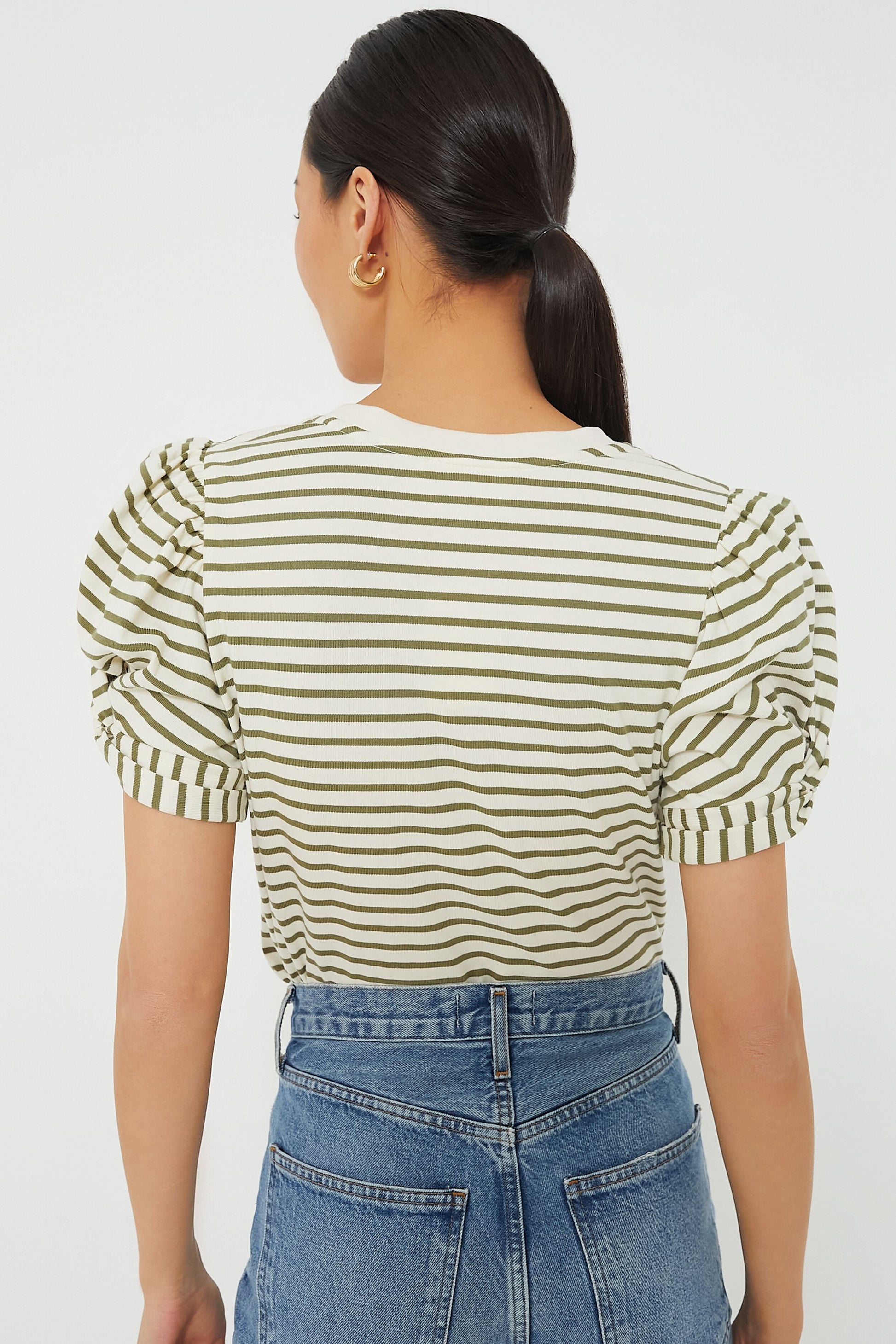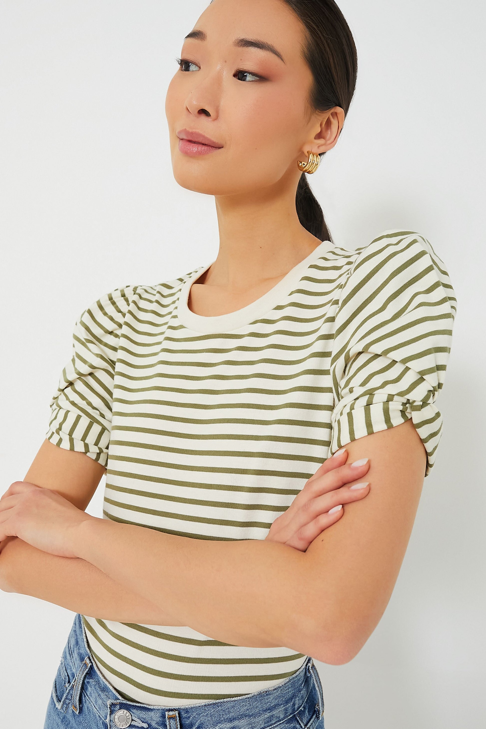 Olive Striped Vesty Puff Short Sleeve Crewneck