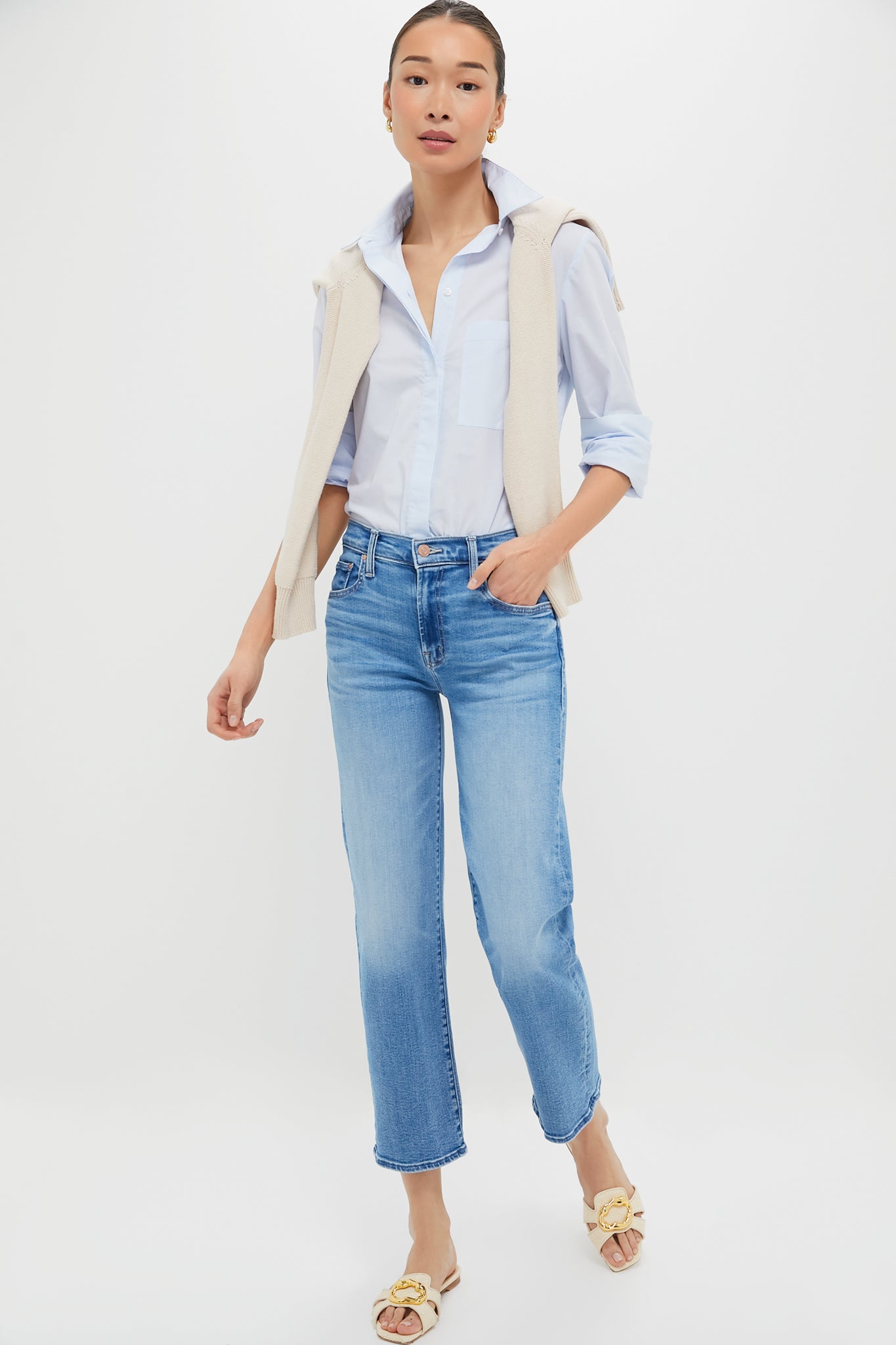 The Out of the Blue The Mid Rise Rambler Zip Ankle Jean is a classic mid blue jean with whiskering and fading at the knee. Featuring a mid-rise, straight leg, and clean hem, these are sure to stand the test of time. With endless opportunities for styling, pair with a blouse and sandals during warmer months, or a cashmere sweater, blazer and booties or flats for colder temperatures!