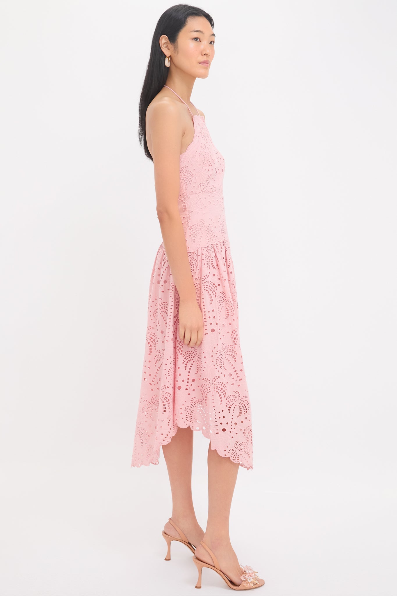 This stunning midi boasts a charming halter neckline that gracefully frames the shoulders, while intricate eyelet detailing weaves through lush palm patterns in blush pink. The curved hemline invites a sense of playfulness, perfect for sunlit strolls or moonlit evenings. Add chunky heels and raffia accessories for the ultimate tropical-inspired ensemble.