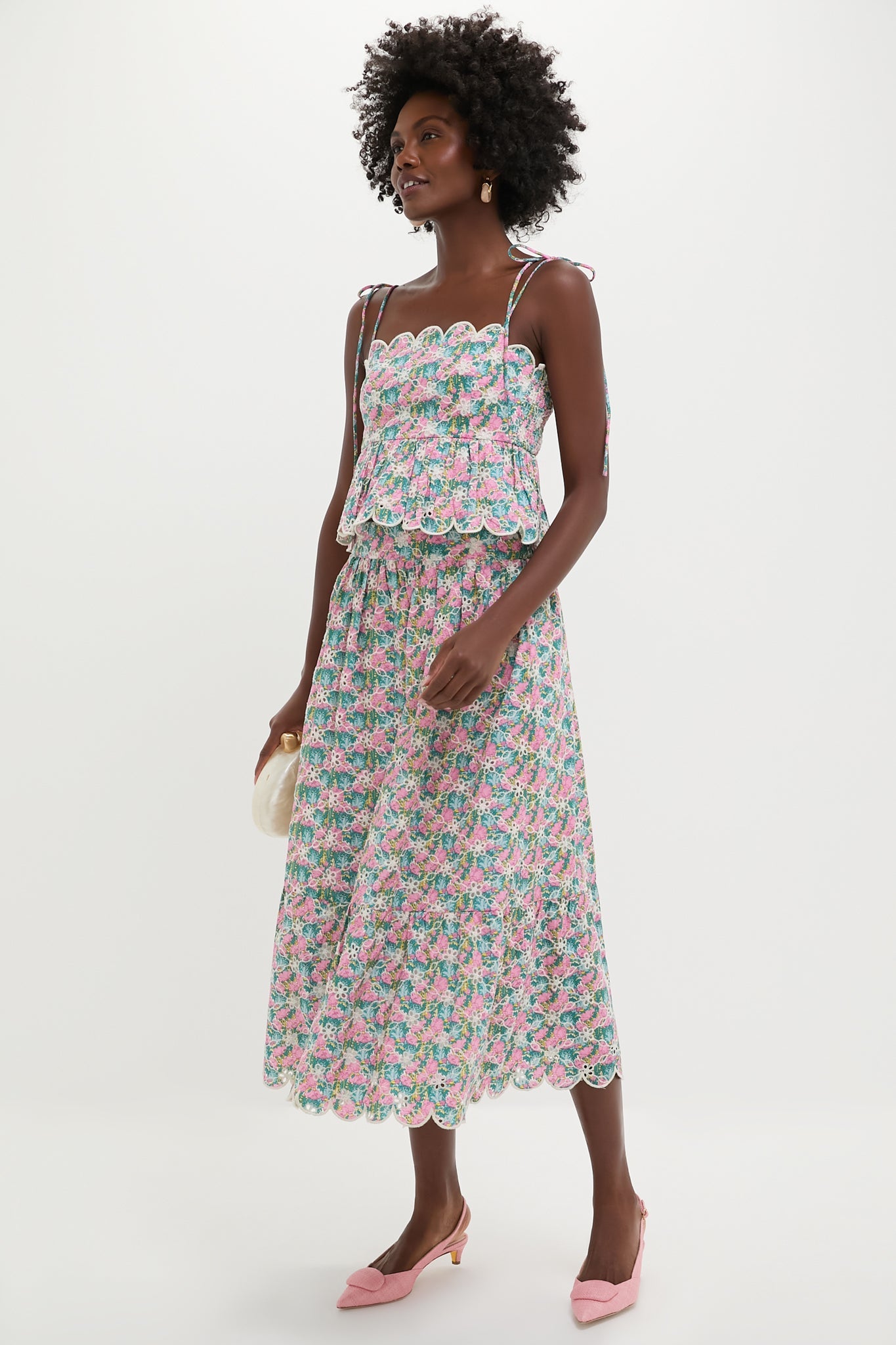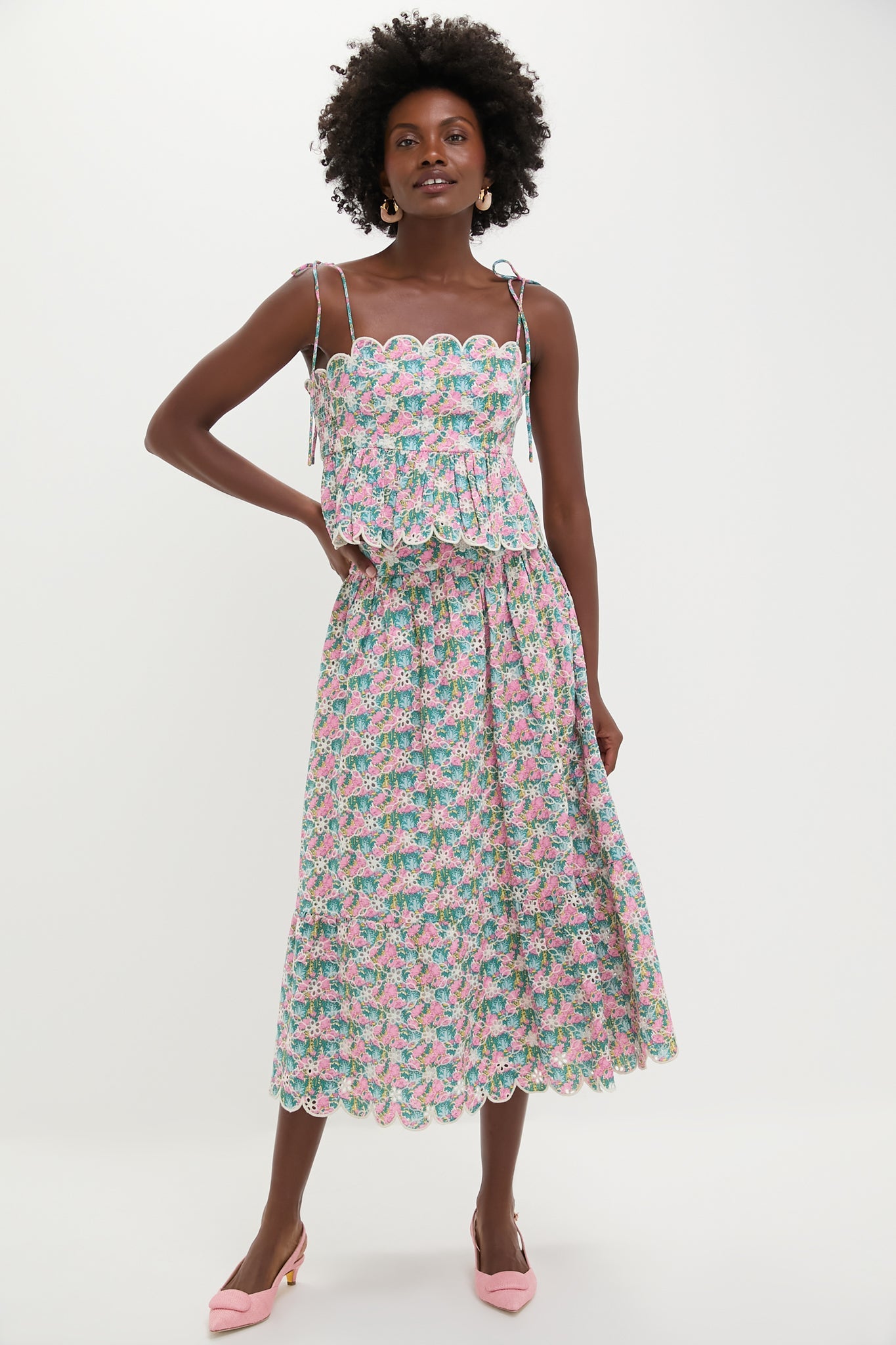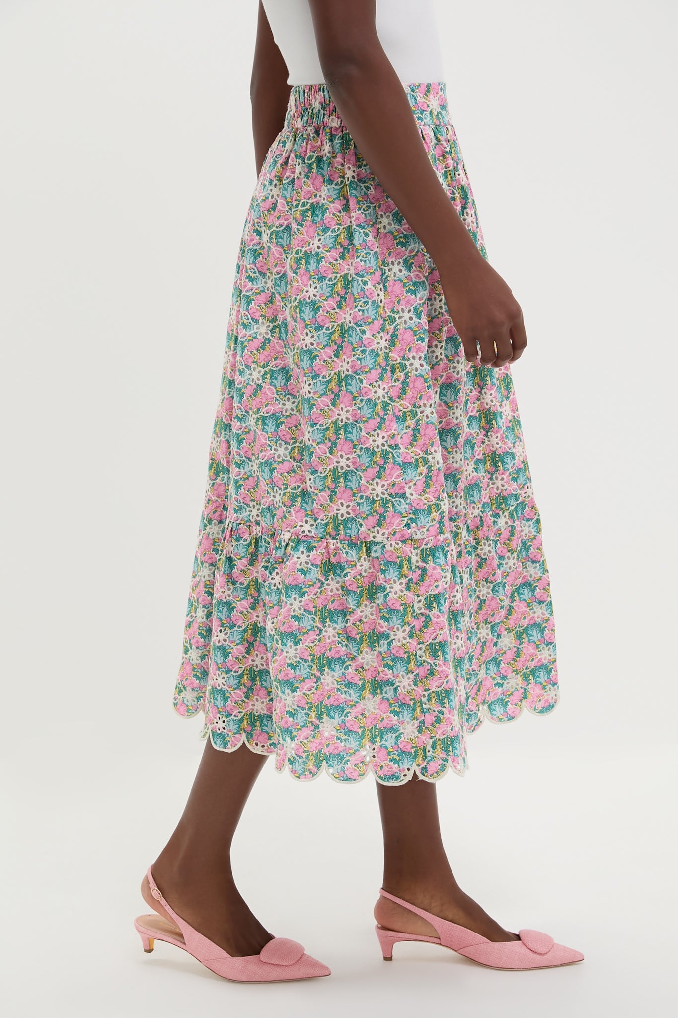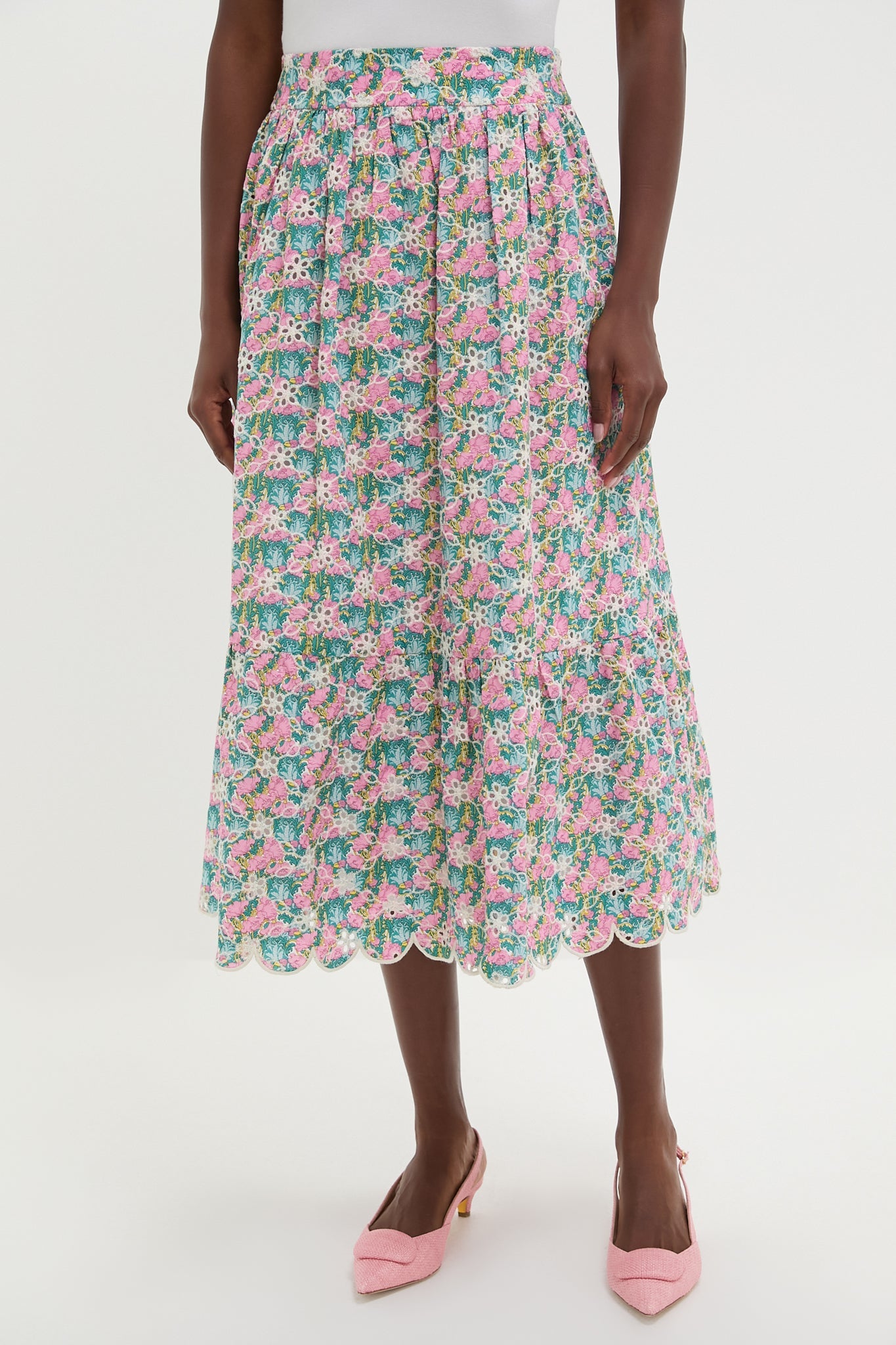 Pink Multi Floral Scalloped Eyelet Carter Midi Skirt