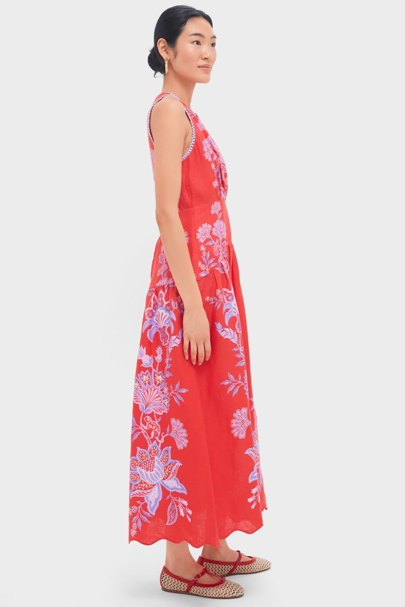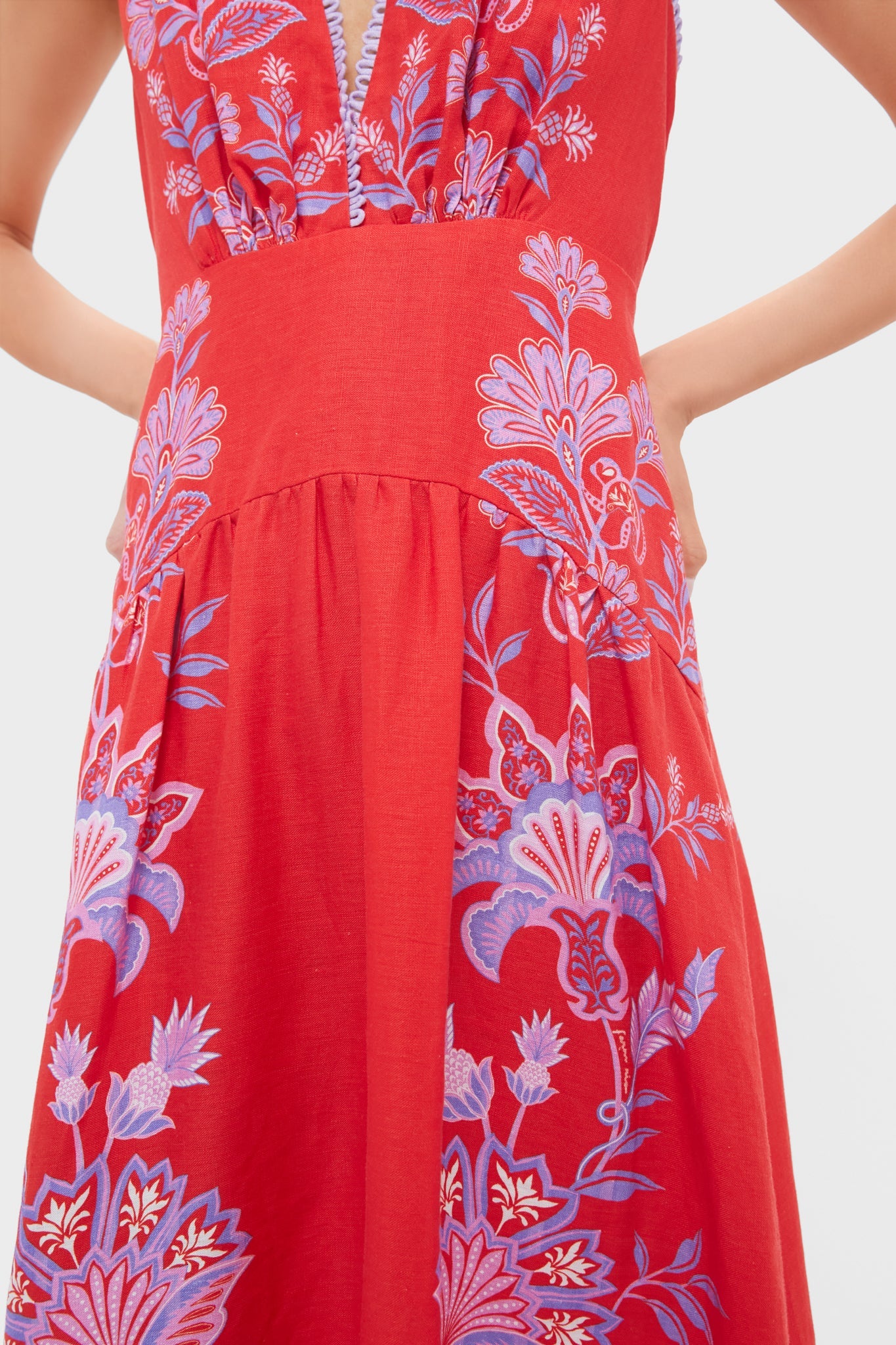 The Porcelain Garden Red Midi Dress is an eye-catching style with a deep V-neckline, subtle drop waist, and scalloped hem. The colorful blend of reds and purples makes this a truly standout style. Pair with heels, sandals, or flats for endless occasions!