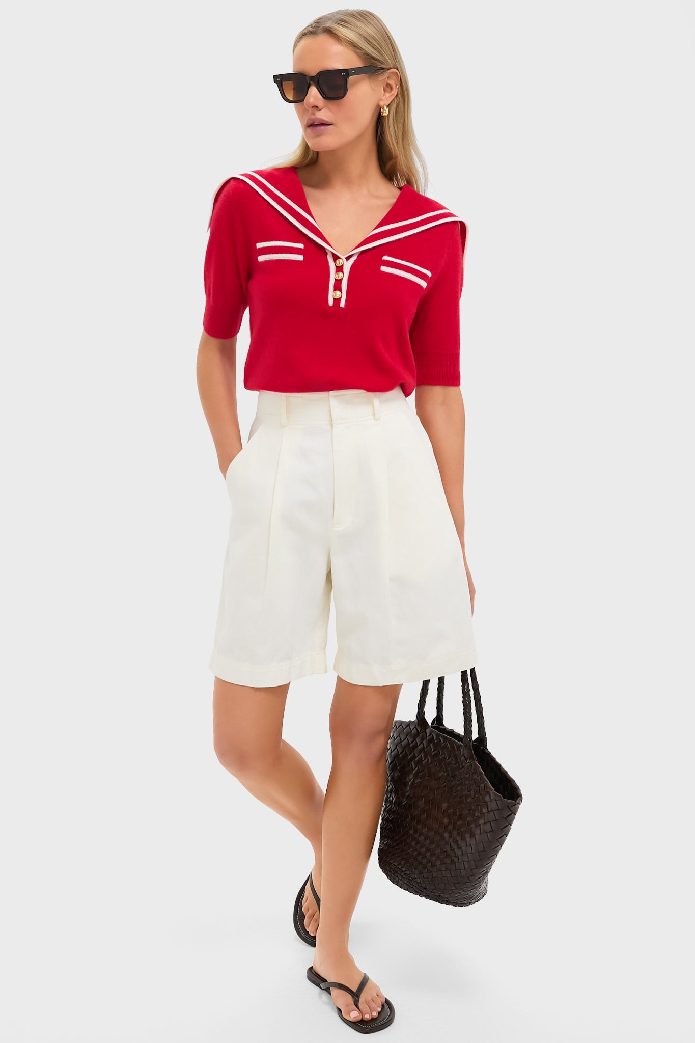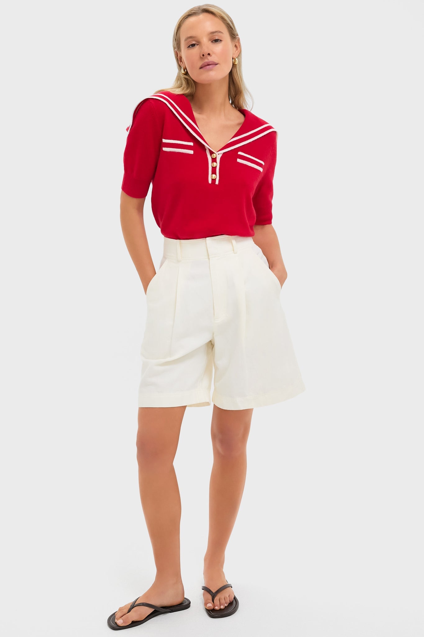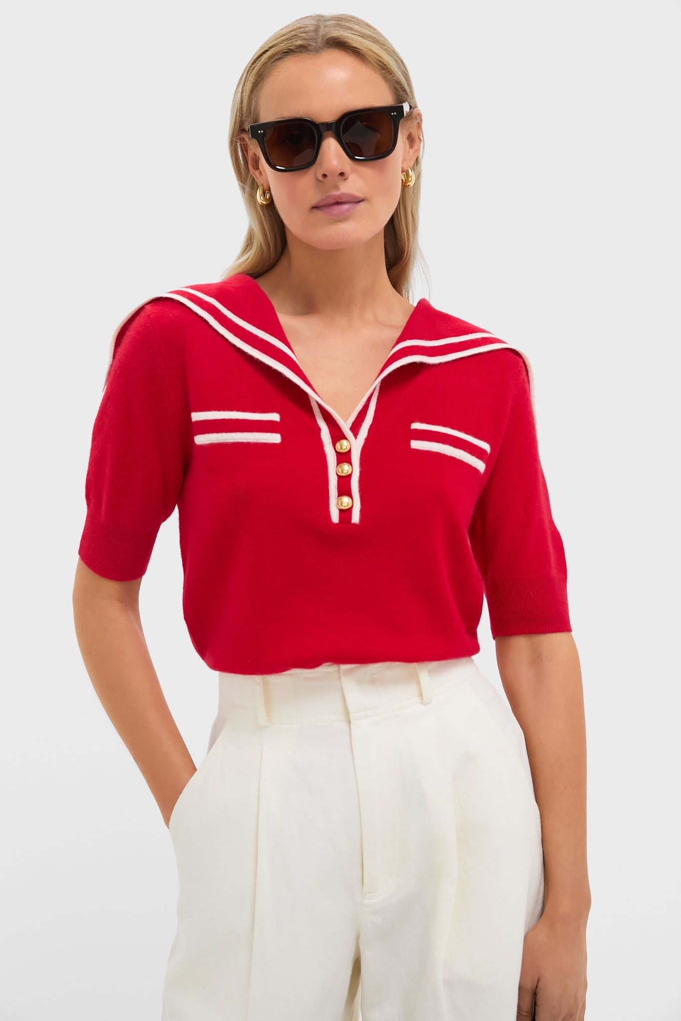 This Sailor cashmere sweater with contrast trim and a statement sailor collar brings effortless nautical charm to any outfit. The gold buttons add just the right amount of polish, making it perfect for anything from a seaside escape to a coffee run. Throw it on with denim and sunnies, and you're good to go.