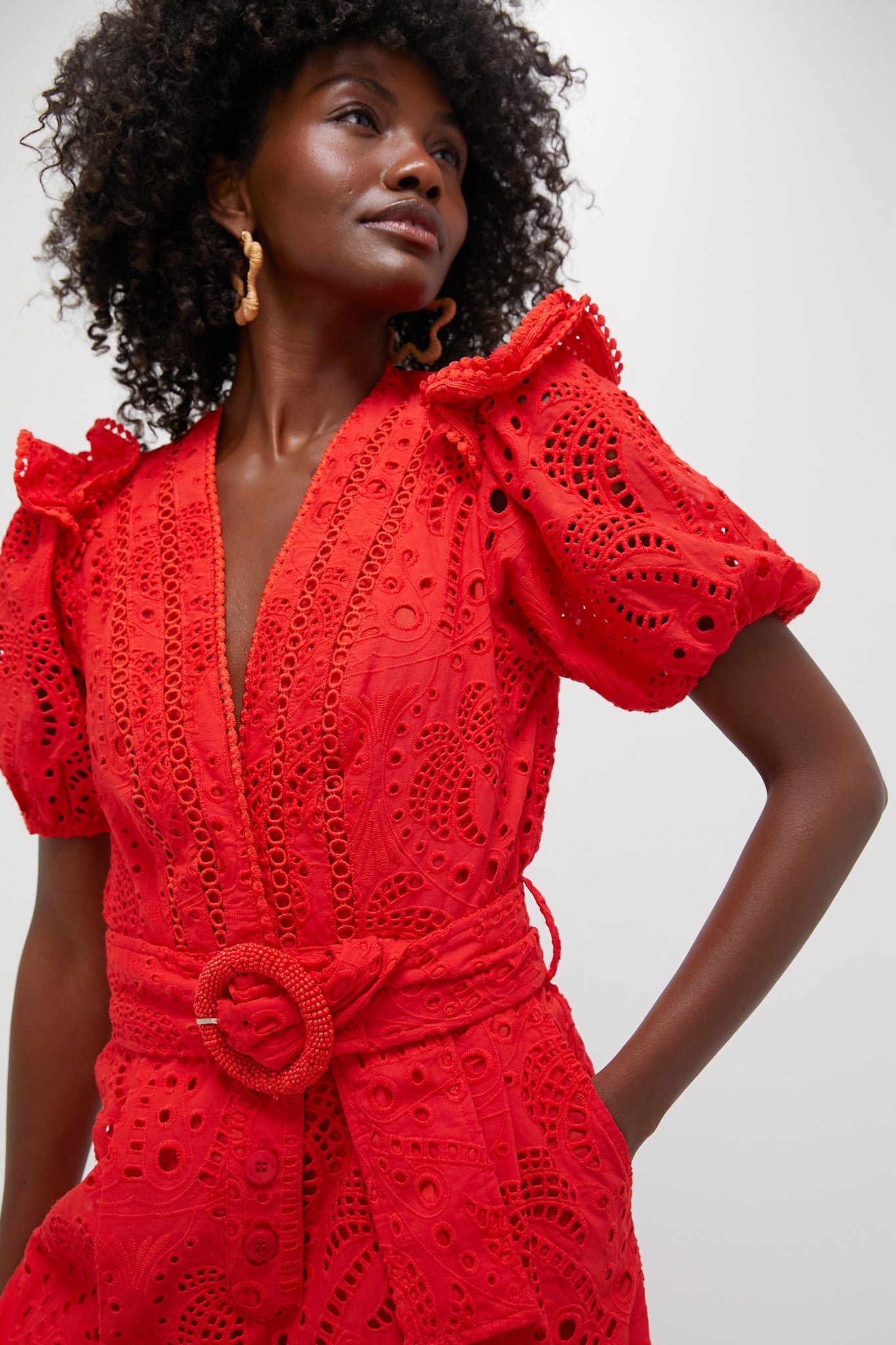 Step into elegance with the Red Eyelet Beaded Belt Romper by FARM Rio.