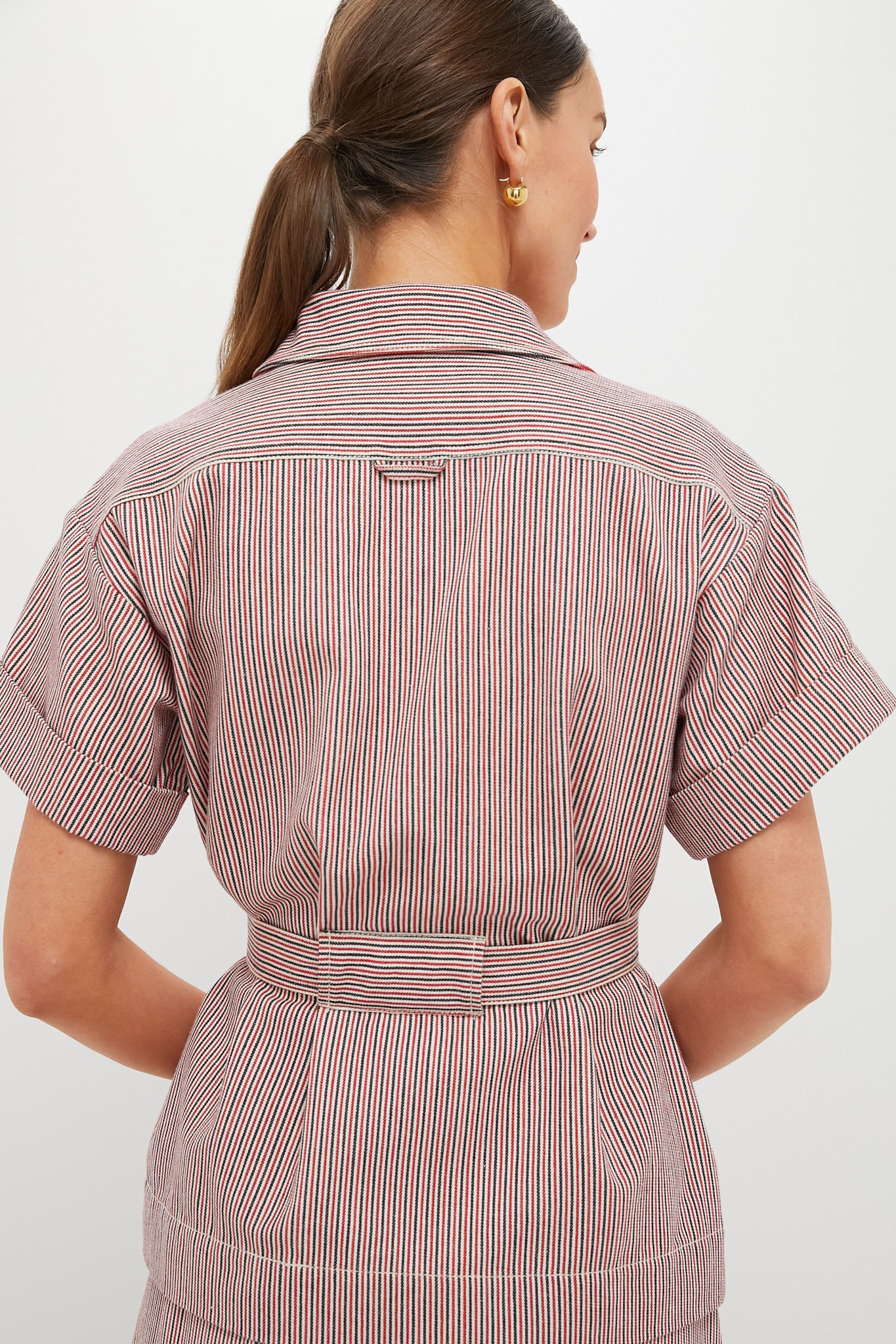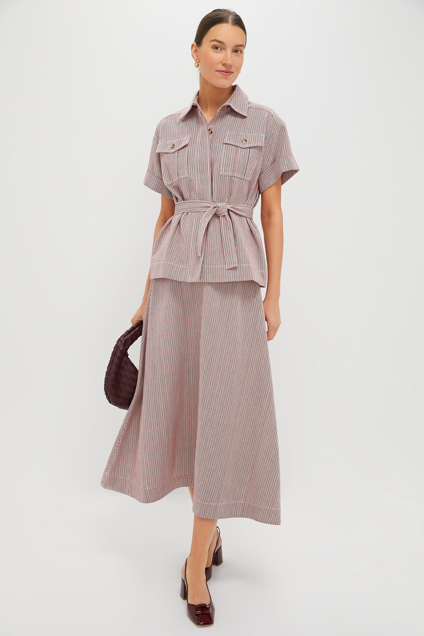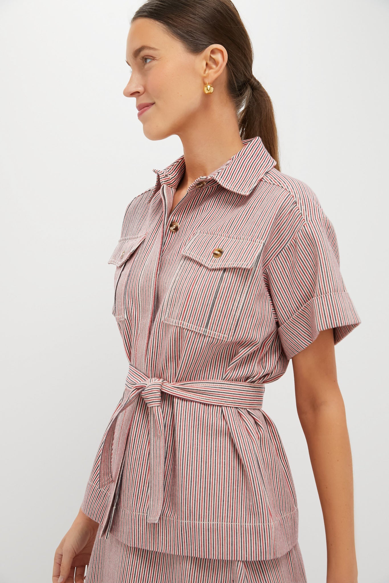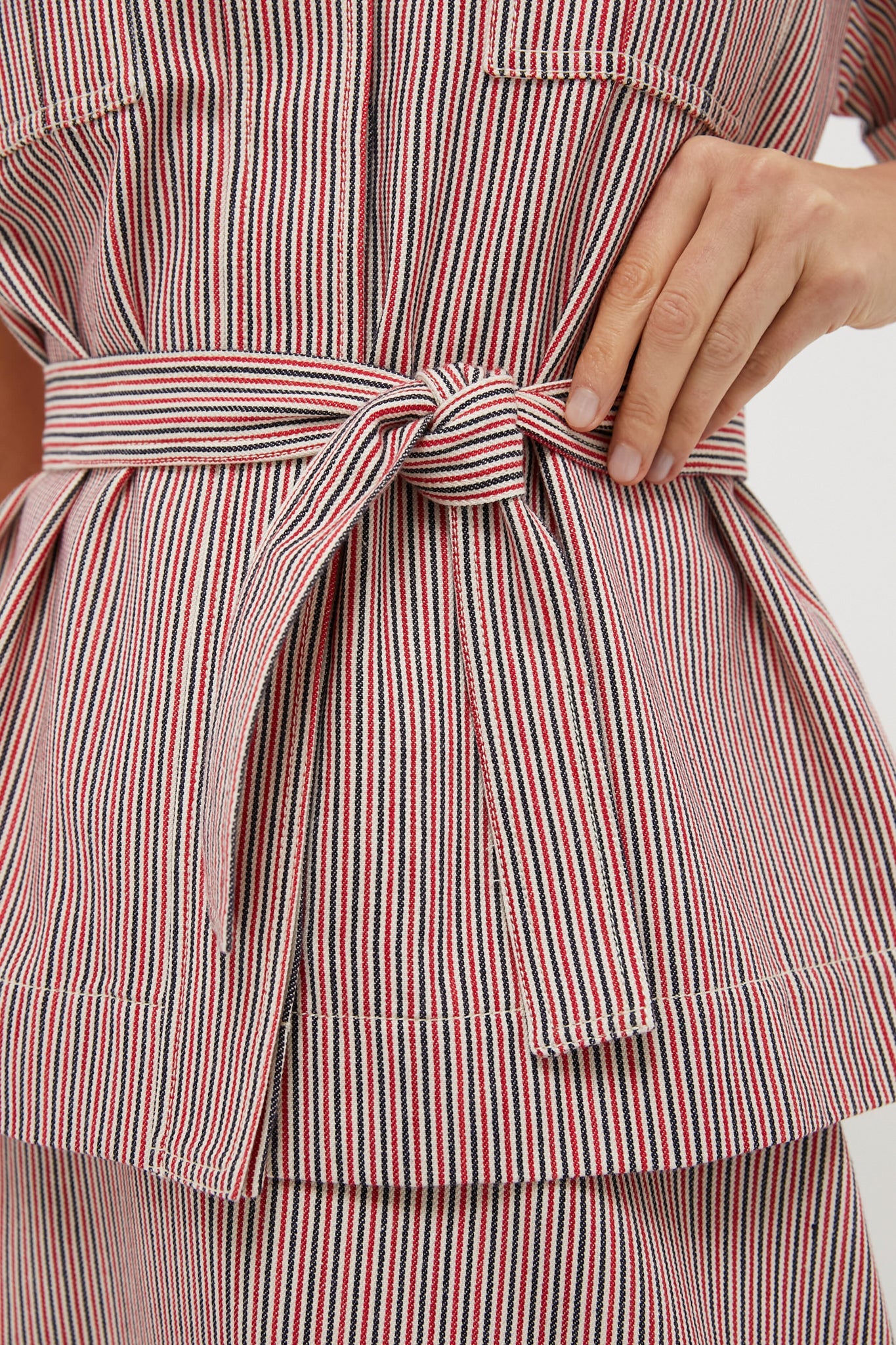 The Red Stripe Belted Ava Jacket is a unique style that strikes a perfect balance between easy and elevated. Made from a structured fabric, this top boasts short cuffed sleeves, double-breasted front flap pockets, and a self-tie waist belt. Pair with denim and ballet flats, or dress up with heels and the matching Red Stripe Evelyn Midi Skirt for a coordinating ensemble.