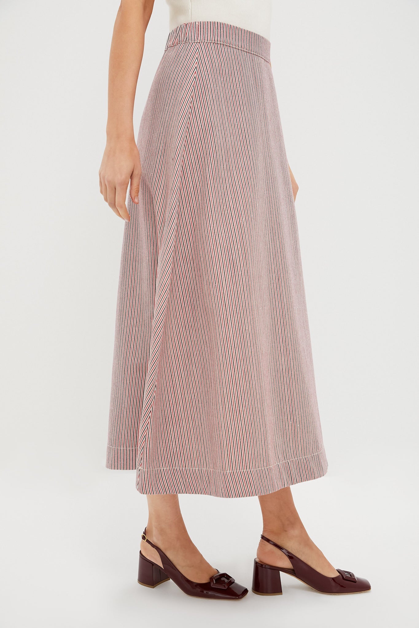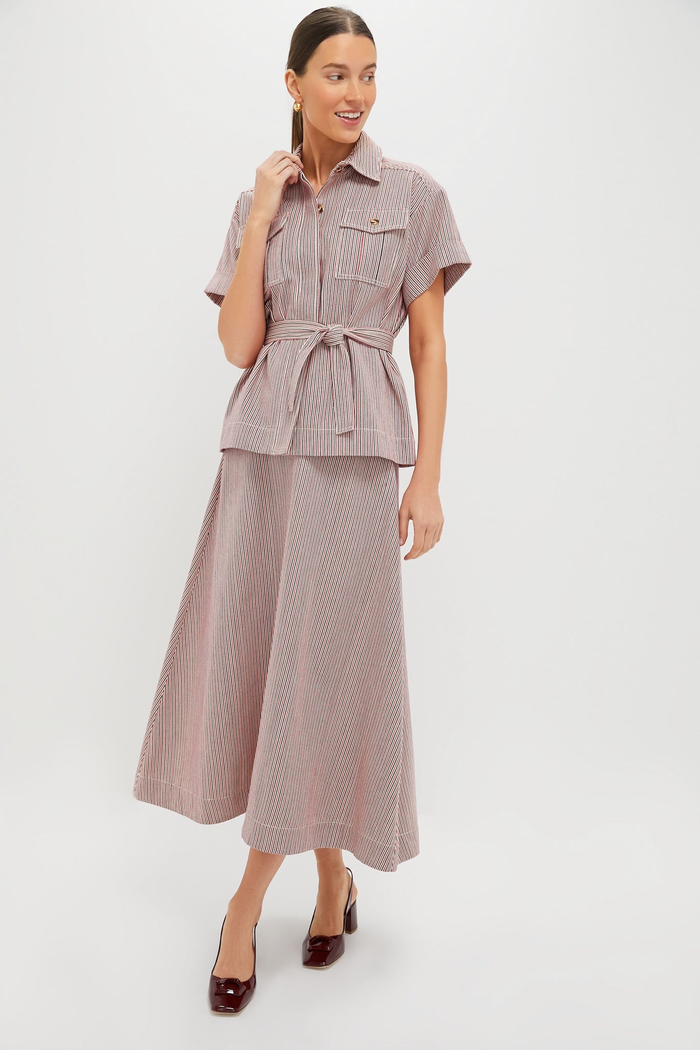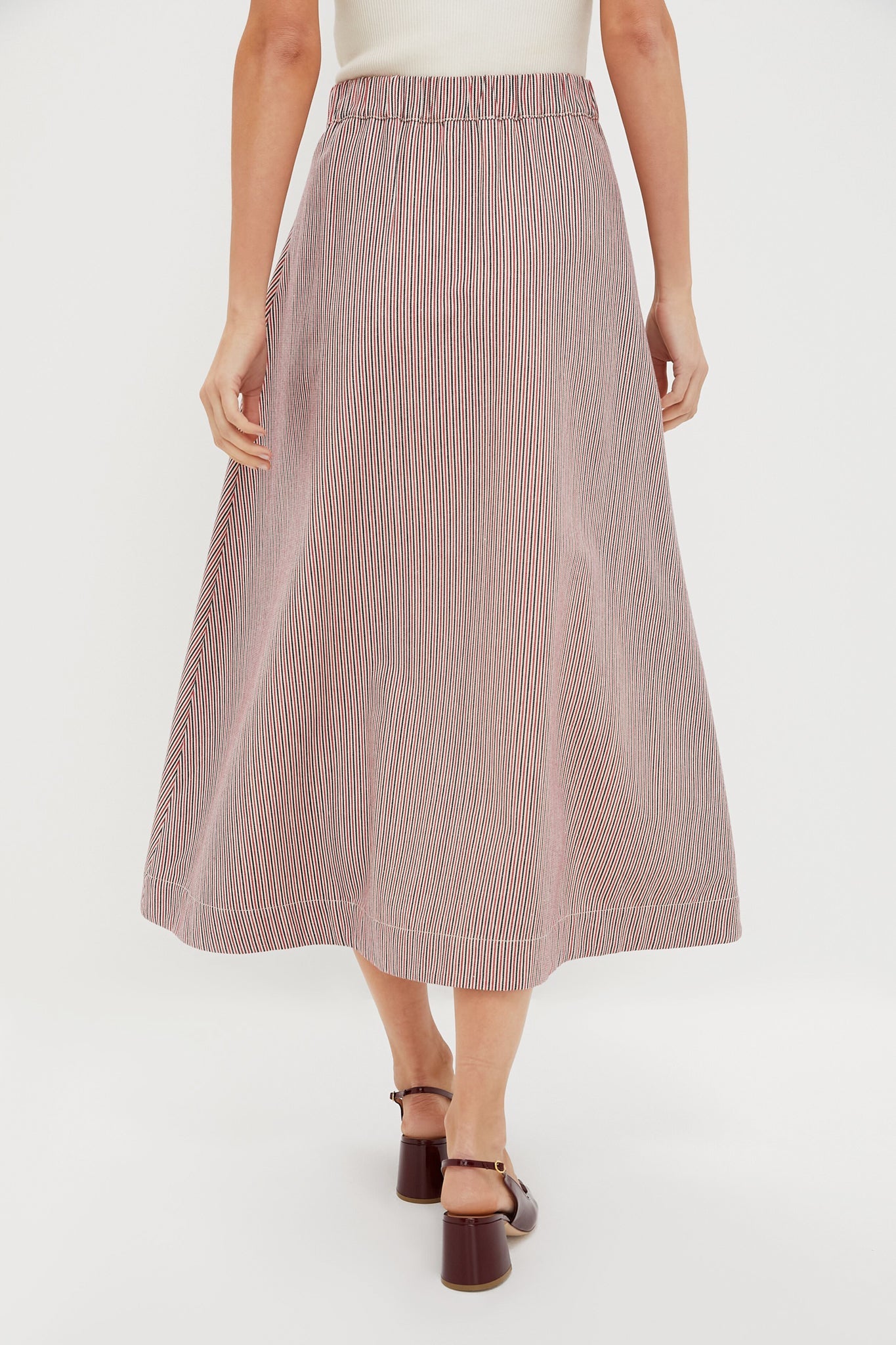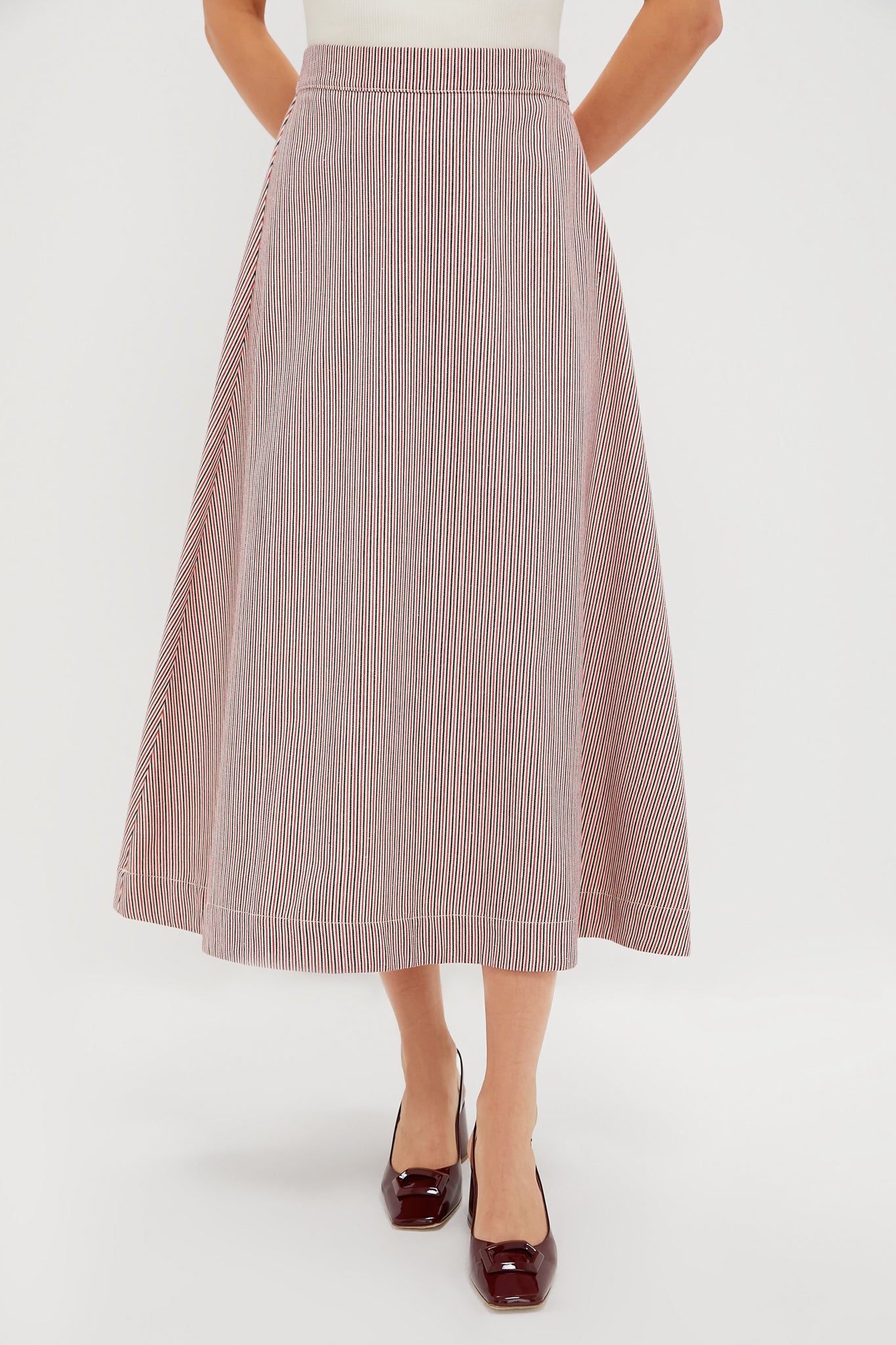 The Red Stripe Evelyn Skirt is an easy feminine style with vintage-appeal. A clean A-line silhouette, this midi features a side zip closure and elastic back for perfect fit. The classic red and navy striped pattern will pair perfectly with a simple white tank and sneakers, or dressed up with the matching Red Stripe Belted Ava Jacket for a sophisticated set!