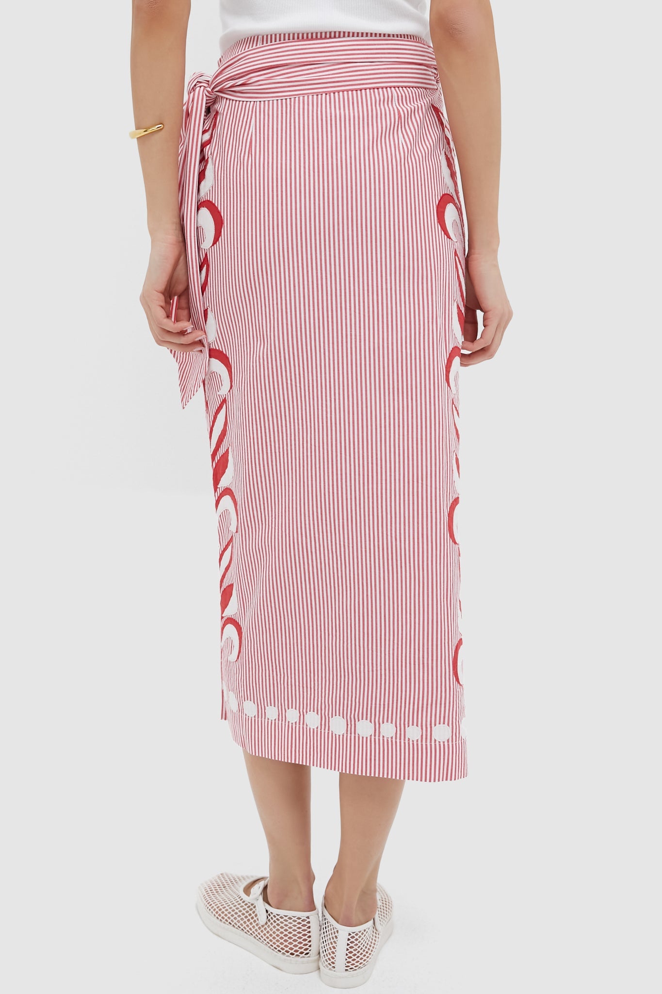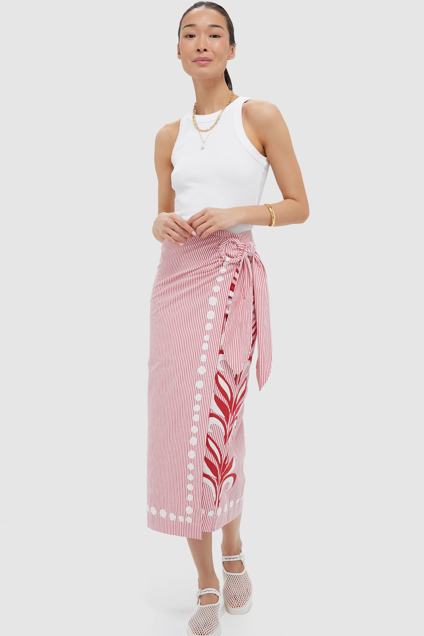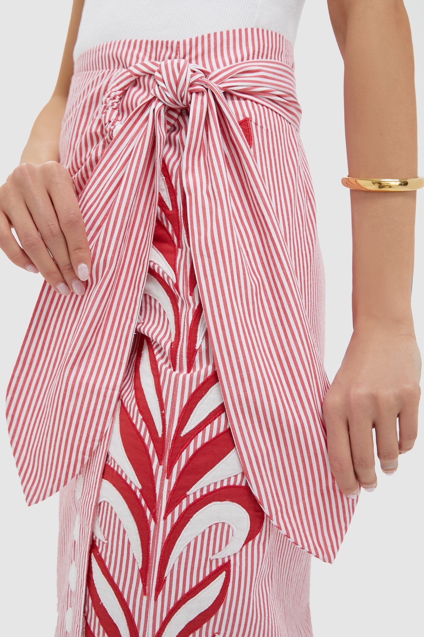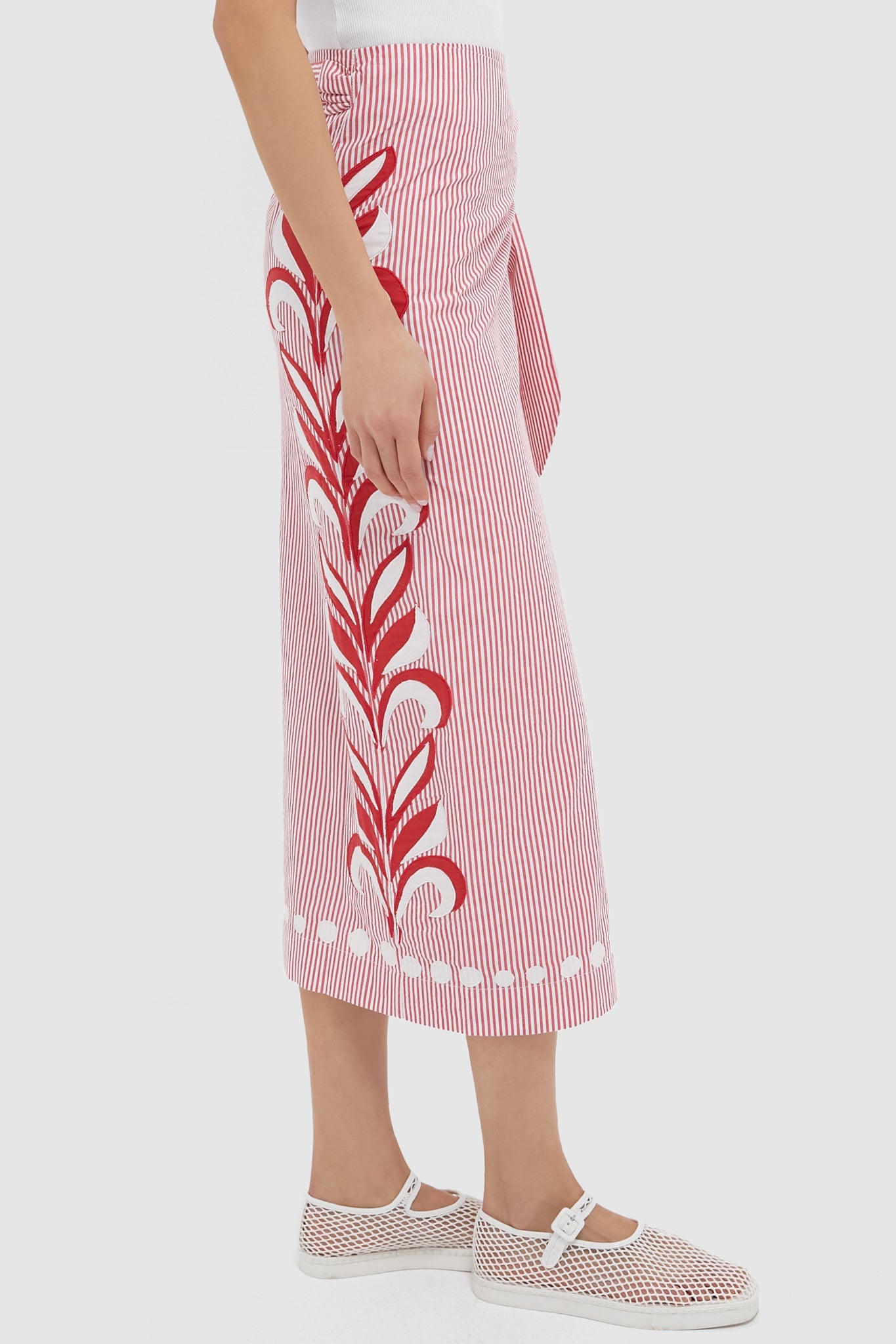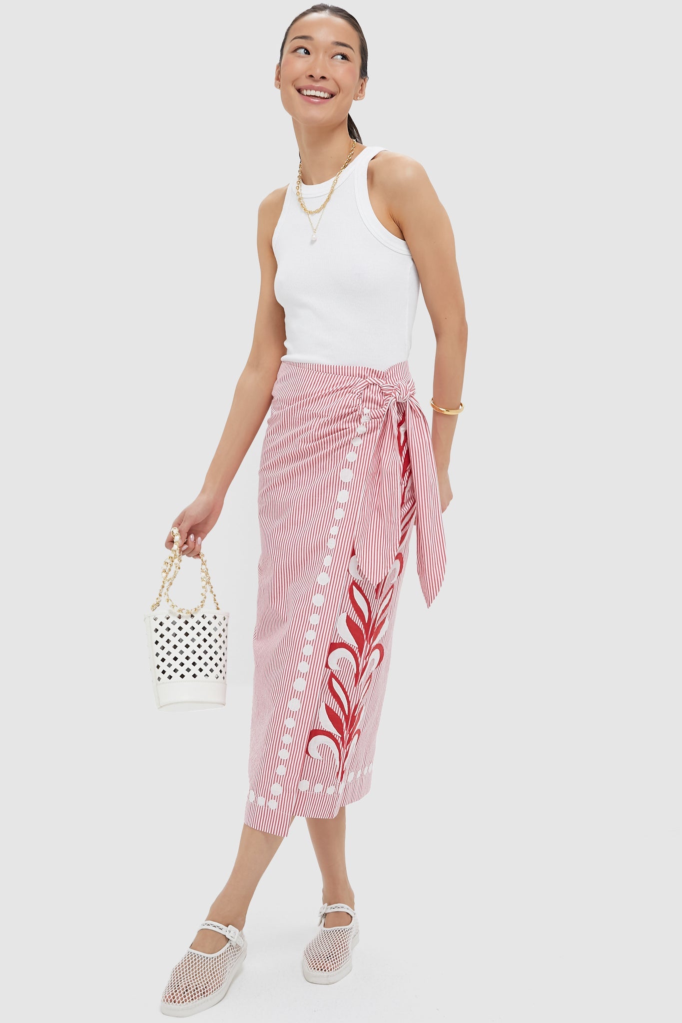 Featuring a high rise fit, self-tie side detail, and hand-applique florals, this midi is the perfect way to spice up any outfit. Lightweight and breathable, it's made of breezy cotton for sunny days — pair it with a tank, sandals, and sunnies for brunches, or dress it up with a crisp blouse, wedges, and gold jewelry for dinners al fresco.