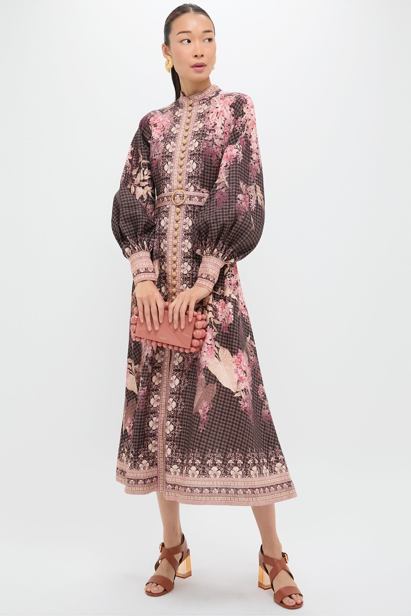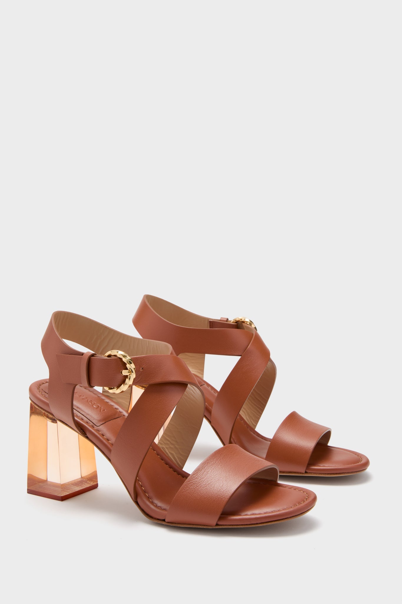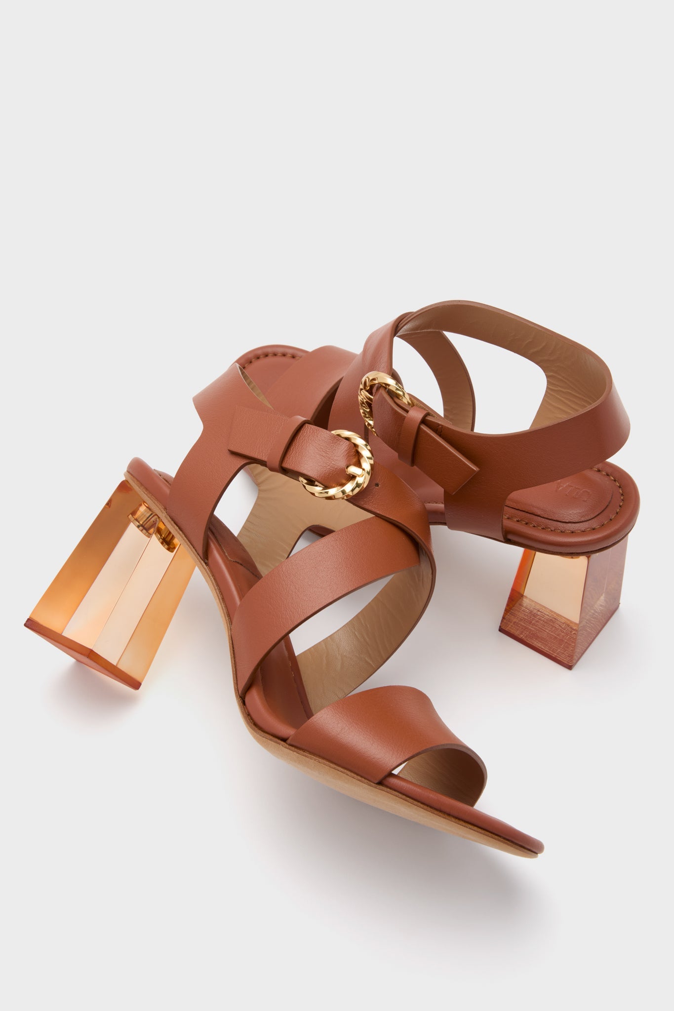 The Elora is adorned with a transparent lucite heel that reveals the internal hardware for a touch of utilitarian elegance. It is crafted from supple brown leather with wide, crossover straps and fastens with a twisted buckle in shiny brass. Neutral yet eye-catching, we are styling these with patterned maxis or dark wash denim.
