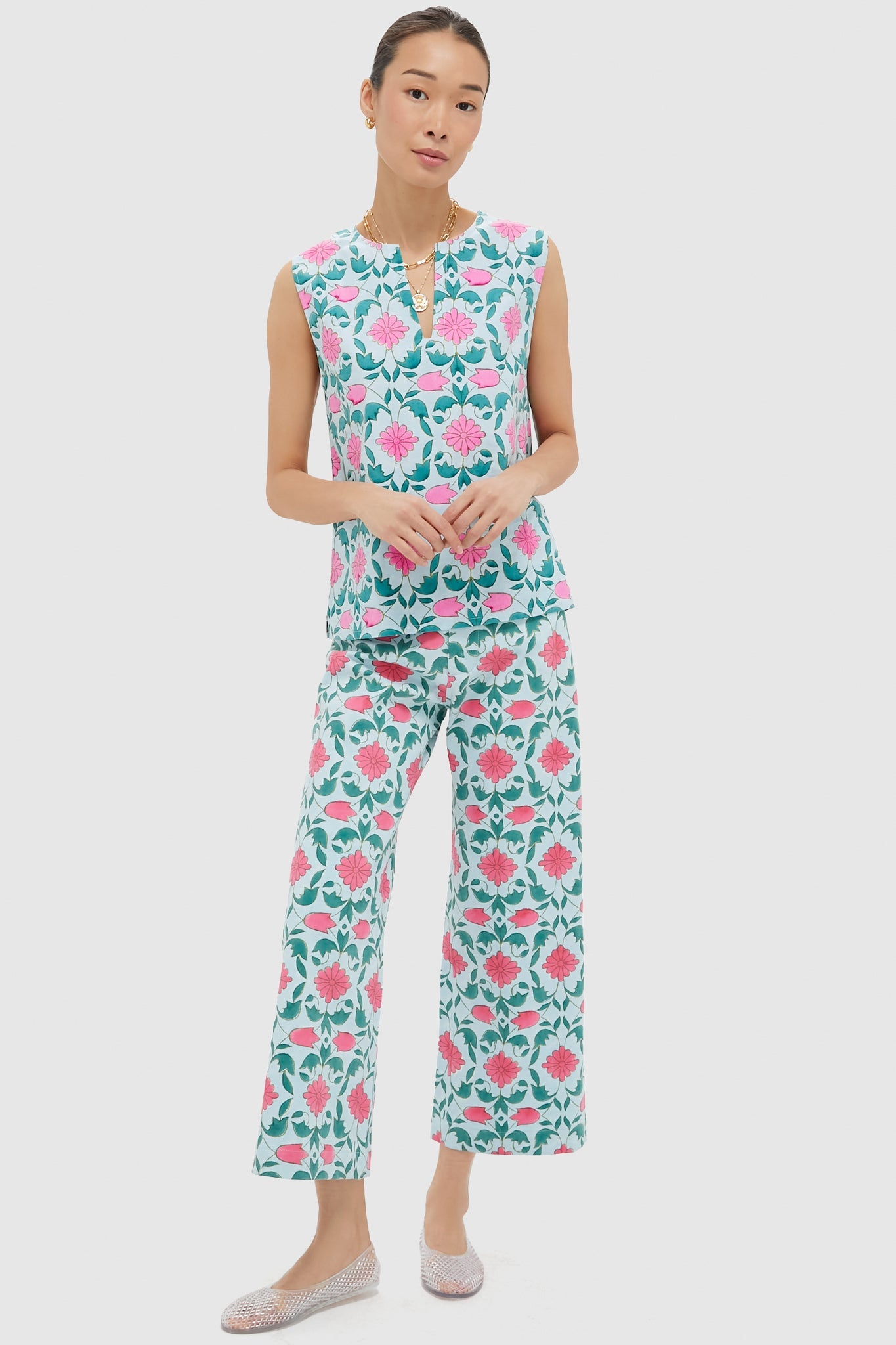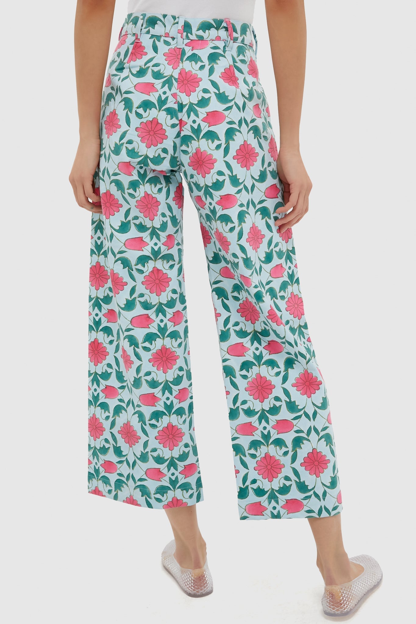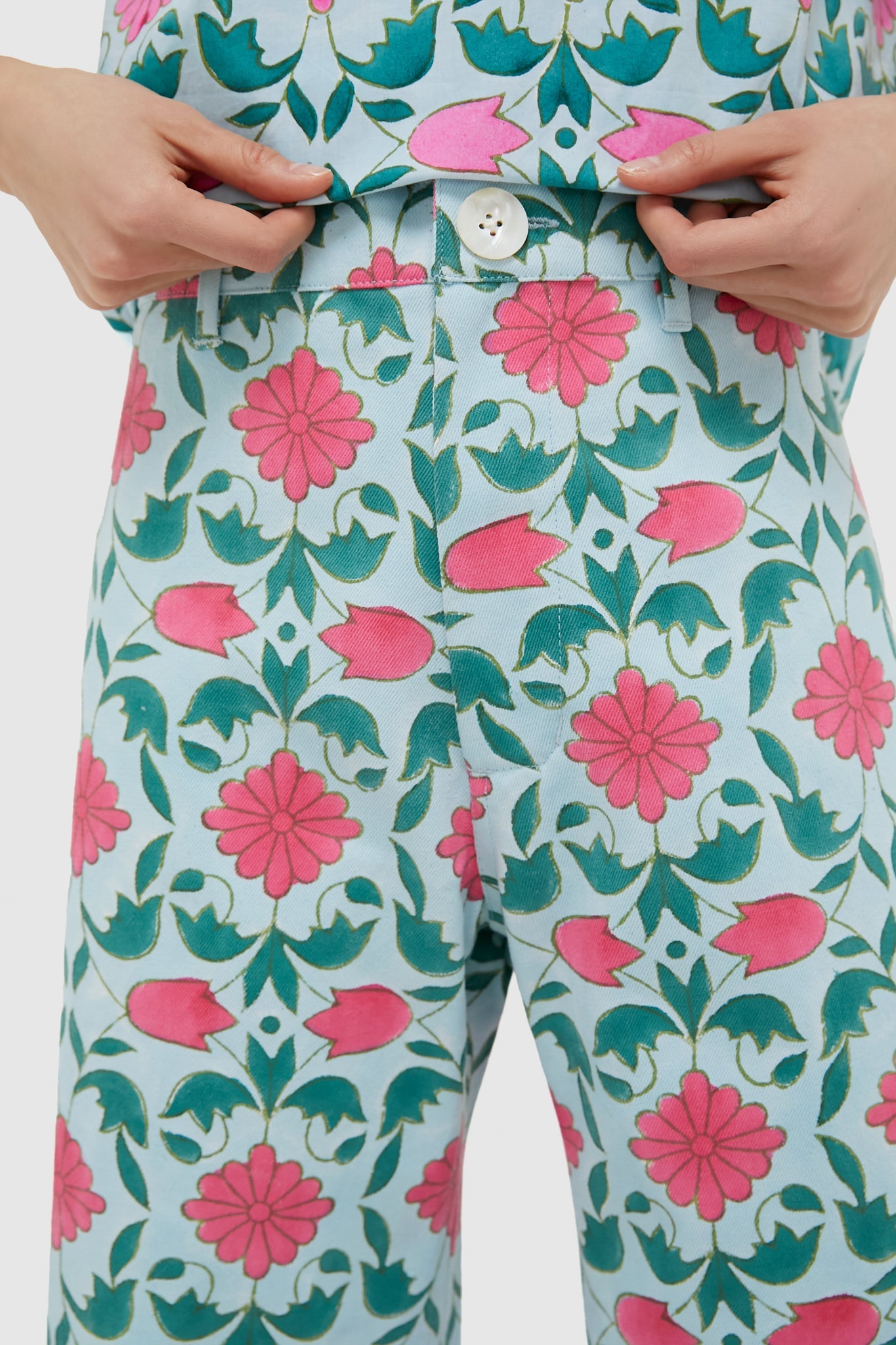 The Salvia Blue Lisbon Print Disco Pants features a high rise, wide leg and slightly cropped silhouette. Crafted from lightweight-but-durable denim, these hand block printed bottoms are designed to hug you through your waist and hips. Immensely flattering and elongating, dress them down with a basic tee and sandals for a coffee date, or dress them up for dinner and drinks with the matching Salvia Blue Lisbon Print Alegra Top and wedges!