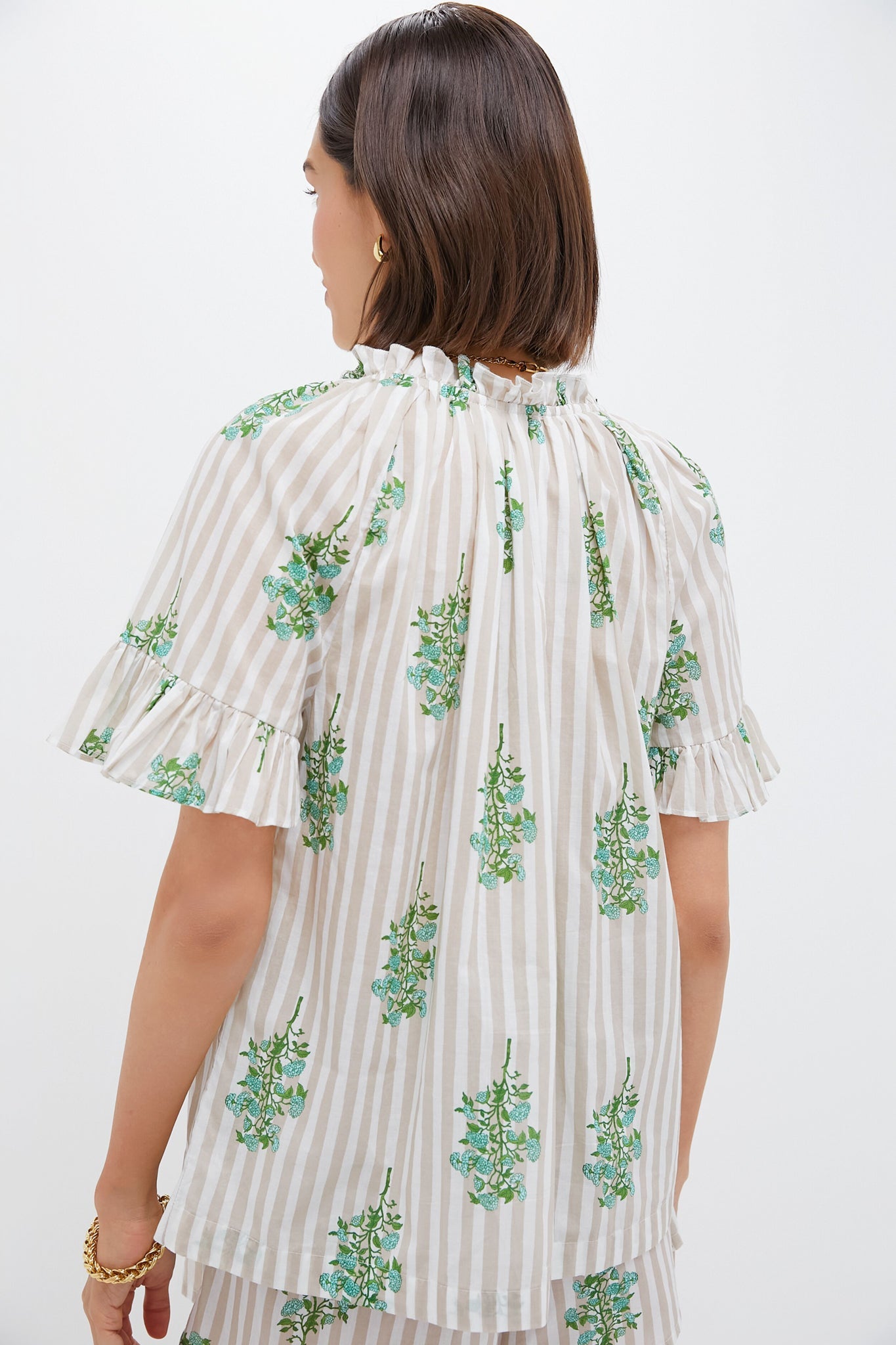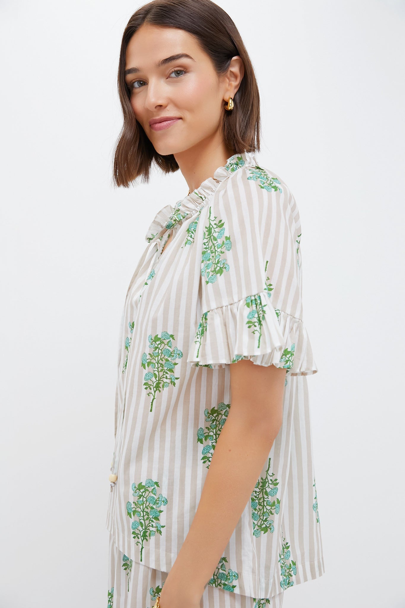 The Sand Striped Bouquet Cassis Top is a must have on your packing list. Featuring a neutral striped pattern with floral detailing, a V-neckline with tassel detailing, and ruffles along the collar and sleeve, this top will take you from the beach to lunch in no time! We paired with the matching Sand Striped Bouquet Jolie Shorts, a ballet flat or sandal, and rattan bucket bag!