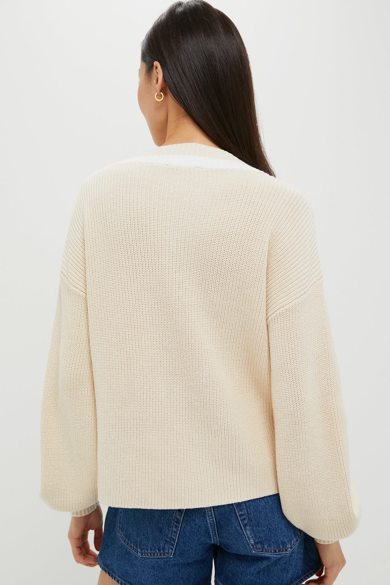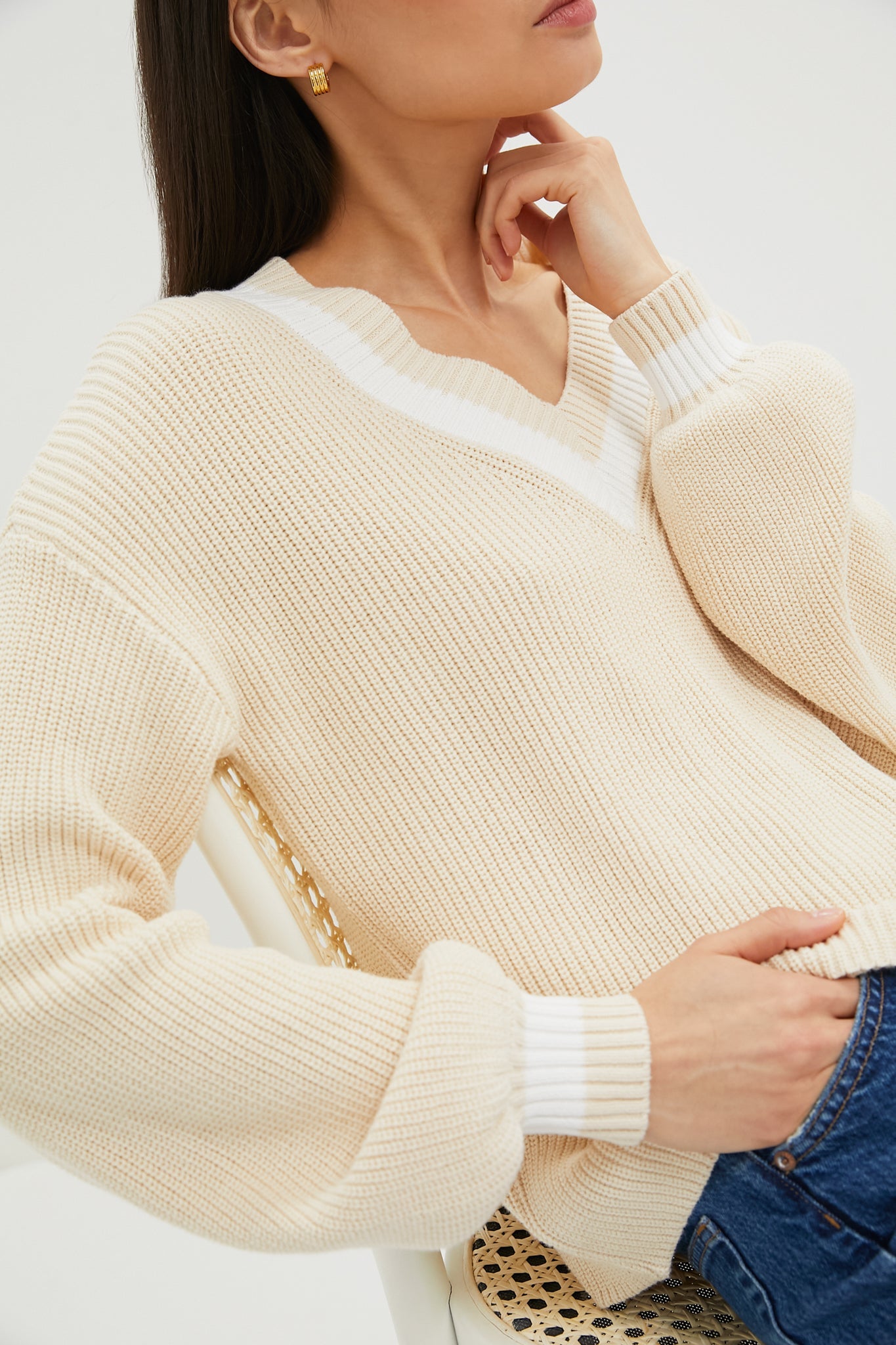 The classic silhouette features feminine balloon sleeves, a contrast V-neckline, and a high quality tight-gauge knit that is buttery soft to the touch. The perfect length for easy tucking, we are pairing this with pants for chilly summer evenings or with a tennis skirt while warming up on the courts.