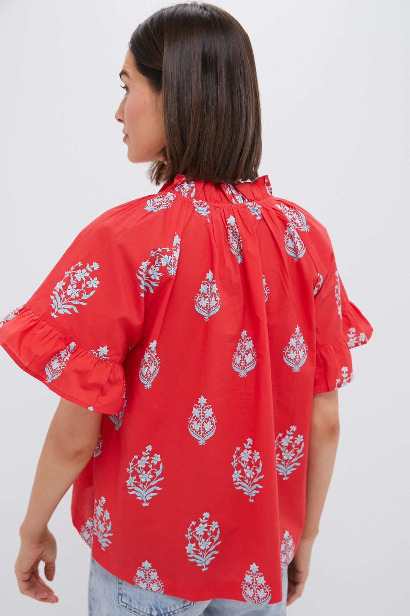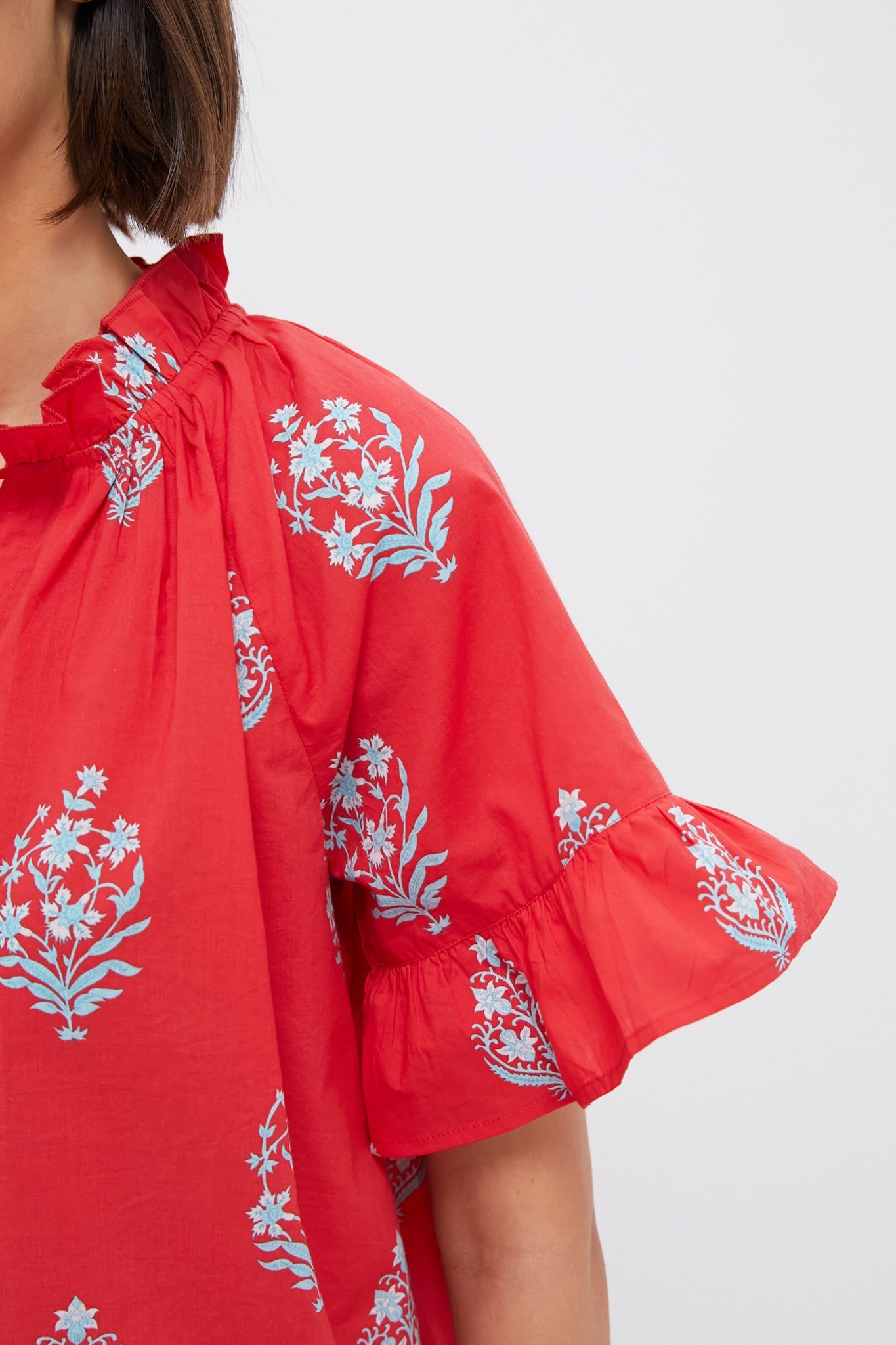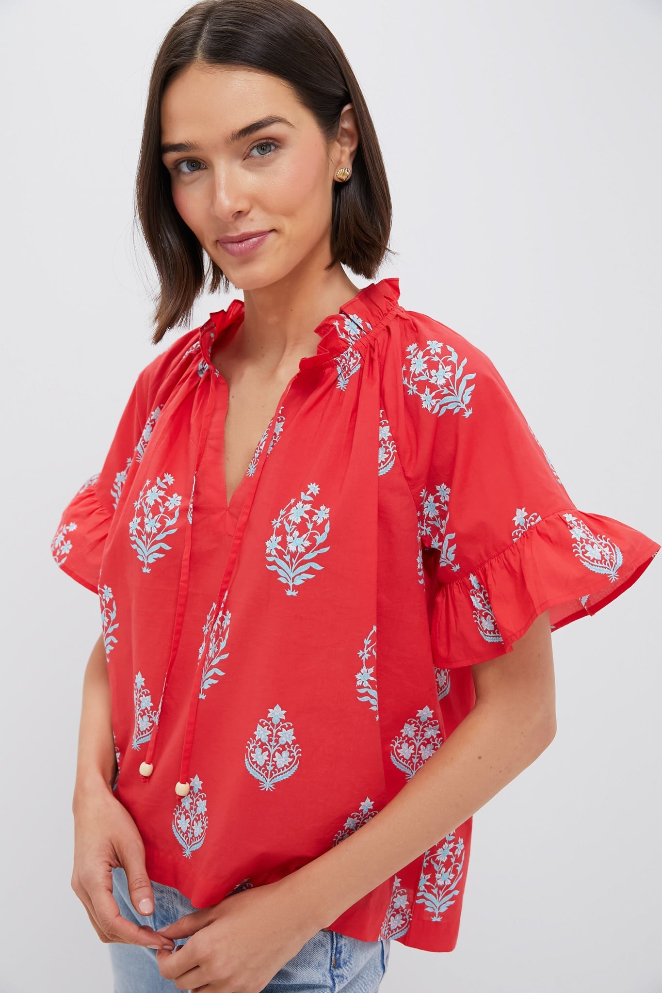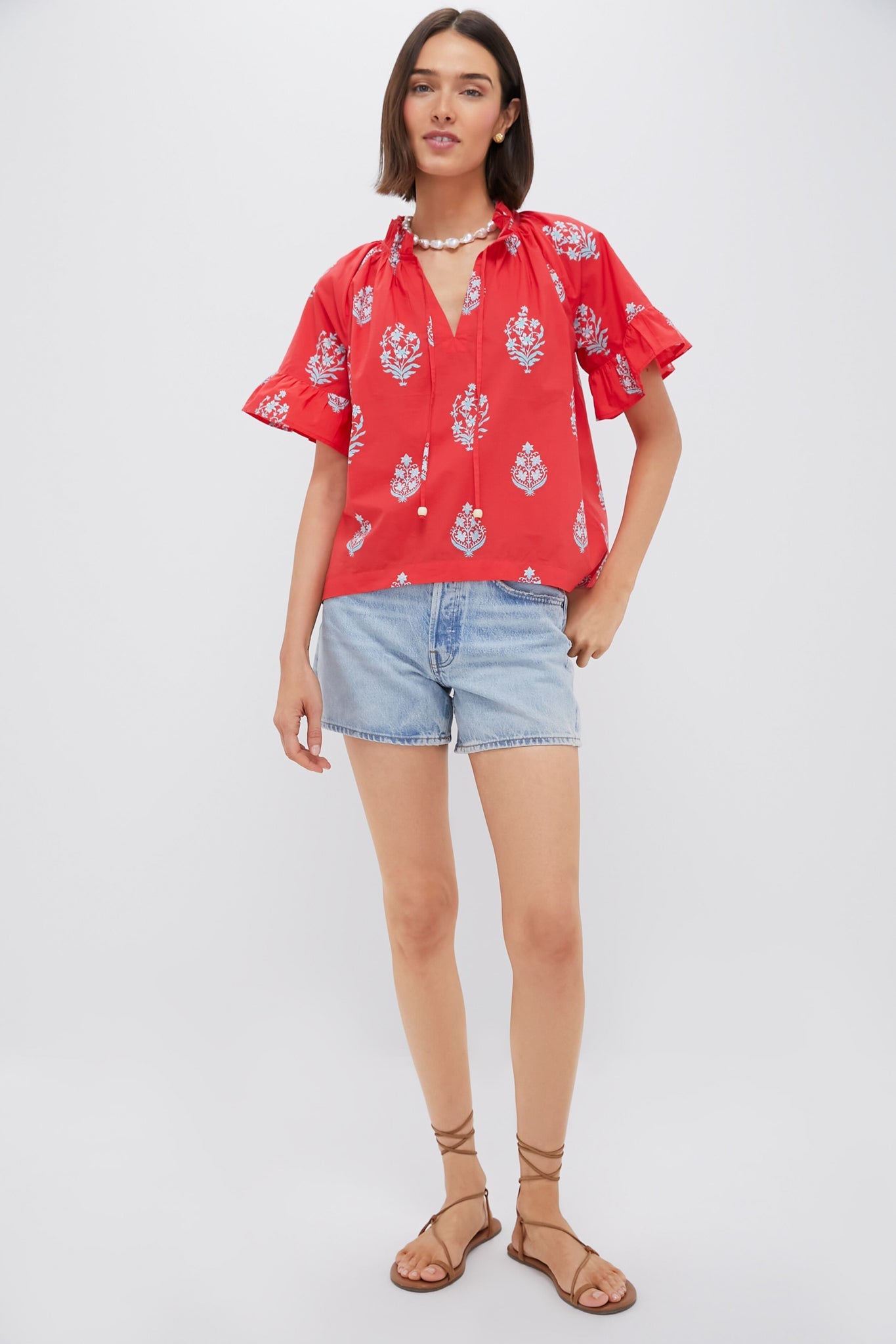 The Scarlet Bouquet Blockprint Cassis Top is a must have on your packing list. Featuring a bright red hue, with contrasting teal block print, a V-neckline with tassel detailing, and ruffles along the collar and sleeve, this top will take you from the beach to lunch in no time! We paired it with jean shorts, sandals, and a large tote perfect for the farmers market, the beach, or just running around town!