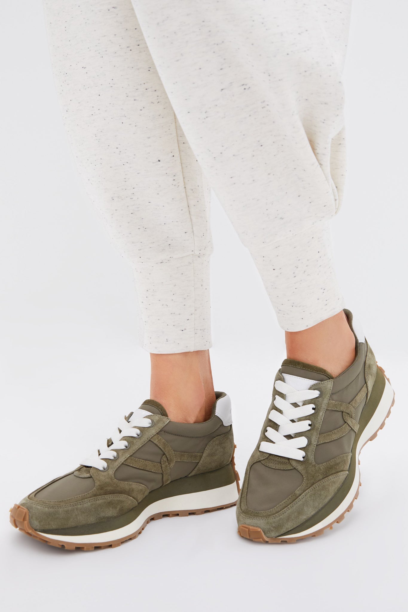The Valentina sneaker combines flattering lines and comfort: a padded collar, a cushioned midsole with a two-inch lift, a rubber outsole for grip, and suede details in the toe cap and back. The interlocking-V design, also in suede, is a discreet nod to our logo. Equal parts sporty and chic, this lightweight design will be your new go-to for days on the move.