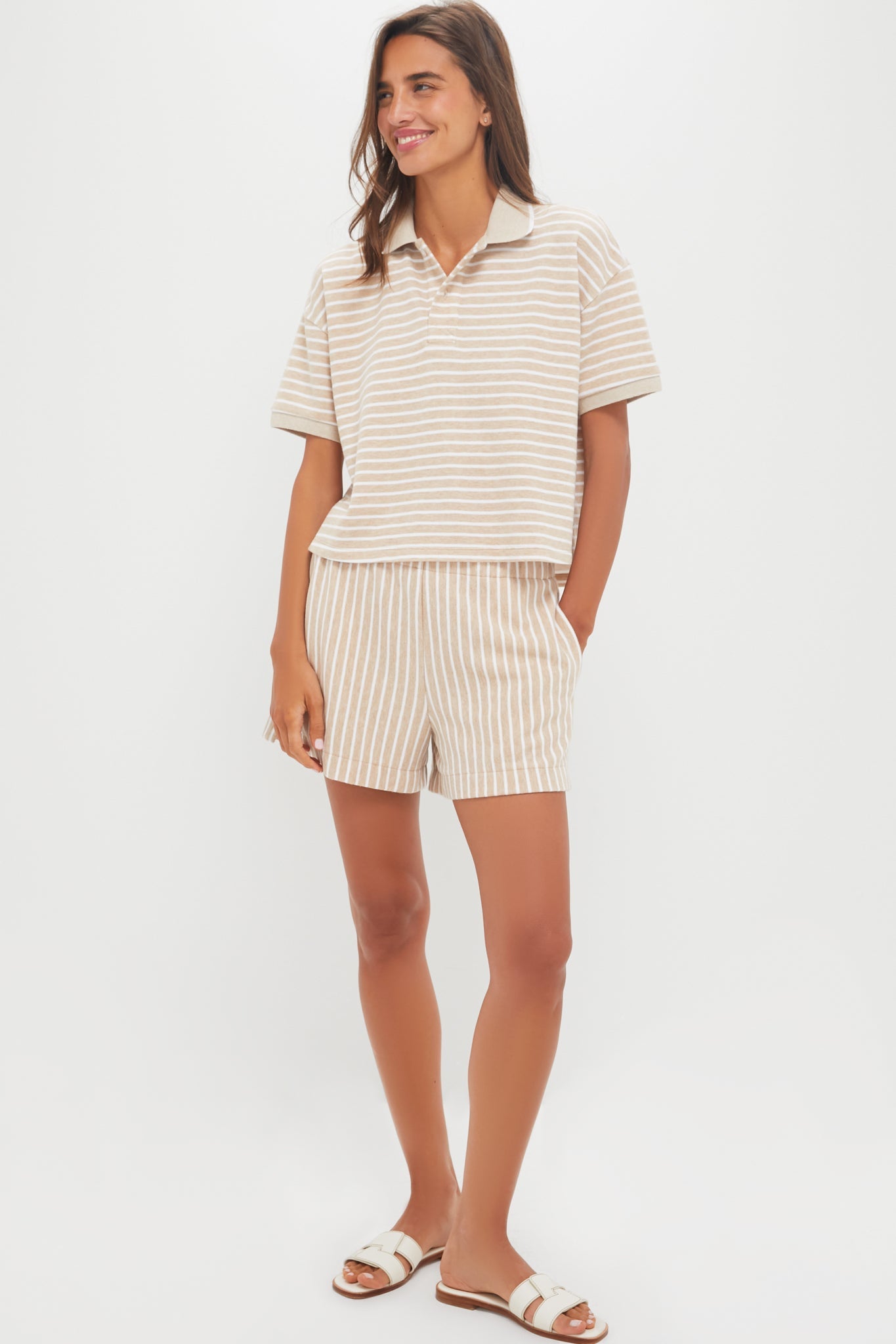 The Tan and White Striped Wyatt Shorts are a classic everyday silhouette in an exciting striped colorway. With an elastic waistband and side pockets, these relaxed fit shorts are ideal for warm days spent picnicking, relaxing, or running around with the kids. Style with the matching Tan and White Striped Holmes Polo for a fun coordinated set or opt for an easy white tee!