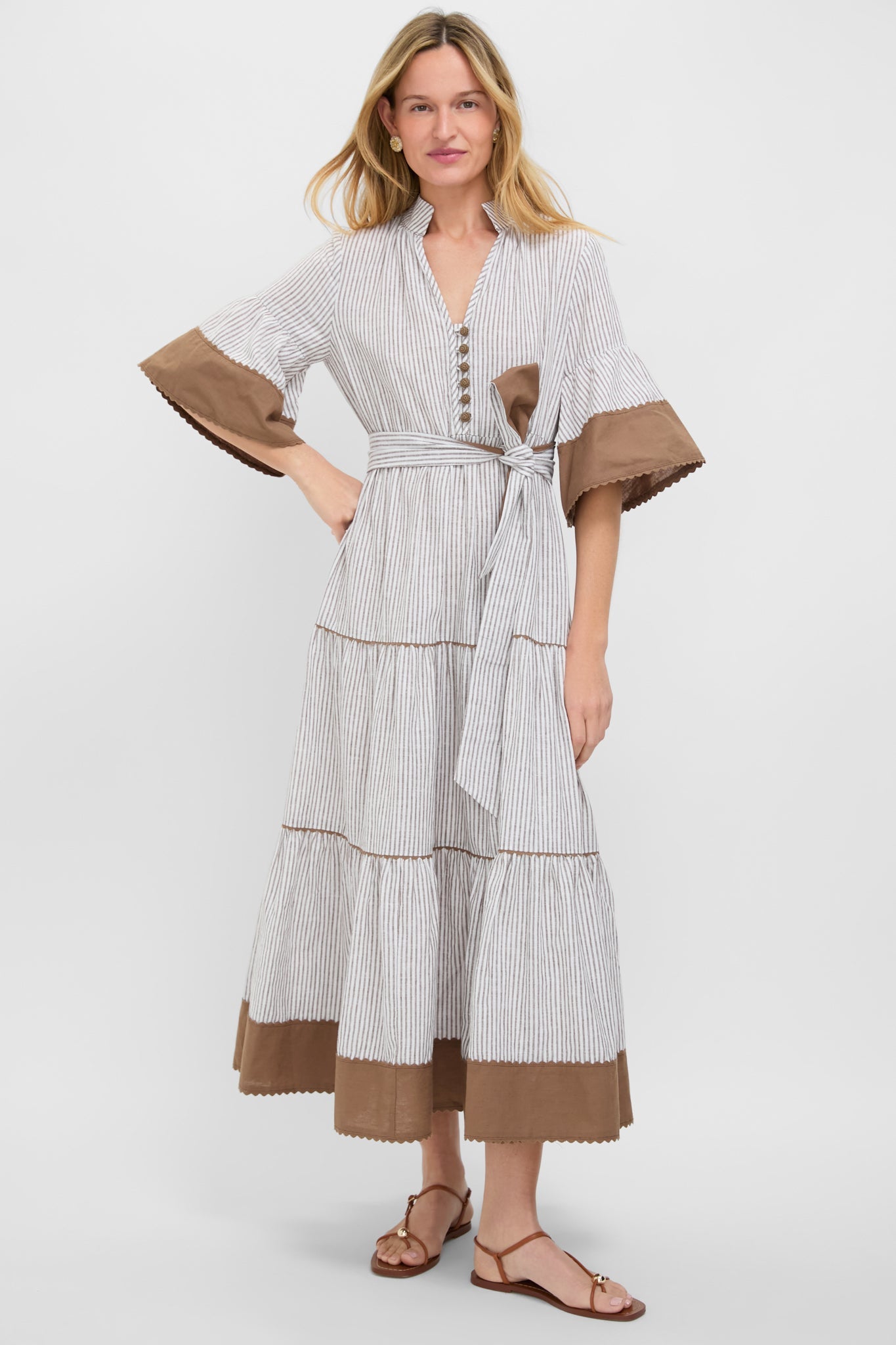 The Tan Stripe Linen Joanna Dress is a sophisticated silhouette with flared cuffs, a self-tie waist belt, and a tiered skirt with a contrast stripe at the hem. Meant to carry you through the warm-weather months, we are styling this with sandals or heels for whatever the occasion calls for!