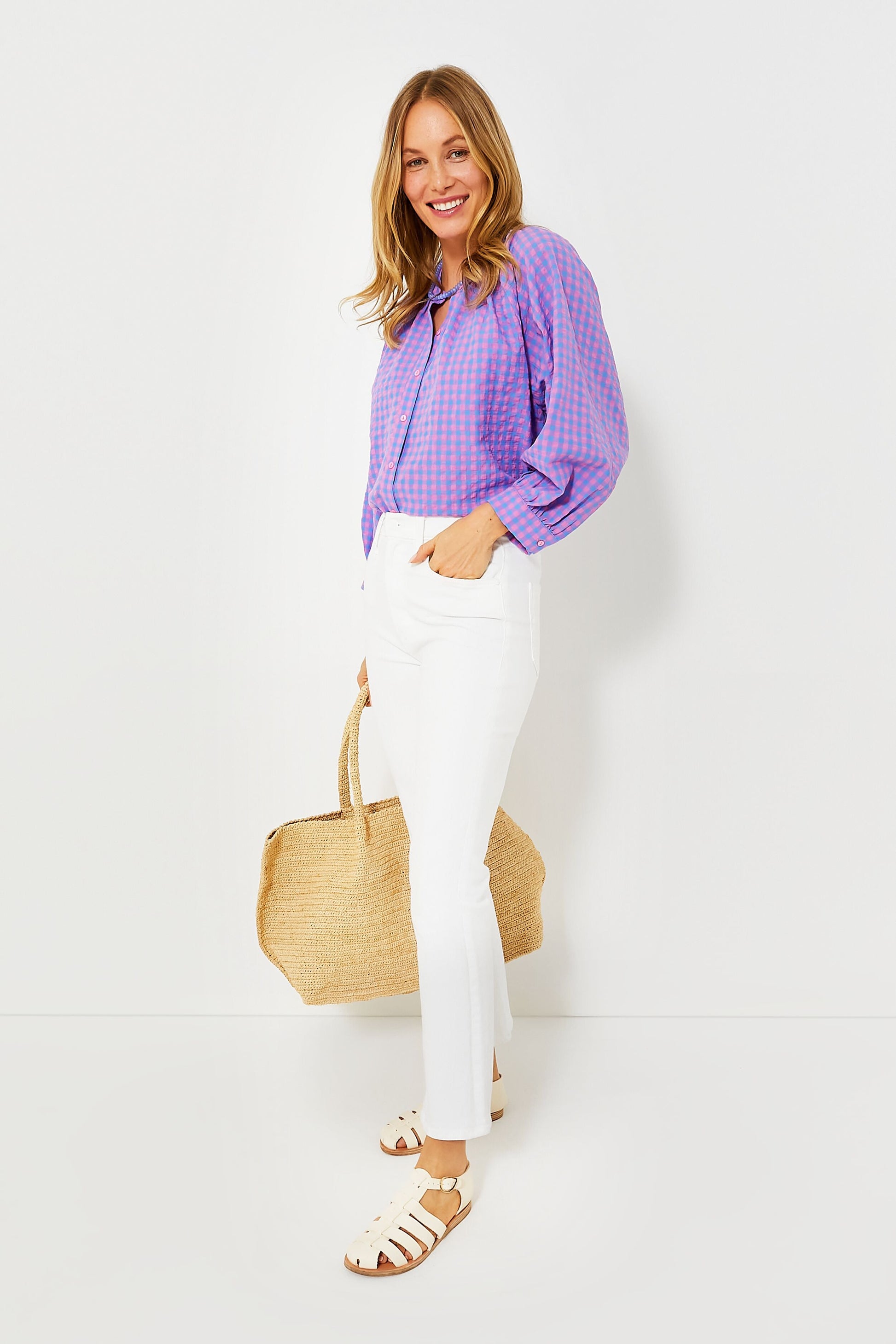 The Rosie Blouse is full of surprises! Designed with an unexpected pink and blue gingham print done in a slightly crinkled, textured fabric, this top is equally playful as it is flirty. Opt for white denim and strappy sandals for everything from Sunday brunch to backyard get-togethers.