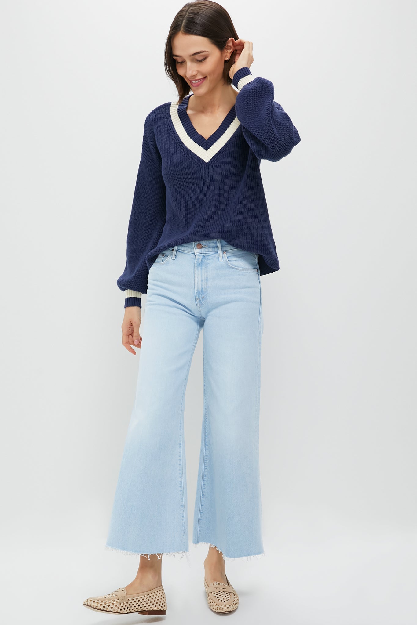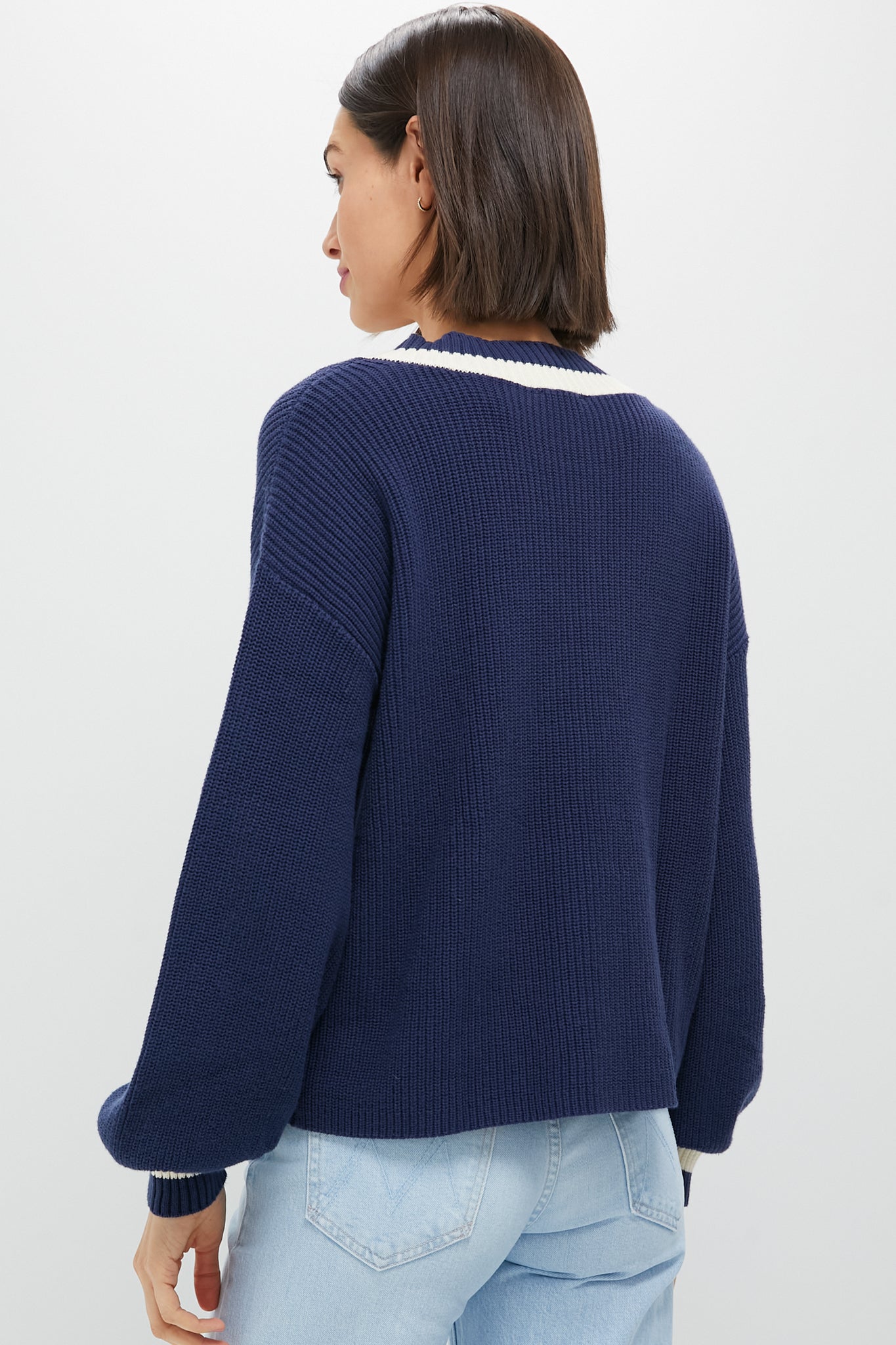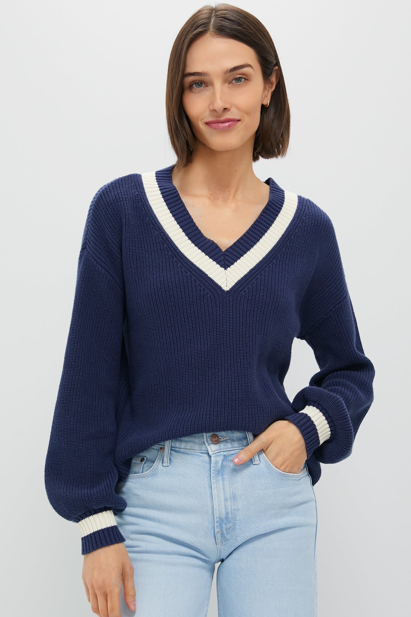 This Washed Navy Ashe Sweater embodies the essence of chic timelessness. The classic silhouette features feminine balloon sleeves, a contrast V-neckline, and a high quality tight-gauge knit that is buttery soft to the touch. The perfect length for easy tucking, we are pairing this with pants for chilly summer evenings or with a tennis skirt while warming up on the courts.