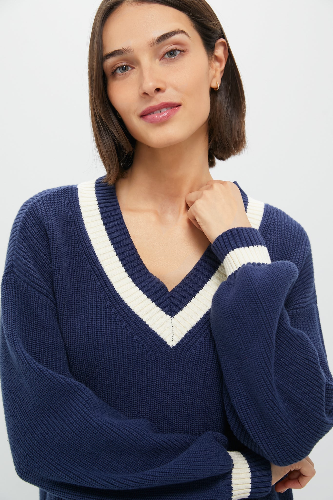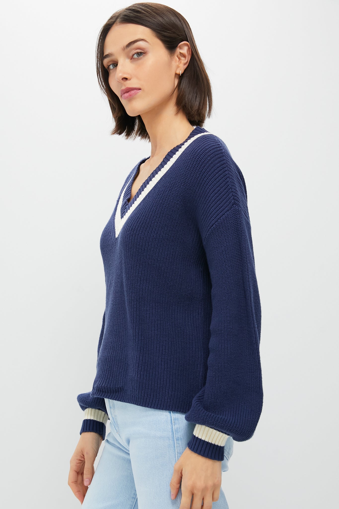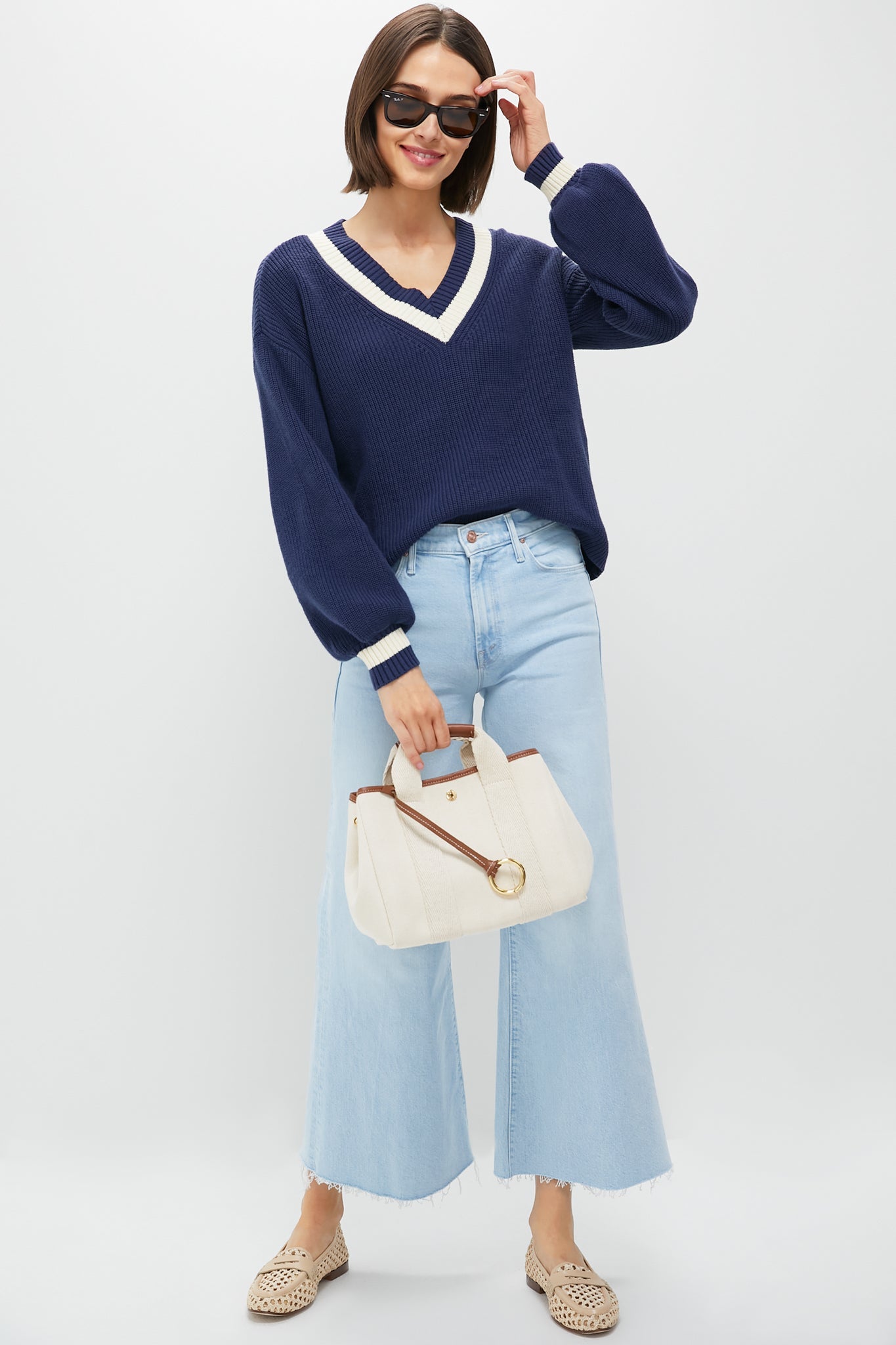 This Washed Navy Ashe Sweater embodies the essence of chic timelessness. The classic silhouette features feminine balloon sleeves, a contrast V-neckline, and a high quality tight-gauge knit that is buttery soft to the touch. The perfect length for easy tucking, we are pairing this with pants for chilly summer evenings or with a tennis skirt while warming up on the courts.