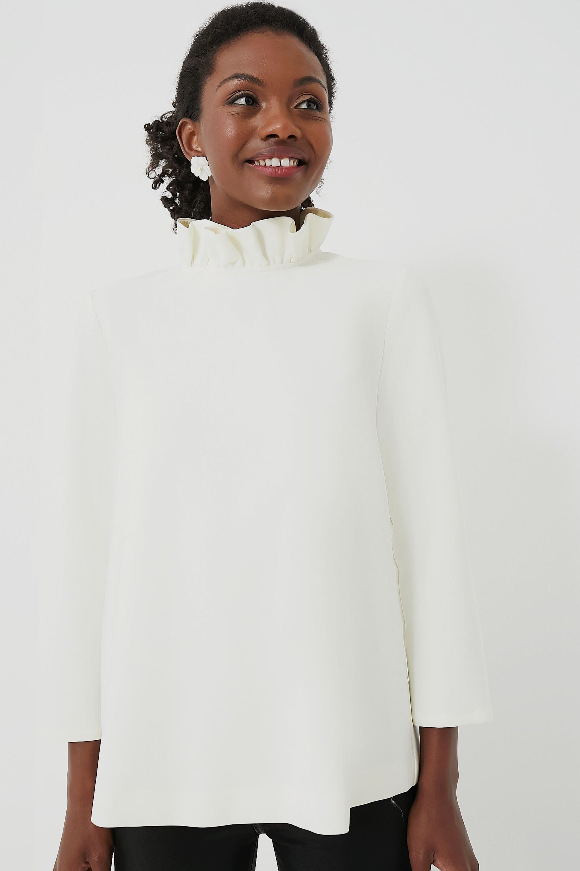 A Tuckernuck style staple, the Faye is back and better than ever. Our design team spent months perfecting and testing our signature stand collar to get it just right. As Marvin Gaye once said: "Ain't no collar high enough," so bring on the ruffles and drama! Updated in a beautiful stretch crepe fabric, this swing shape blouse reminds us of our favorite mod silhouettes from the 60s and 70s. Ready for al fresco dinners with family, cocktail parties with friends, and every social event on your calendar, the occasions are endless for this bow tie-back top!