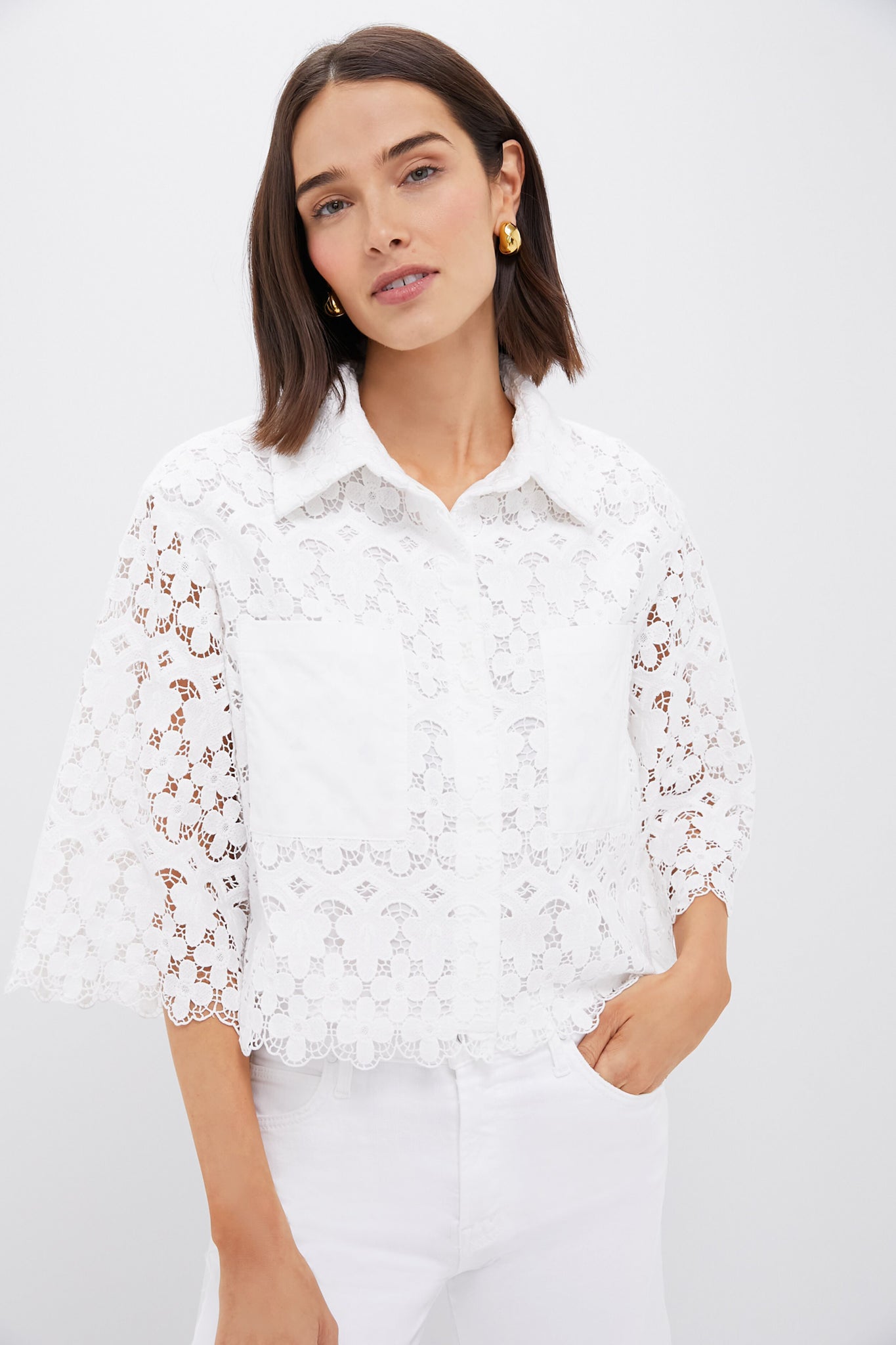 The Francesca Blouse adorned with beautiful white lace, is an elevated staples your wardrobe needs. Featuring a cropped, boxy silhouette, oversized short sleeves, and a front button placket, this is an elevated version of a tried and true staple! Pair with white jeans, blue jeans, or colorful skirts to add an elevated touch to any outfit!