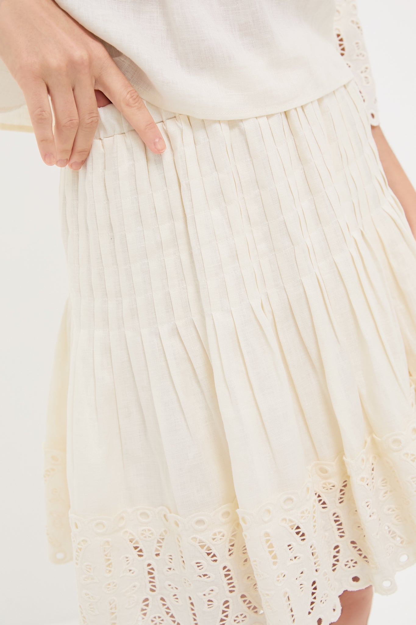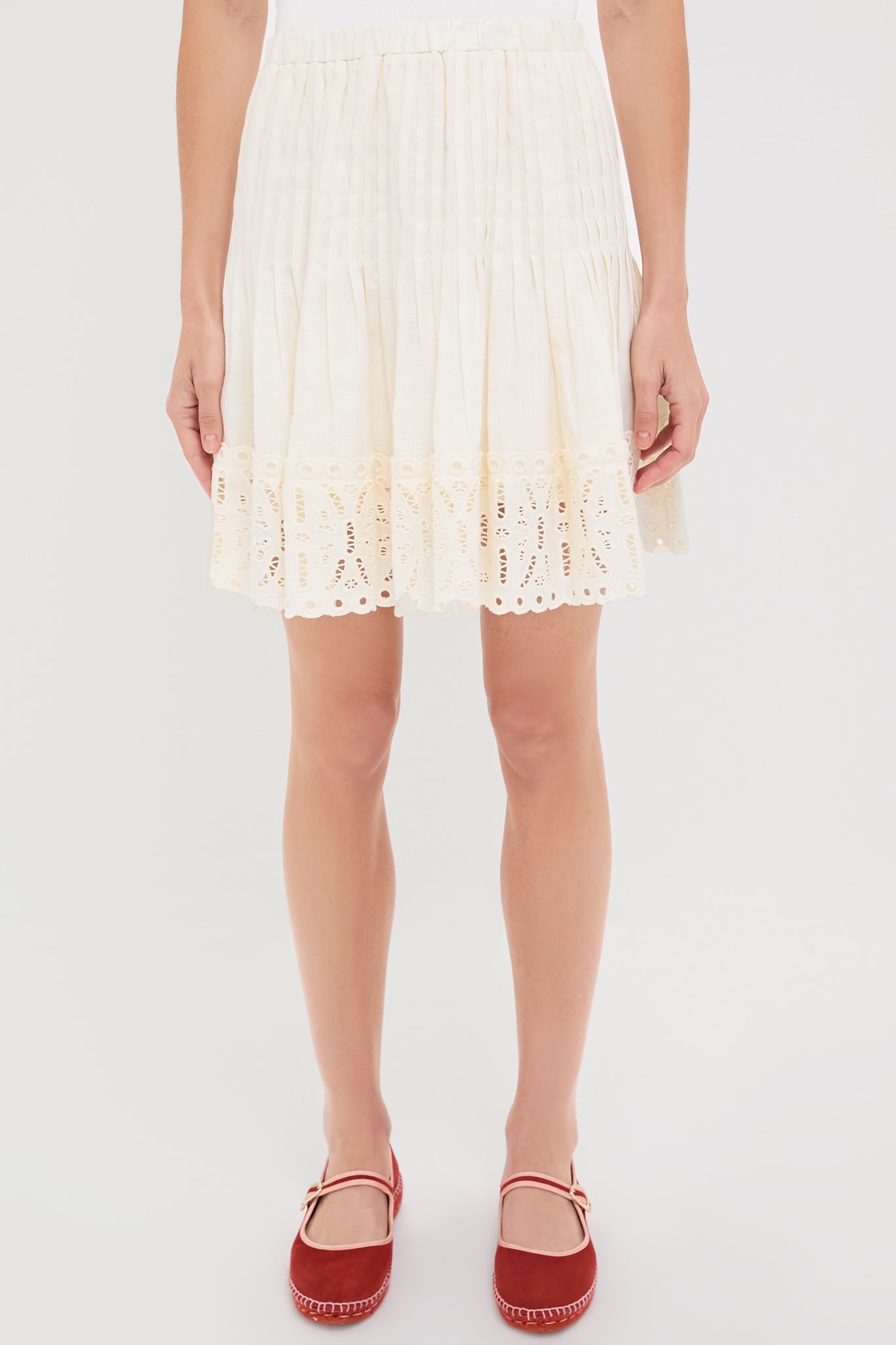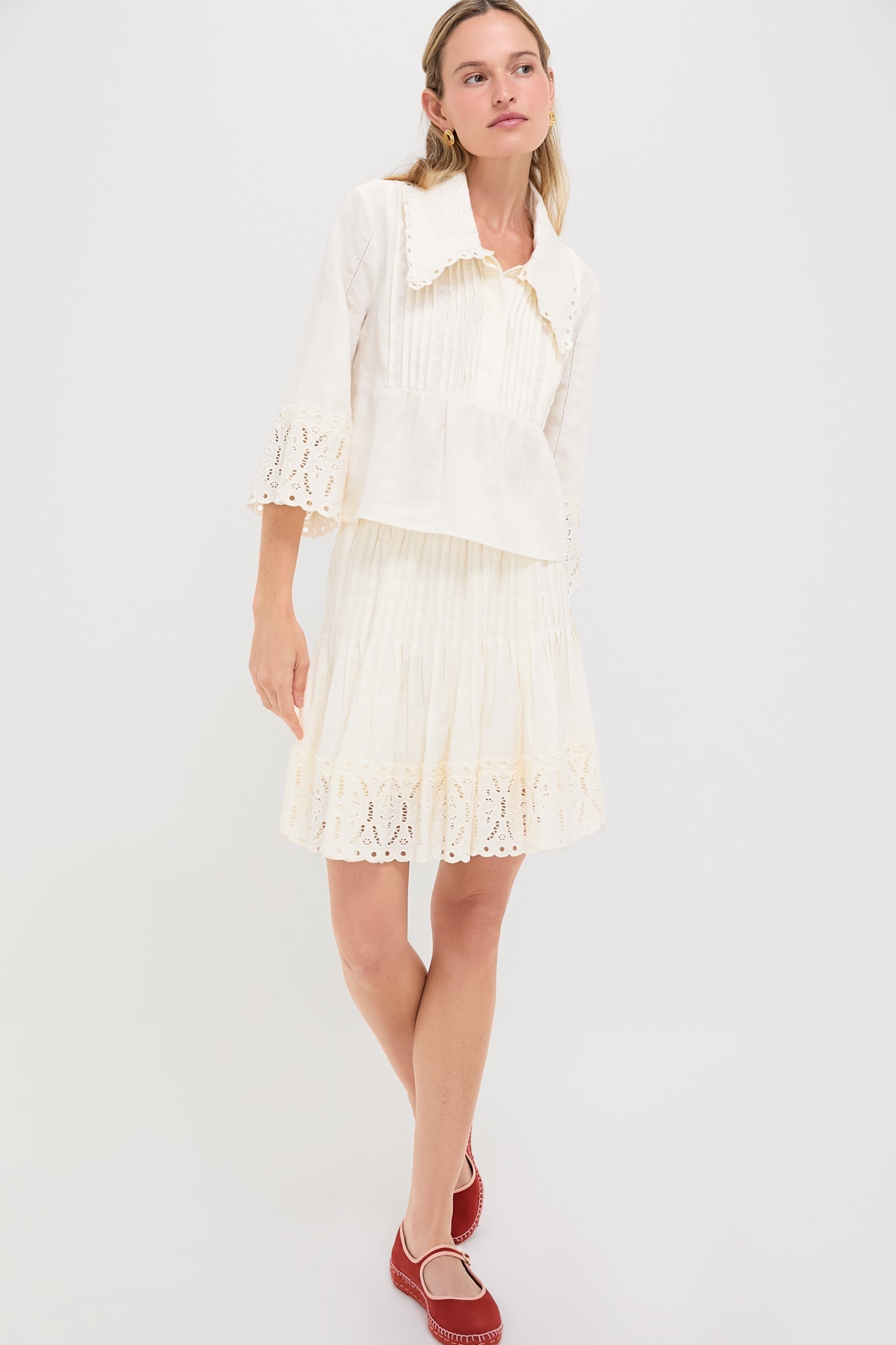 The Adele Skirt is a style that can be dressed up or down for endless occasions. With an elastic waistband, pintucked detailing, and an eyelet hem, it pairs perfectly with a simple white tank or with the matching White Linen Eyelet Jeanne Blouse!
