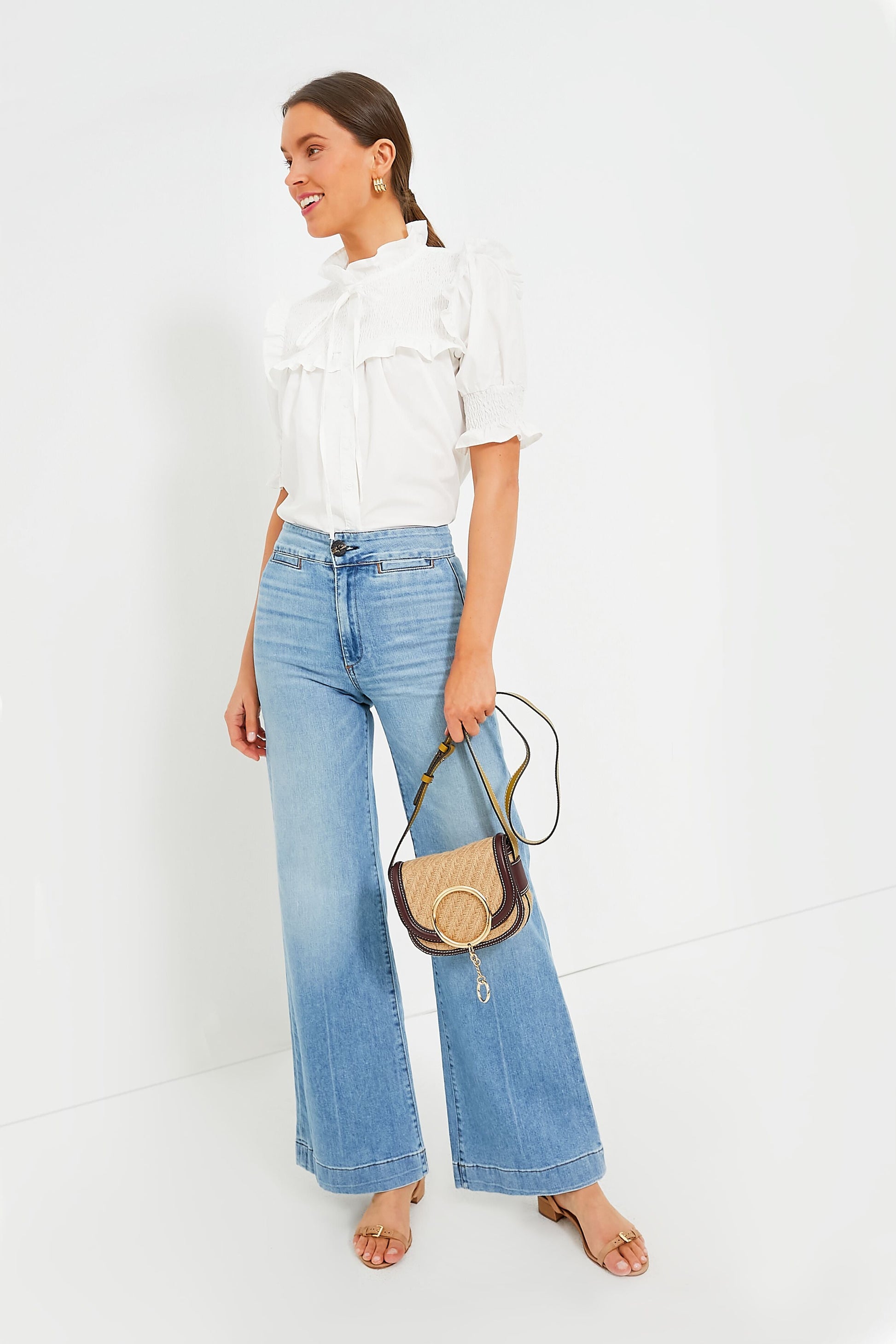The White Nicole is a classic cotton shirt but not as you know it: we’ve detailed this one with ruched front, ties at the neck, and short puff sleeves. The versatility of this blouse is our favorite part though — it's a fun and flirty option when paired with a mini skirt and heels, a classic look with denim and a sleek bag, or an office-appropriate moment when styled with trousers and loafers.