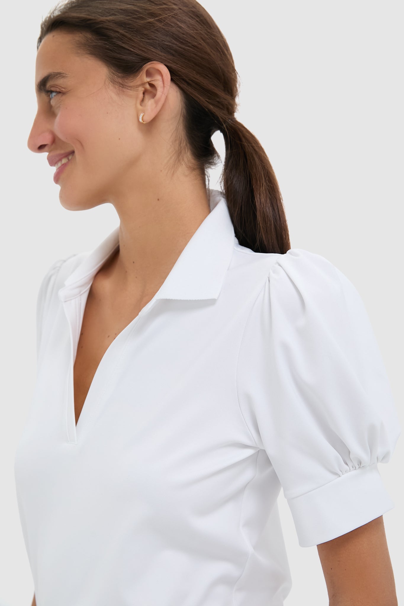 Prep for the U.S. Open (or a coffee run) in the Puff Sleeve Caroline Polo. With an open collar, puff sleeves, and a high low hemline it has feminine details that make this polo unlike any other.