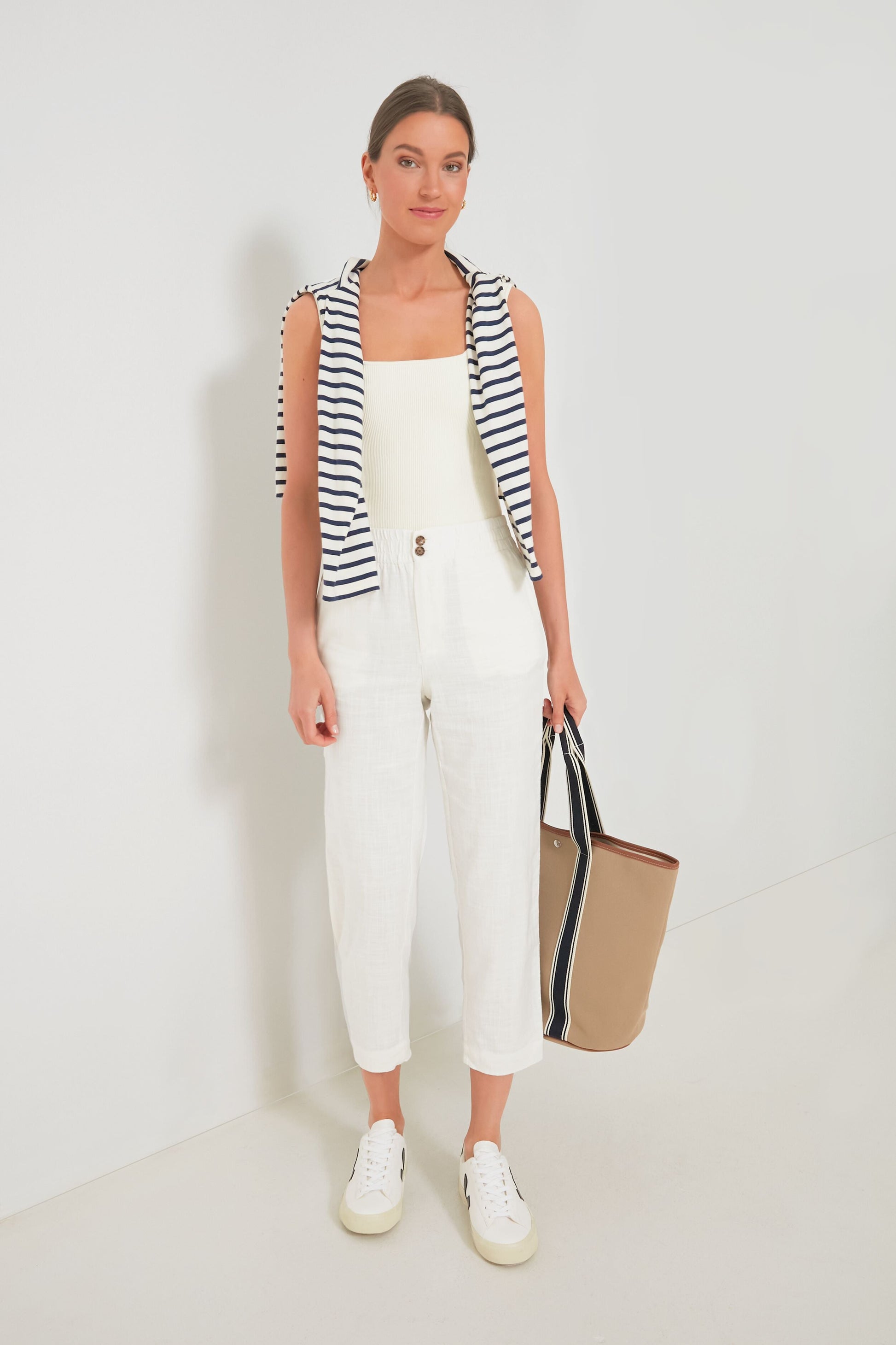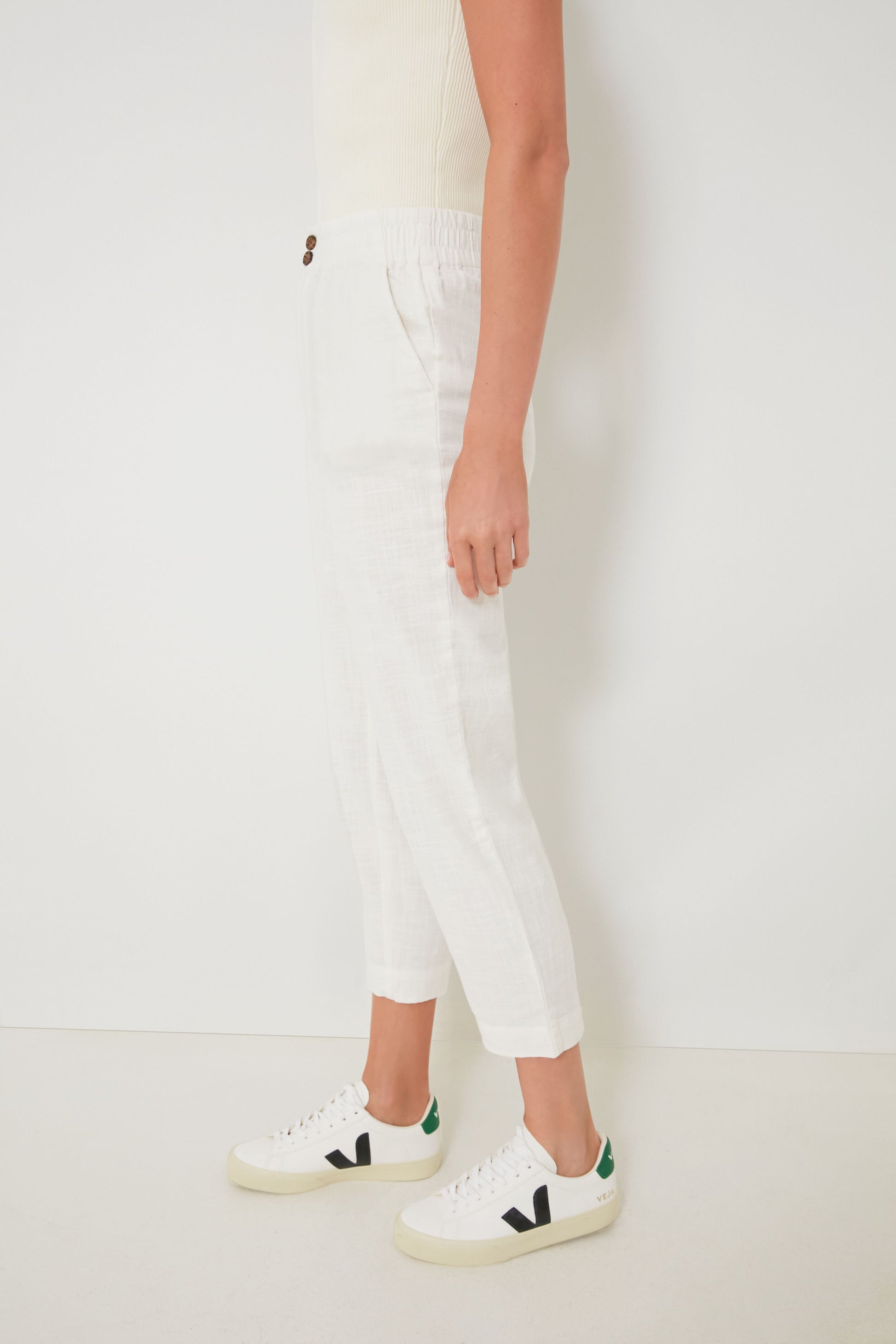 The White Pull-On Pants are the kind of bottoms that looks like breezy, relaxed trousers but feel like pajamas with ultimate comfort. In a bright yet neutral colorway, this style has a mid-rise with an elasticated waistband, a tapered fit through the legs, and is made from a stretch selvage fabric that moves with you and feels broken-in right off the bat. Pair with an easy tee, a sweater thrown over your shoulders, and a tote bag for a coastal-inspired look that is effortlessly chic.